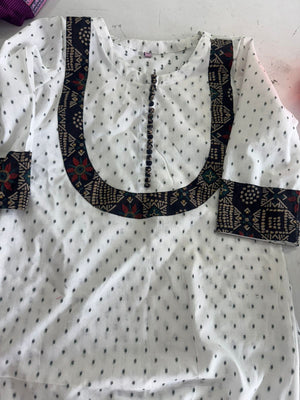 Handloom cotton kurti in white and black with lining attached , 3/4th sleeves,with V neckline which is perfect for office/college.