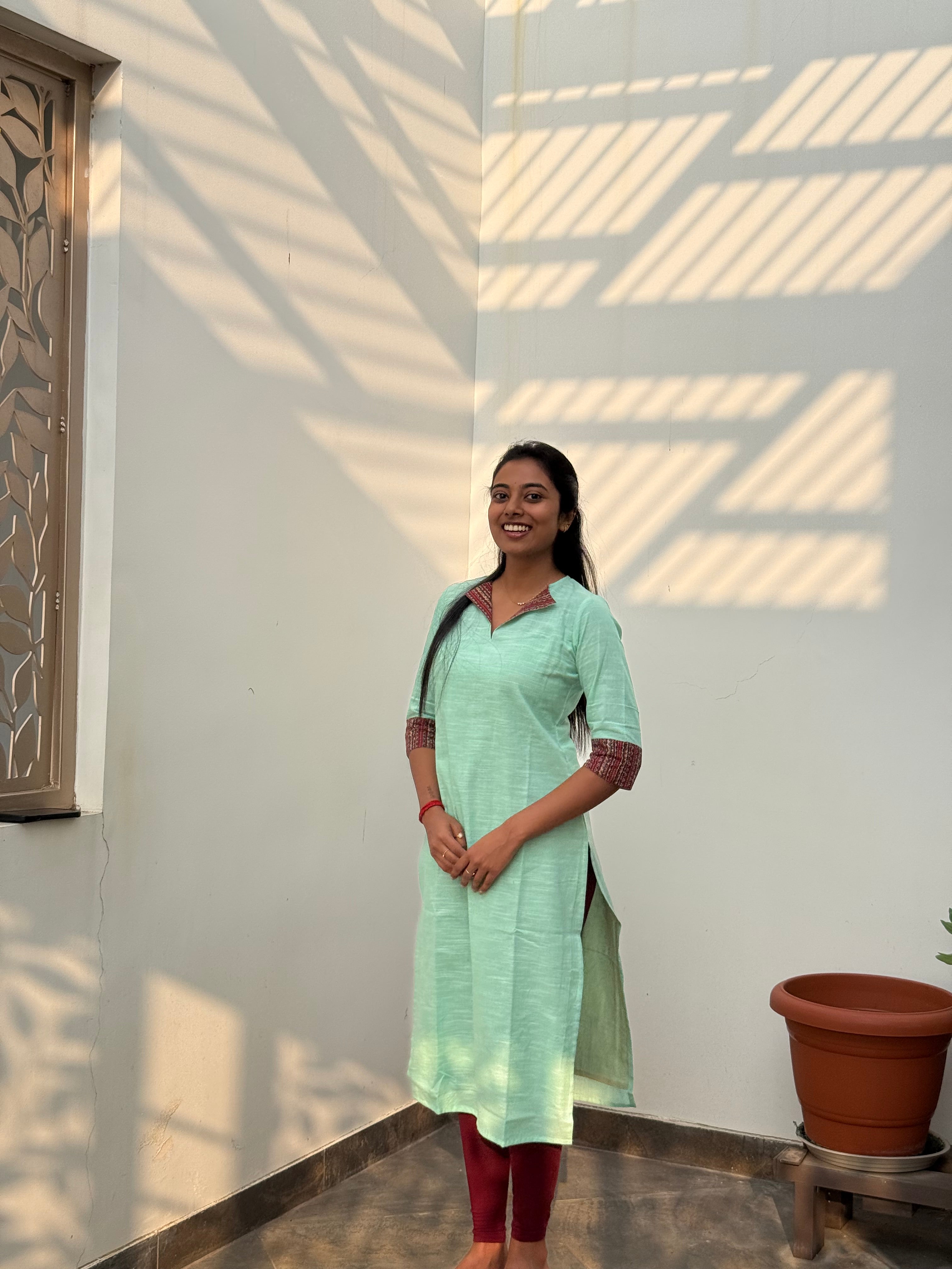 Handloom cotton kurti in light mint green with 3/4th sleeves,with V neckline which is perfect for office/college.