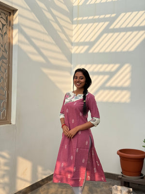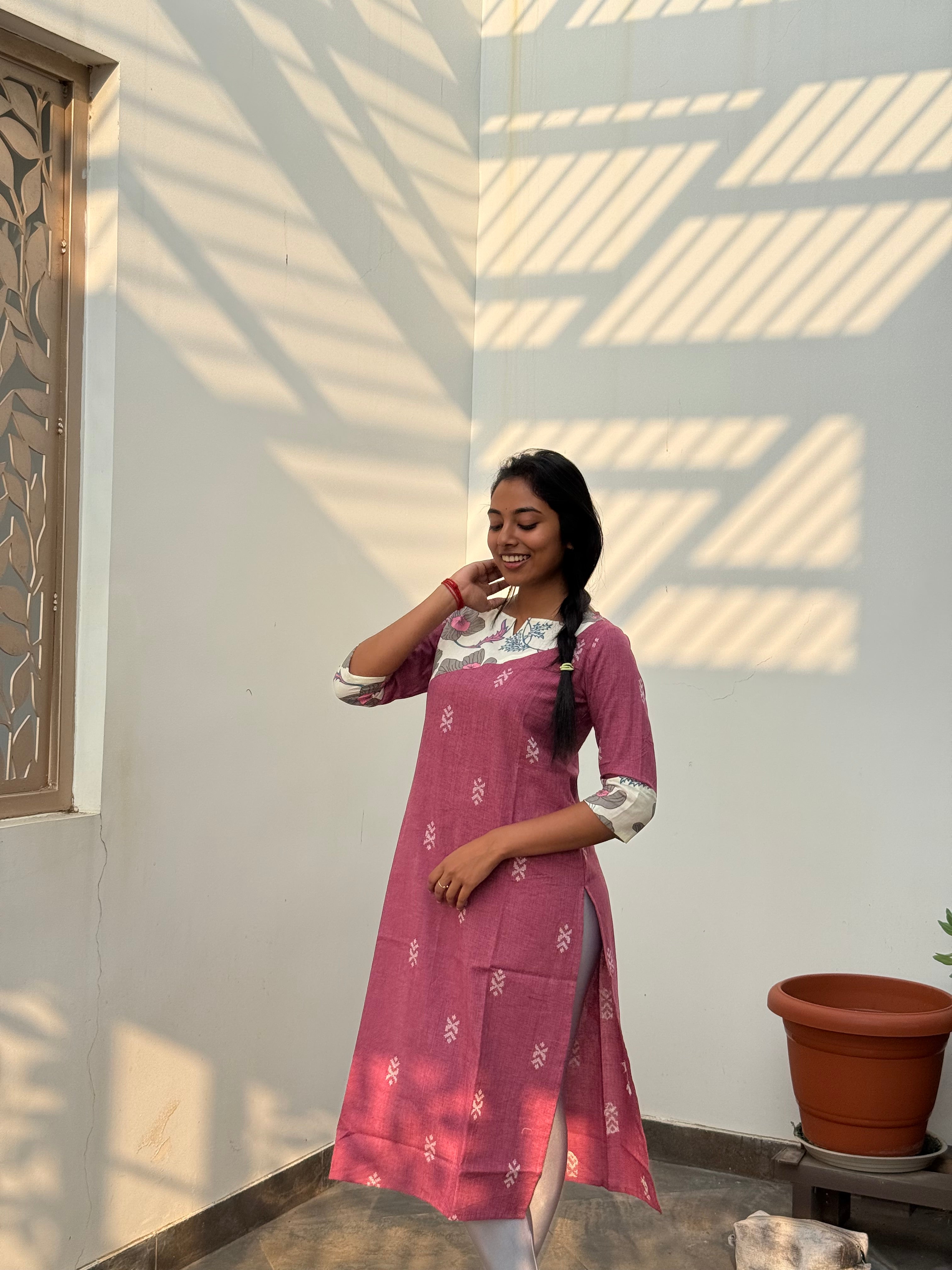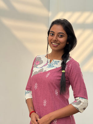 Pattern kurti 52- Handloom cotton kurti in pink & white
