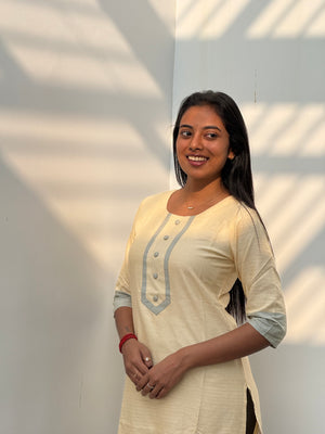 Handloom cotton kurti in pale yellow with 3/4th sleeves,with round neckline which is perfect for office/college.