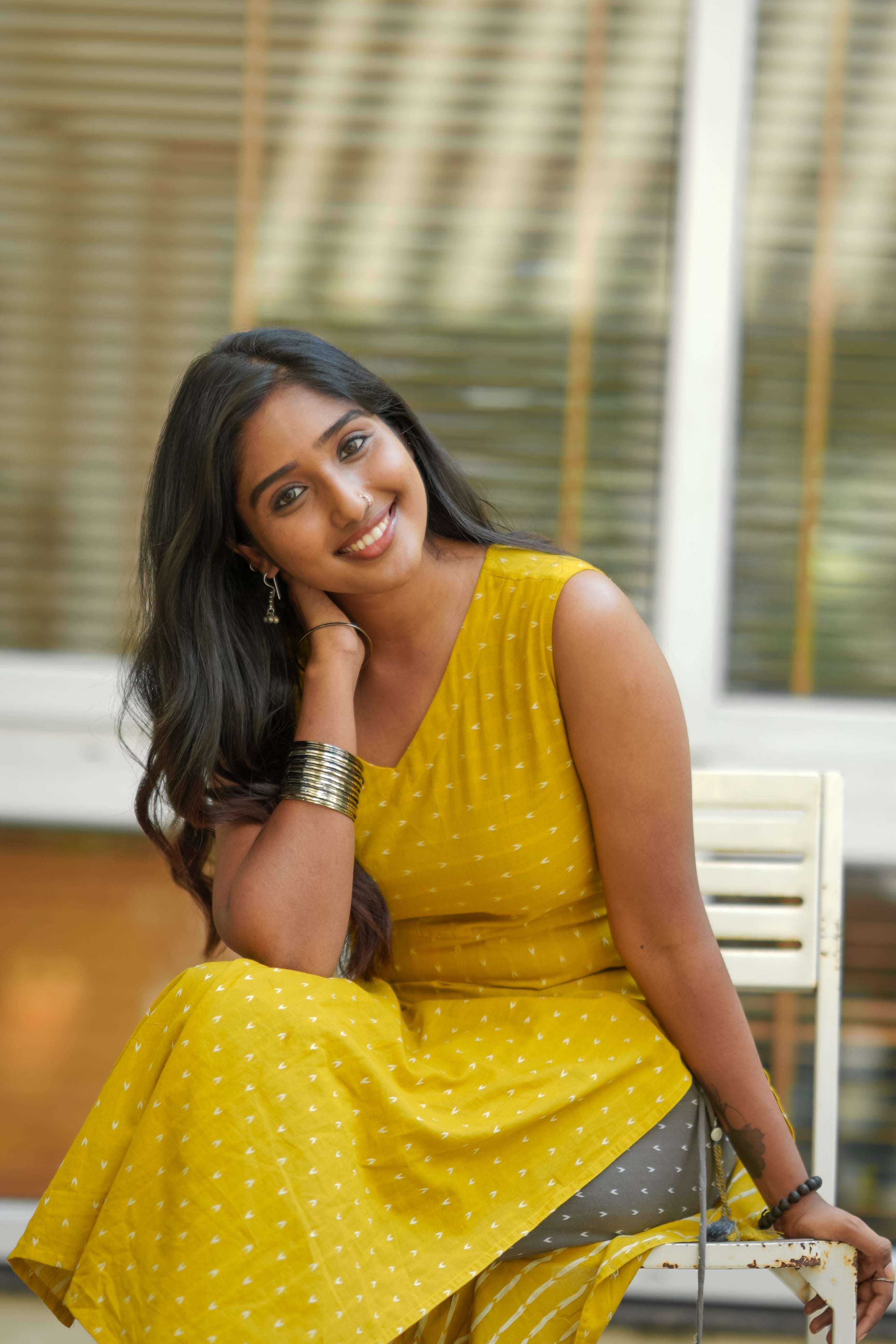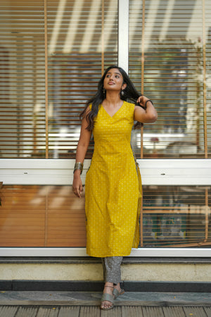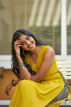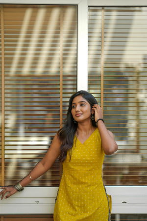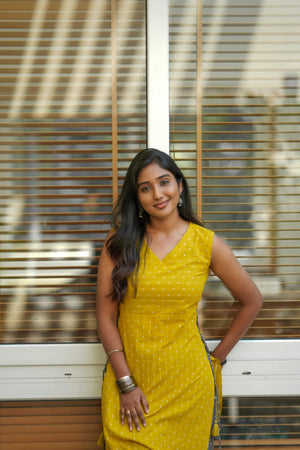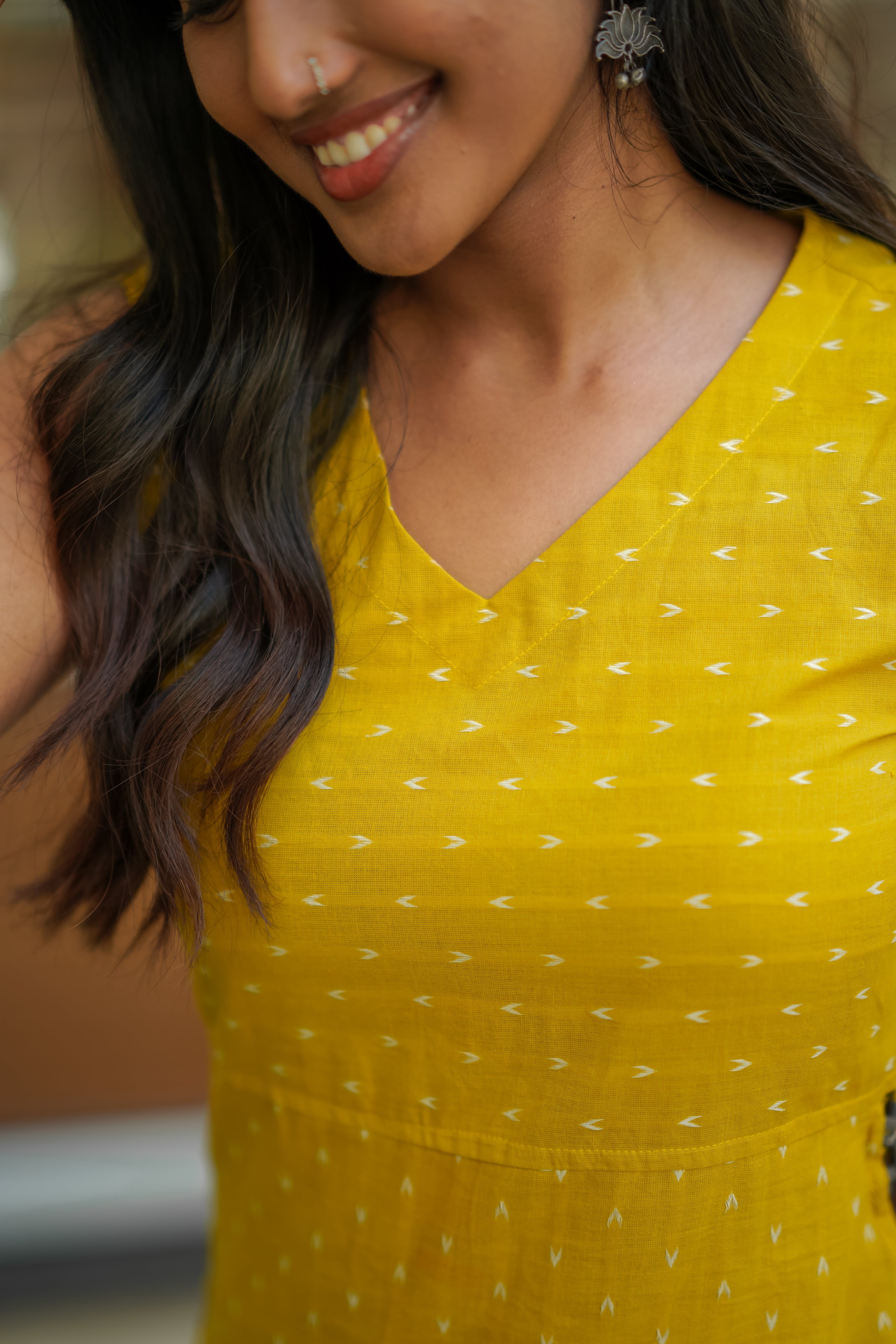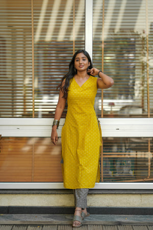 Poorva coords (Yellow grey combo) - Handloom cotton kurta set with handoven buttas and fancy tassels in yellow and grey