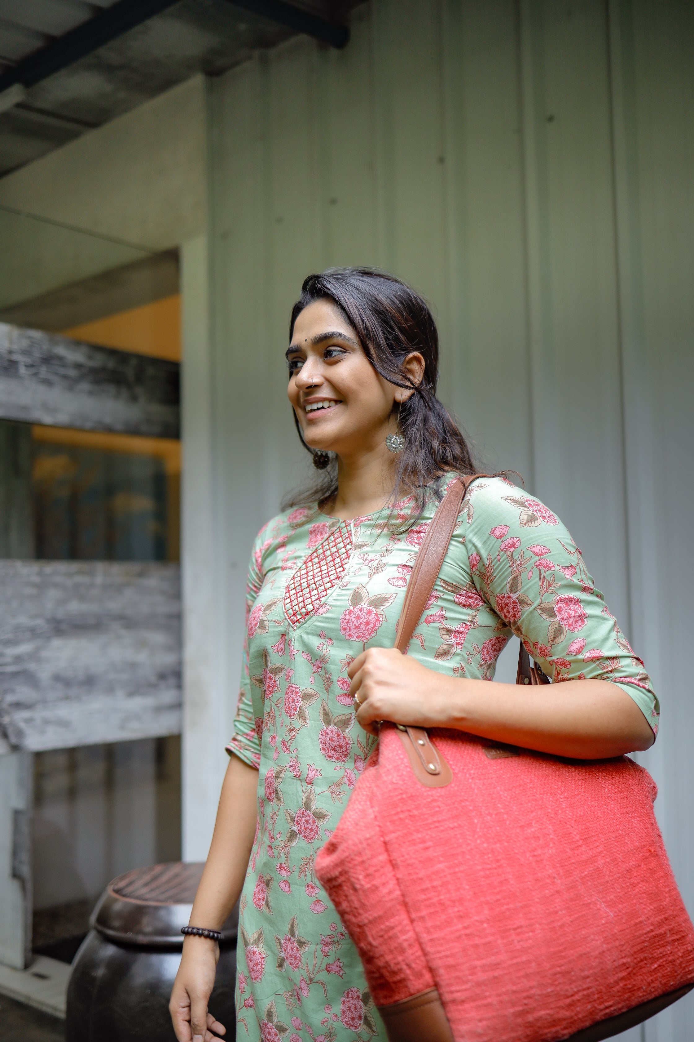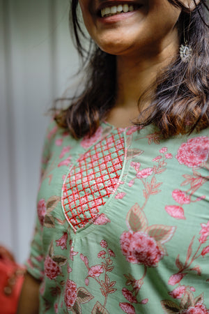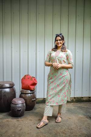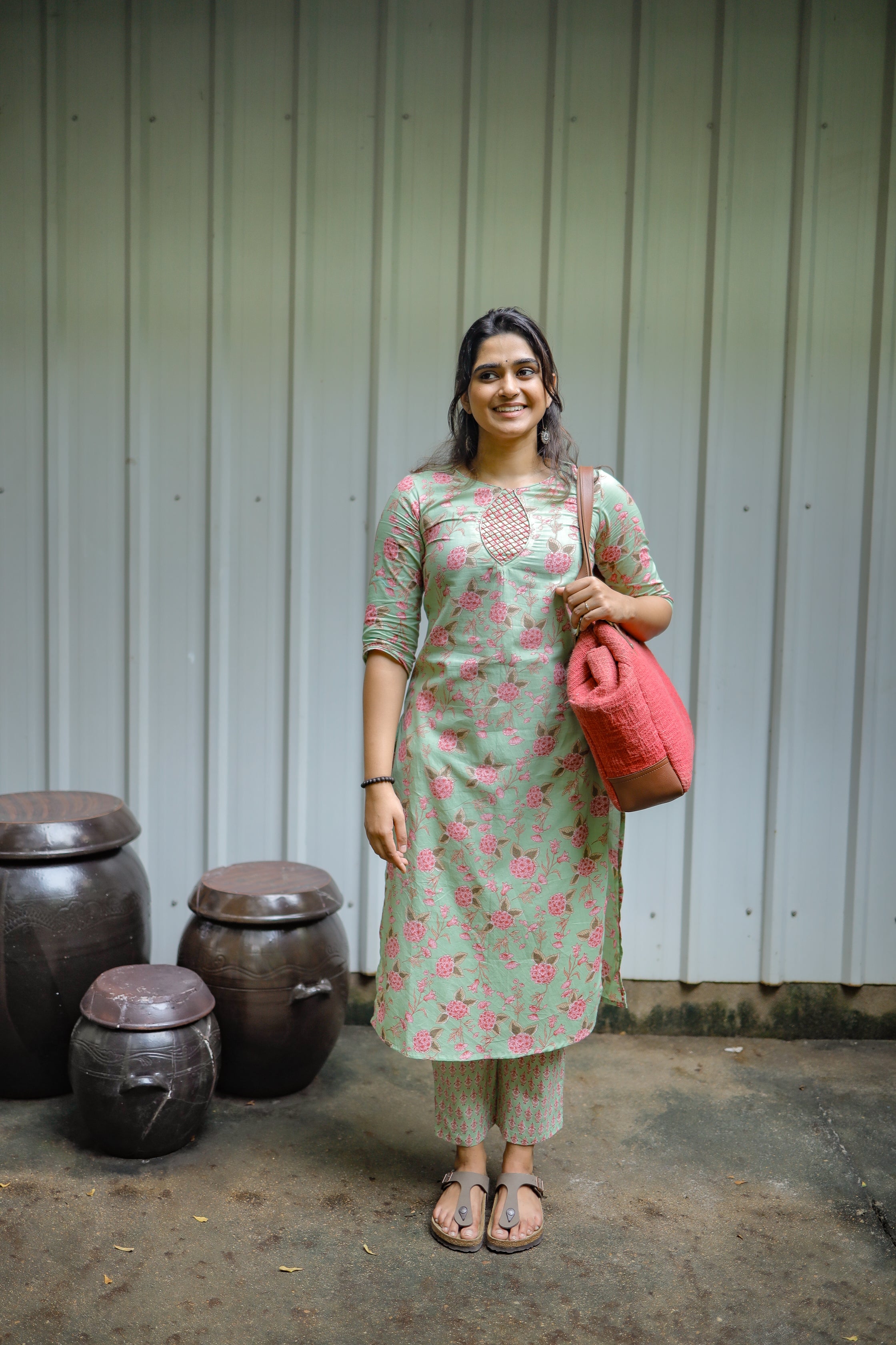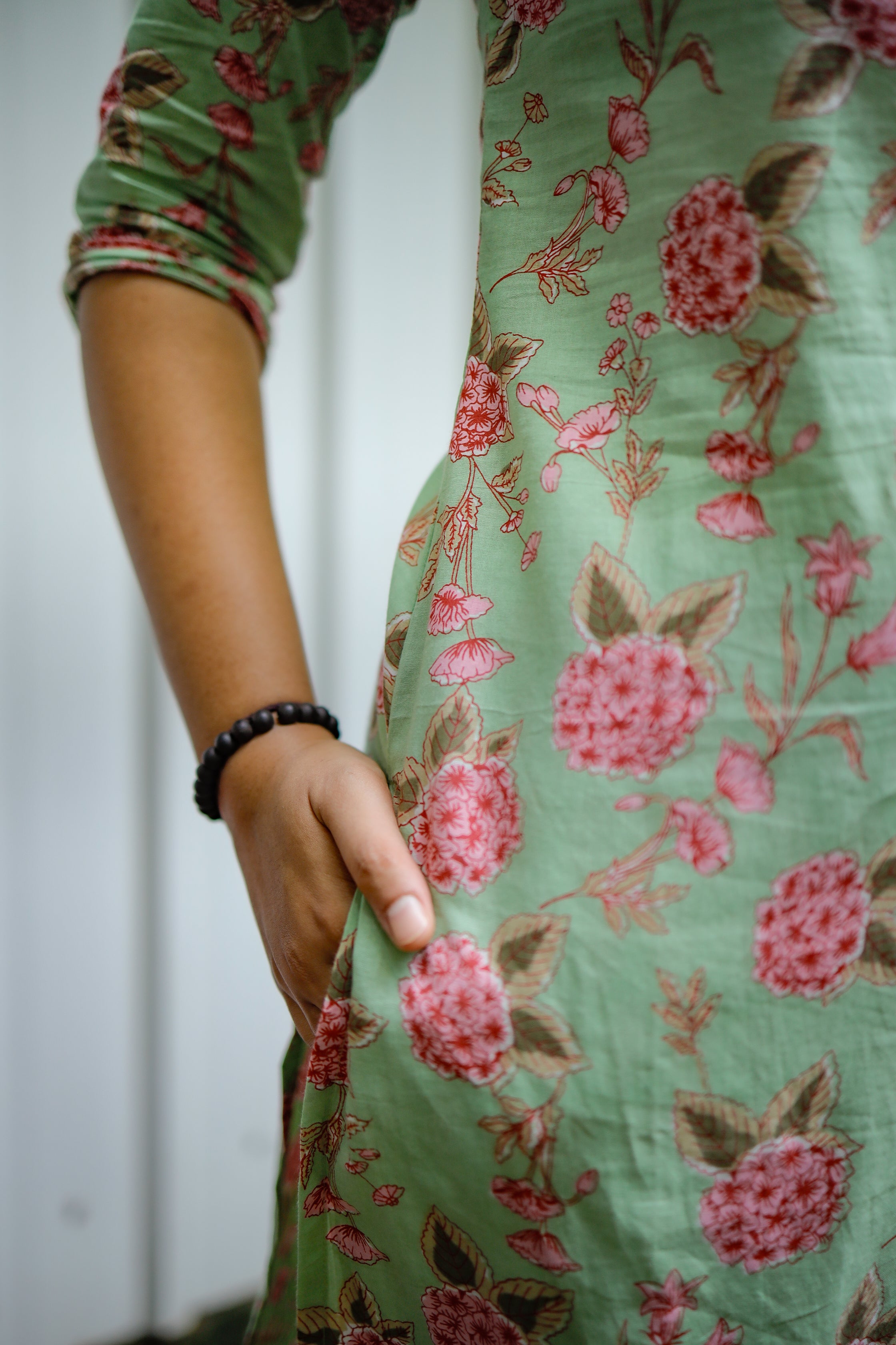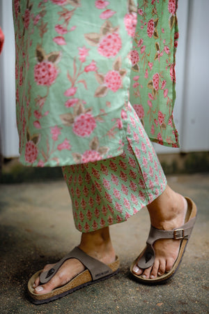 Prachi - floral handblock printed cotton kurta set in green and pink
