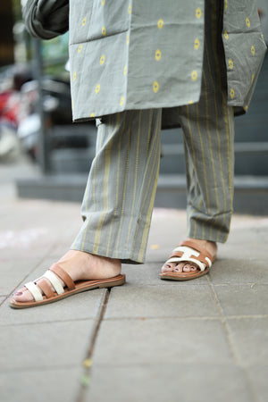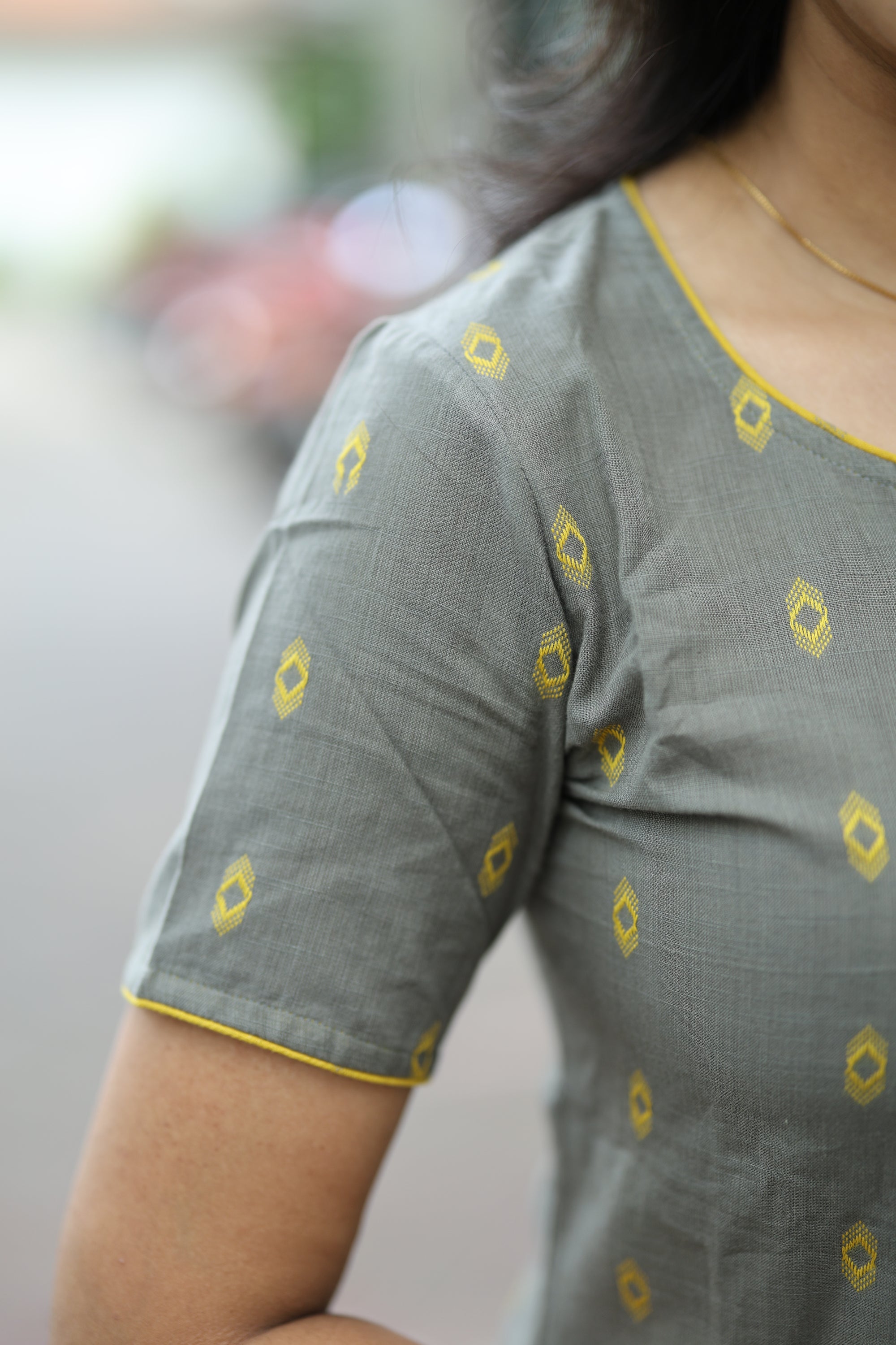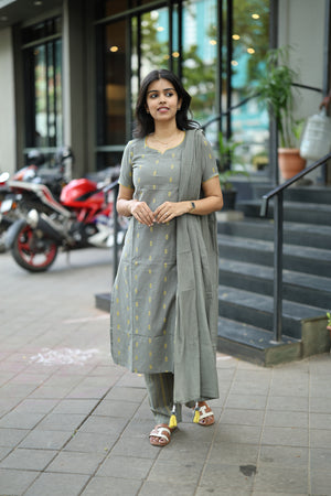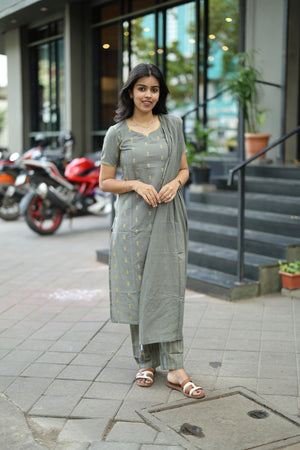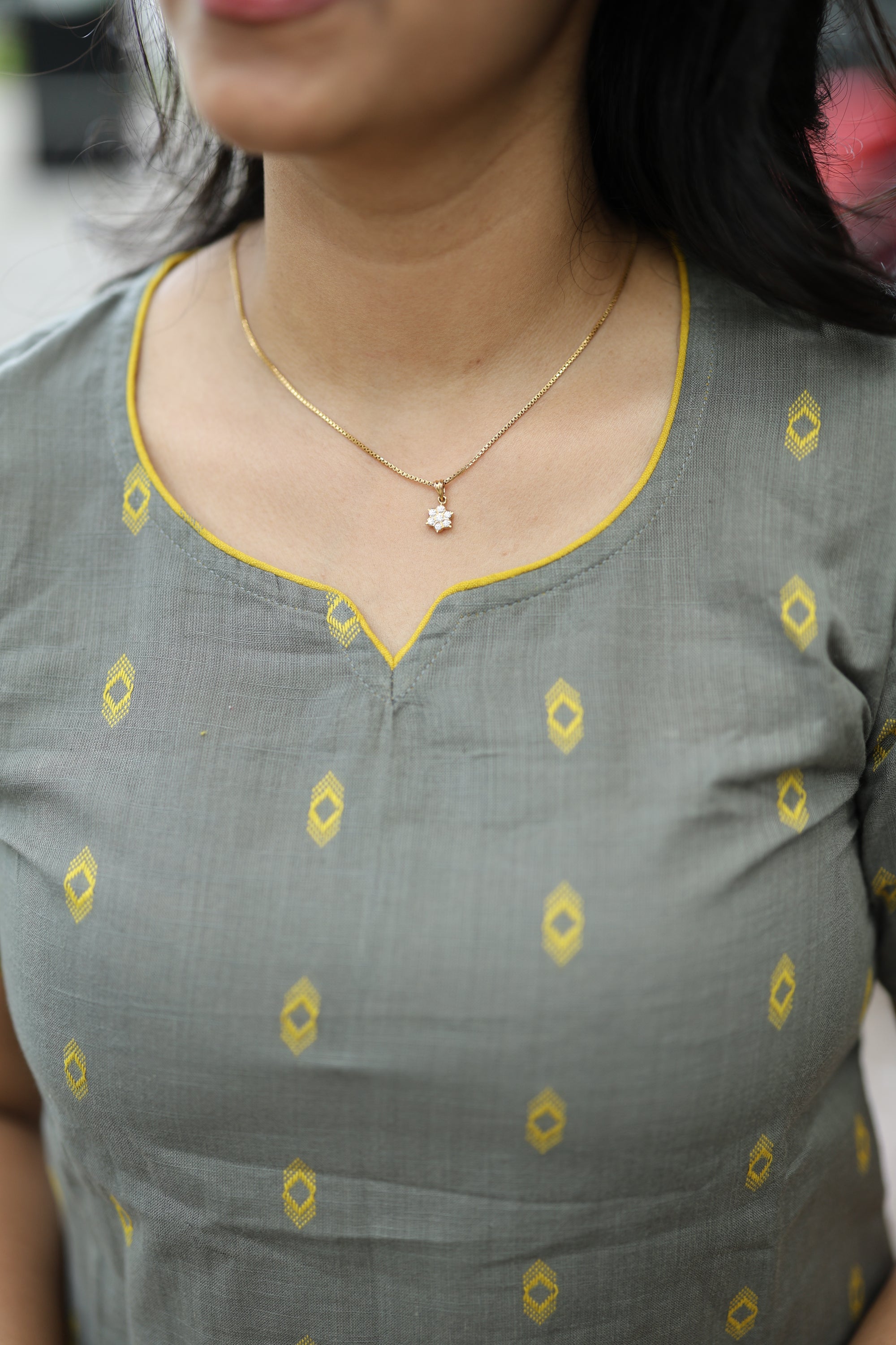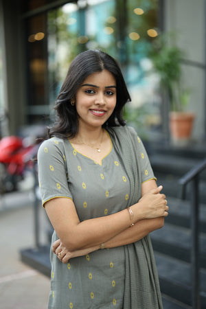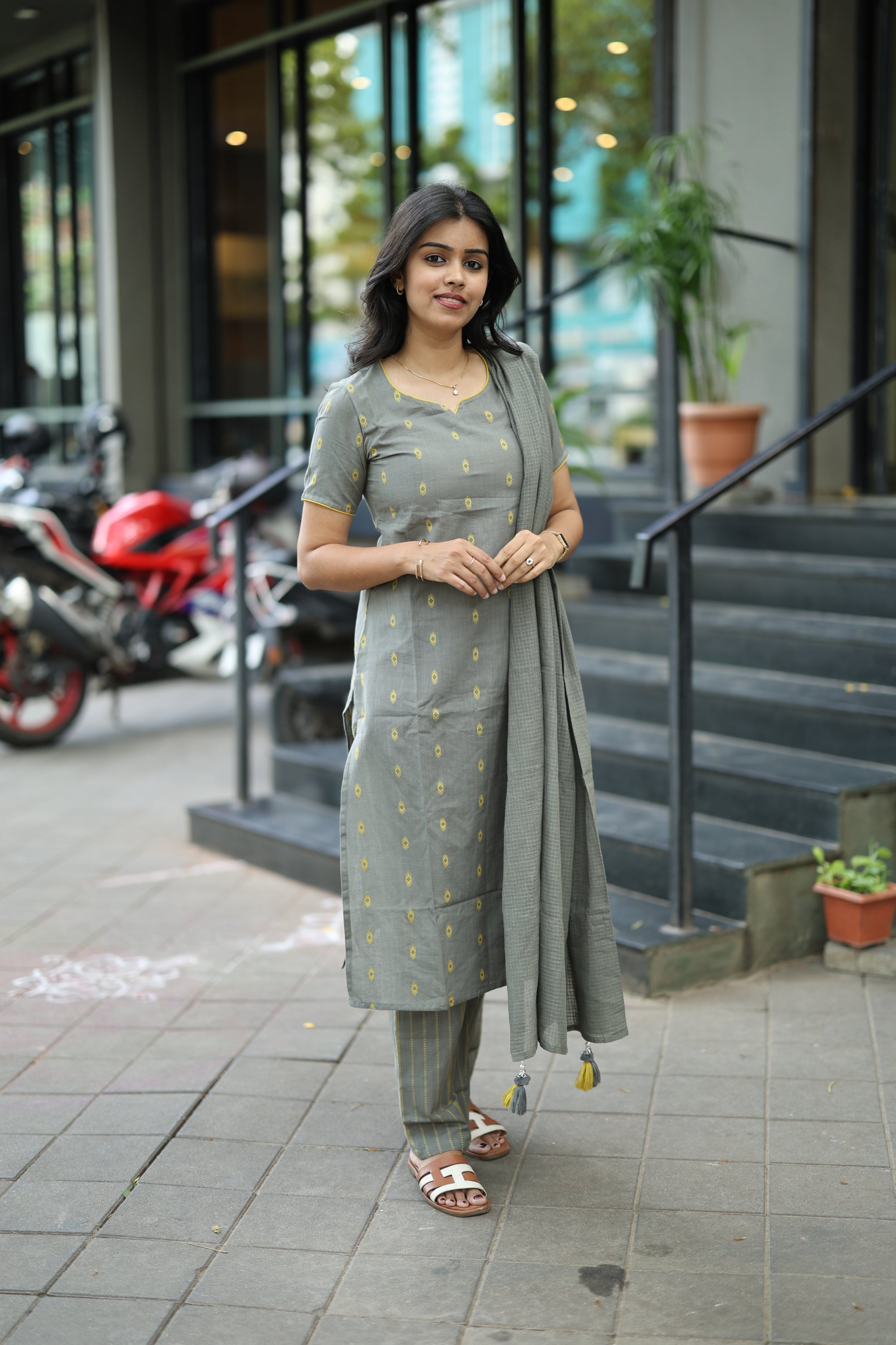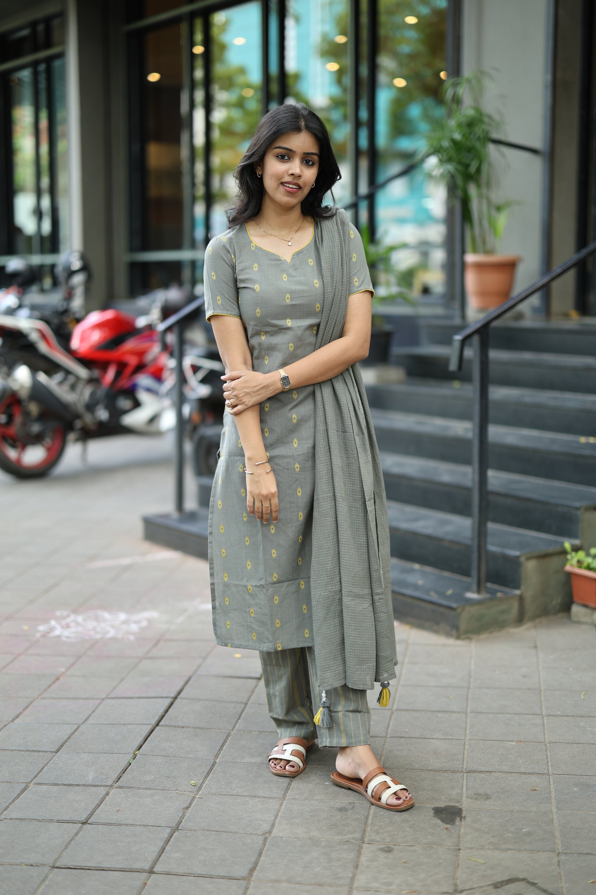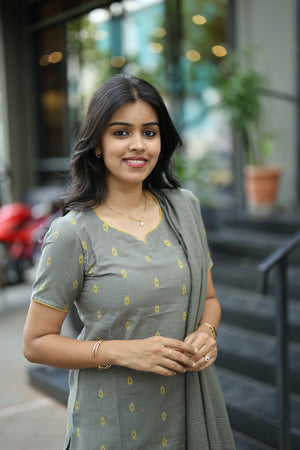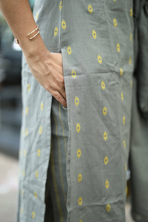 Beautiful organic handloom cotton 3 pc set with a beautiful neckline and short sleeves and matching trousers with functional pockets too. Matching pure kota dupatta with handmade tassels for the dangle.