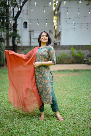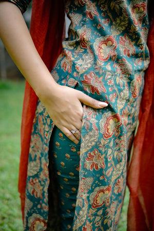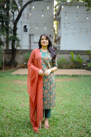 Prakalya - floral handblock printed cotton suit set in green and rust red