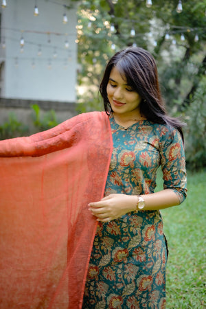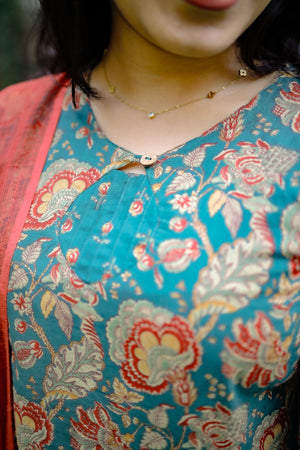 鈥� Floral hand block printed cotton with a pintuck neck detailing with a keyhole, smart sleeves and functional pockets on trousers with rust red kota doria dupatta.
