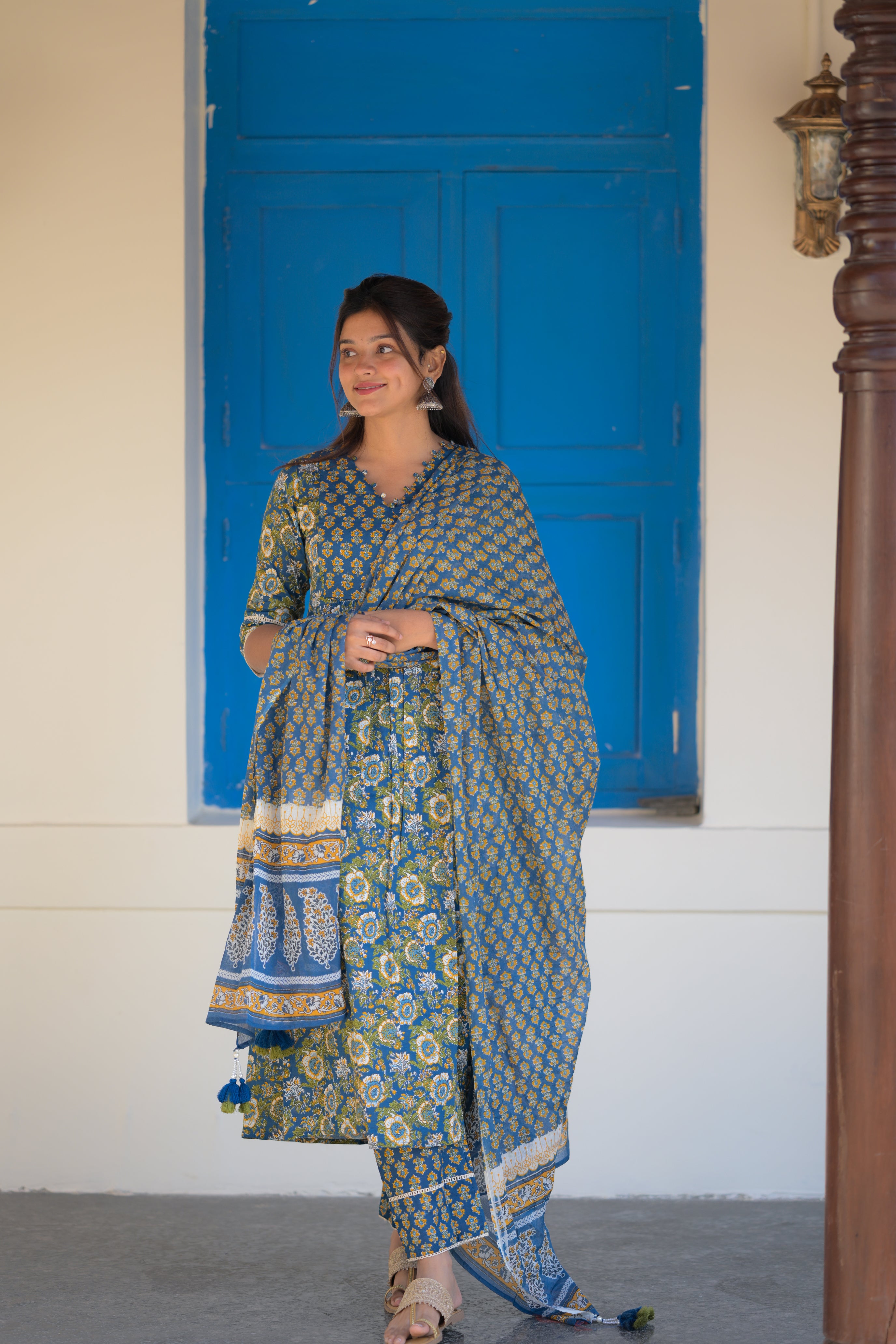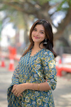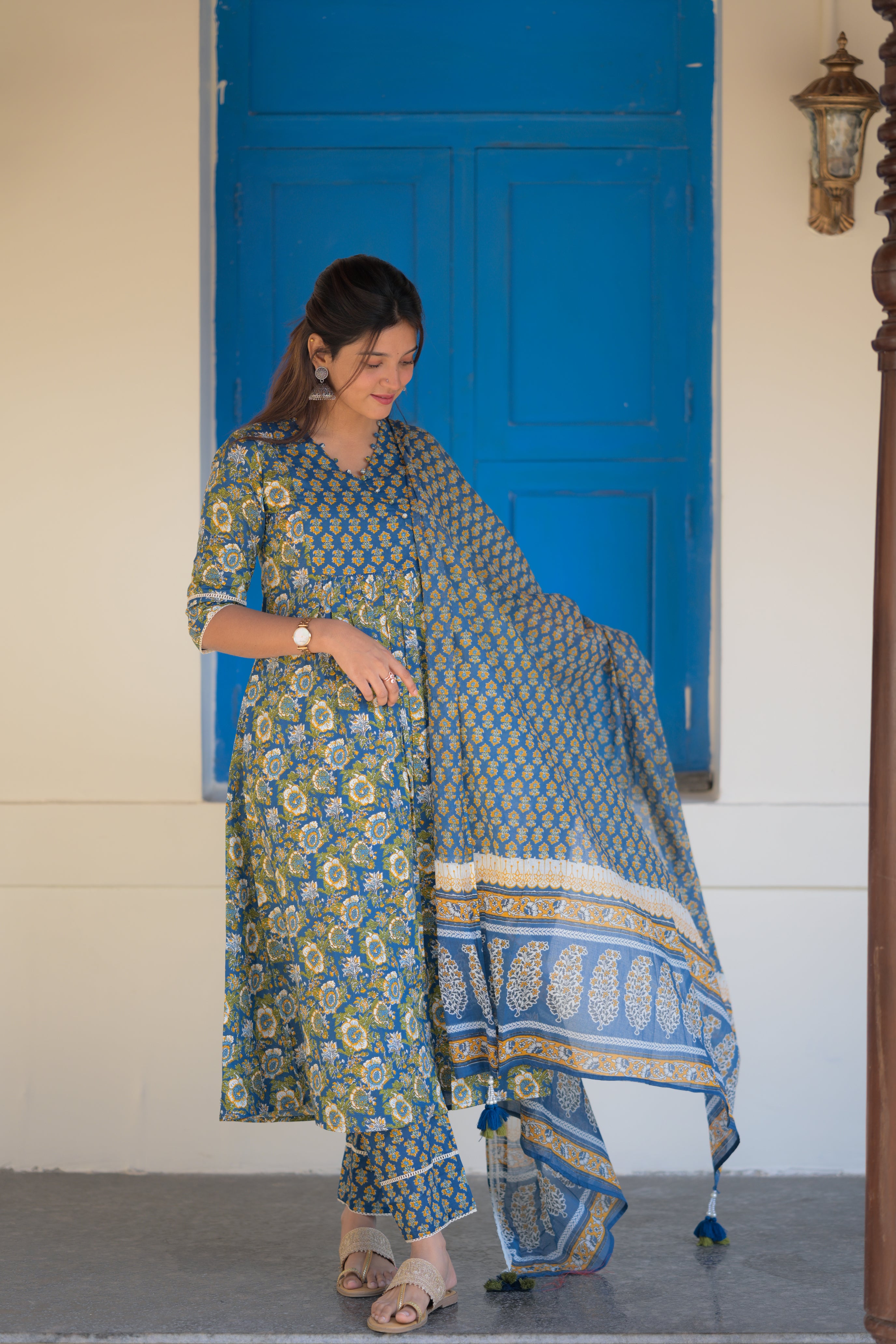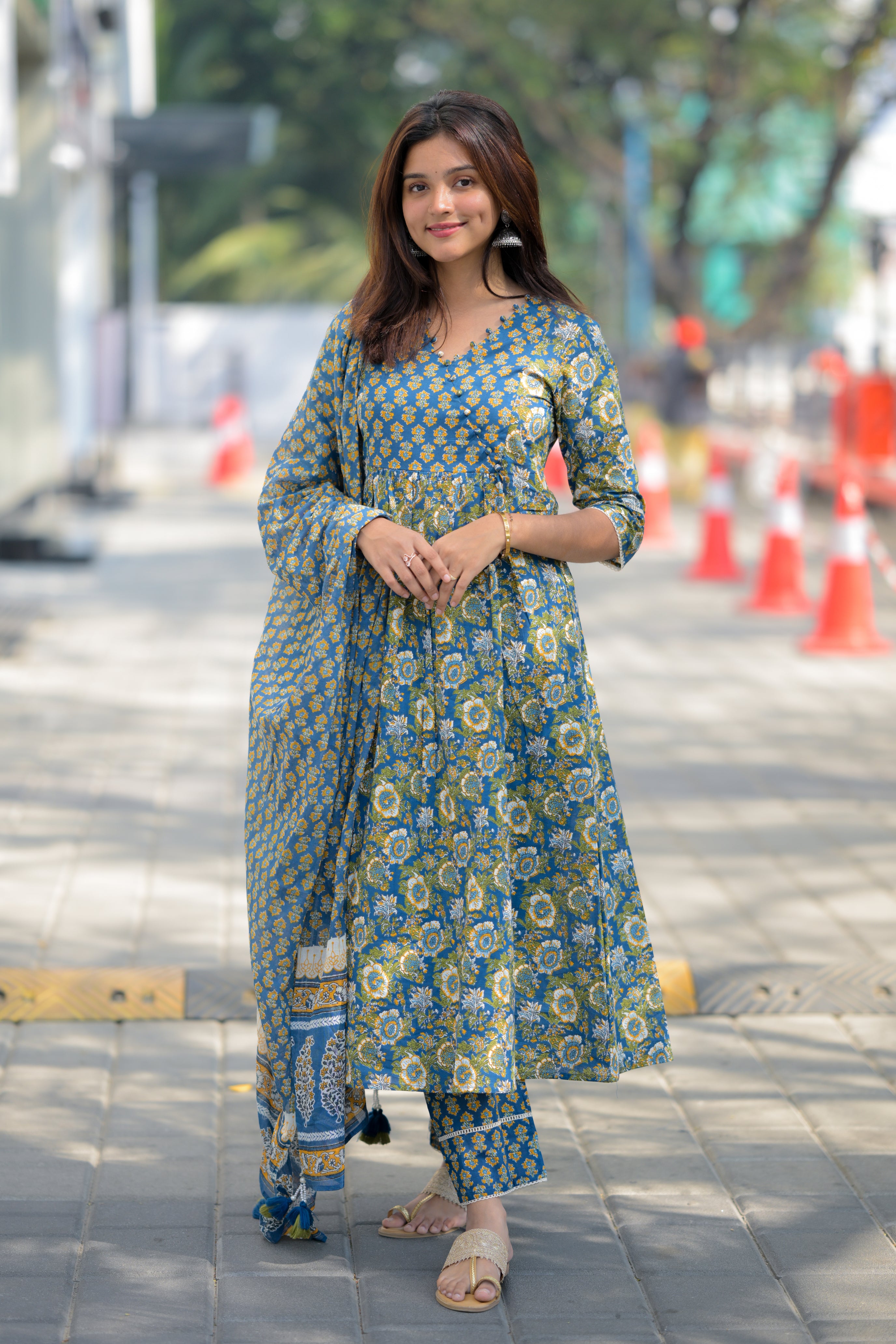 — Floral handblock printed anarkali suit set with smart sleeves and neckline, matching trousers and matching dupatta with tassels.