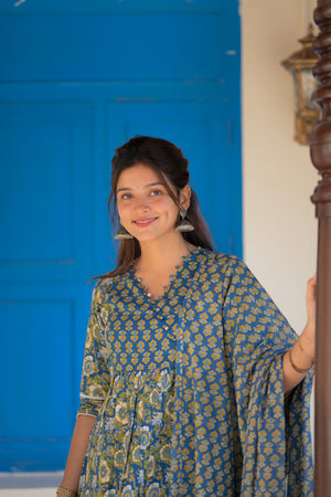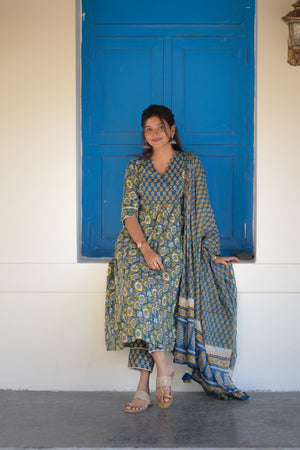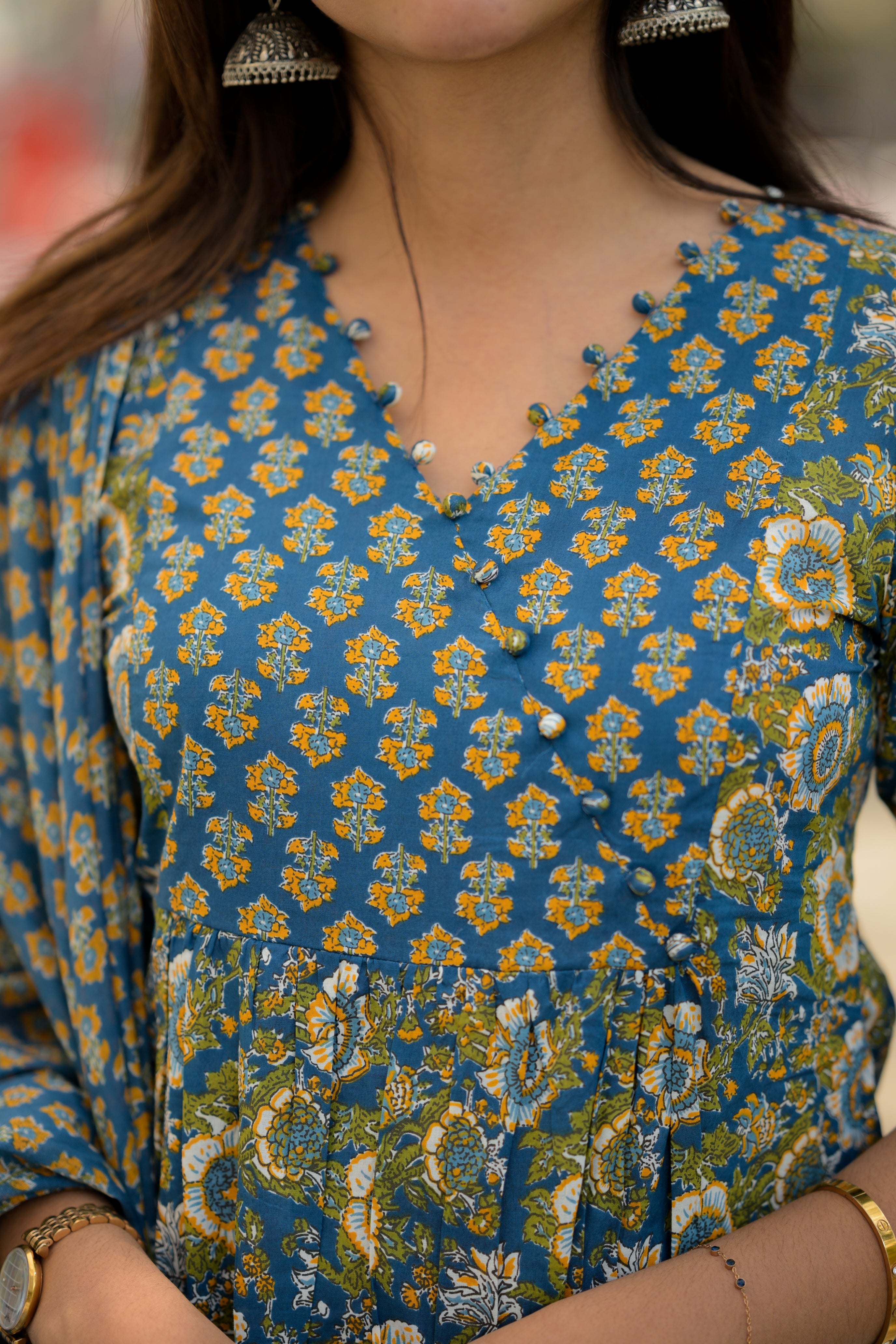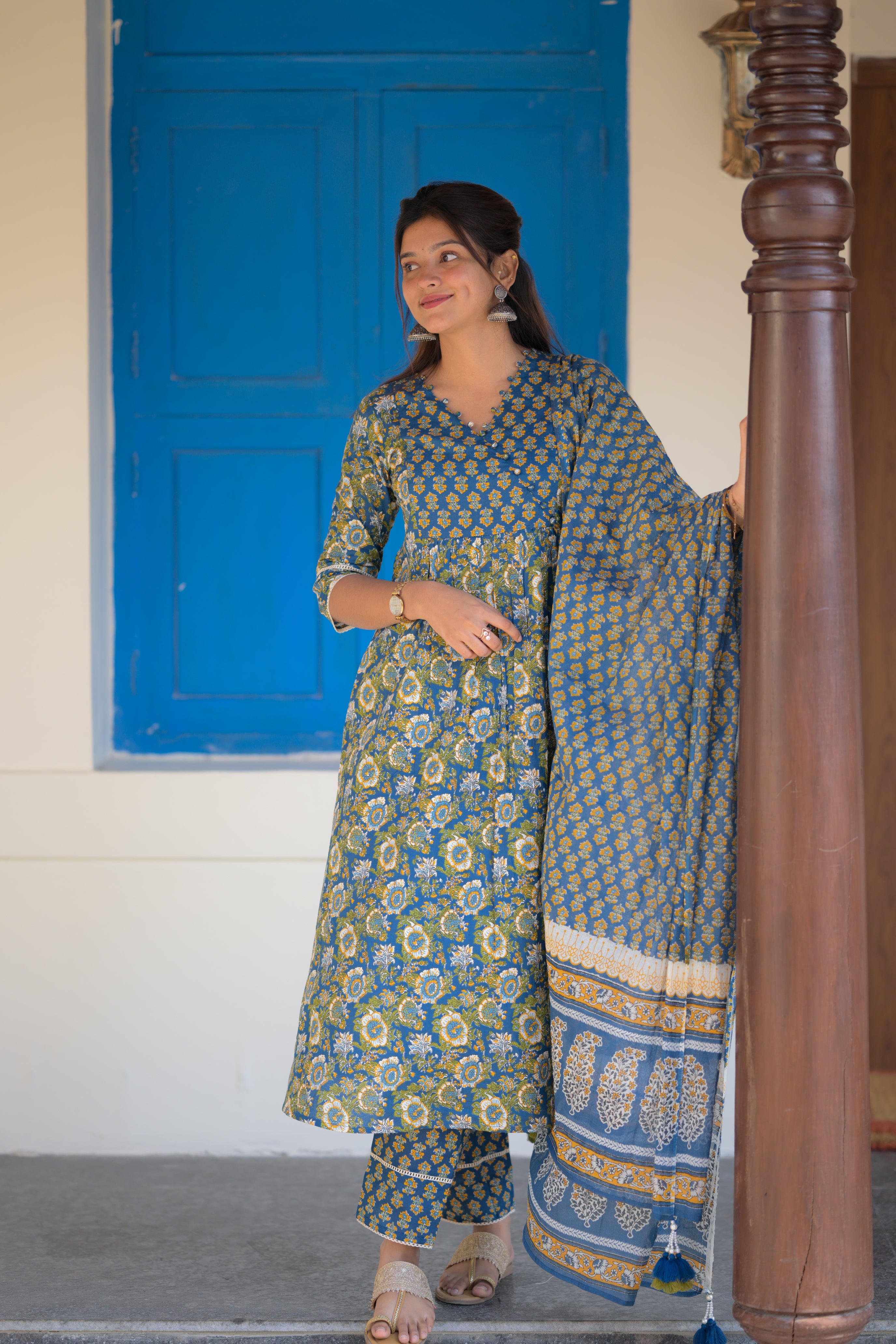 — Floral handblock printed anarkali suit set with smart sleeves and neckline, matching trousers and matching dupatta with tassels.
