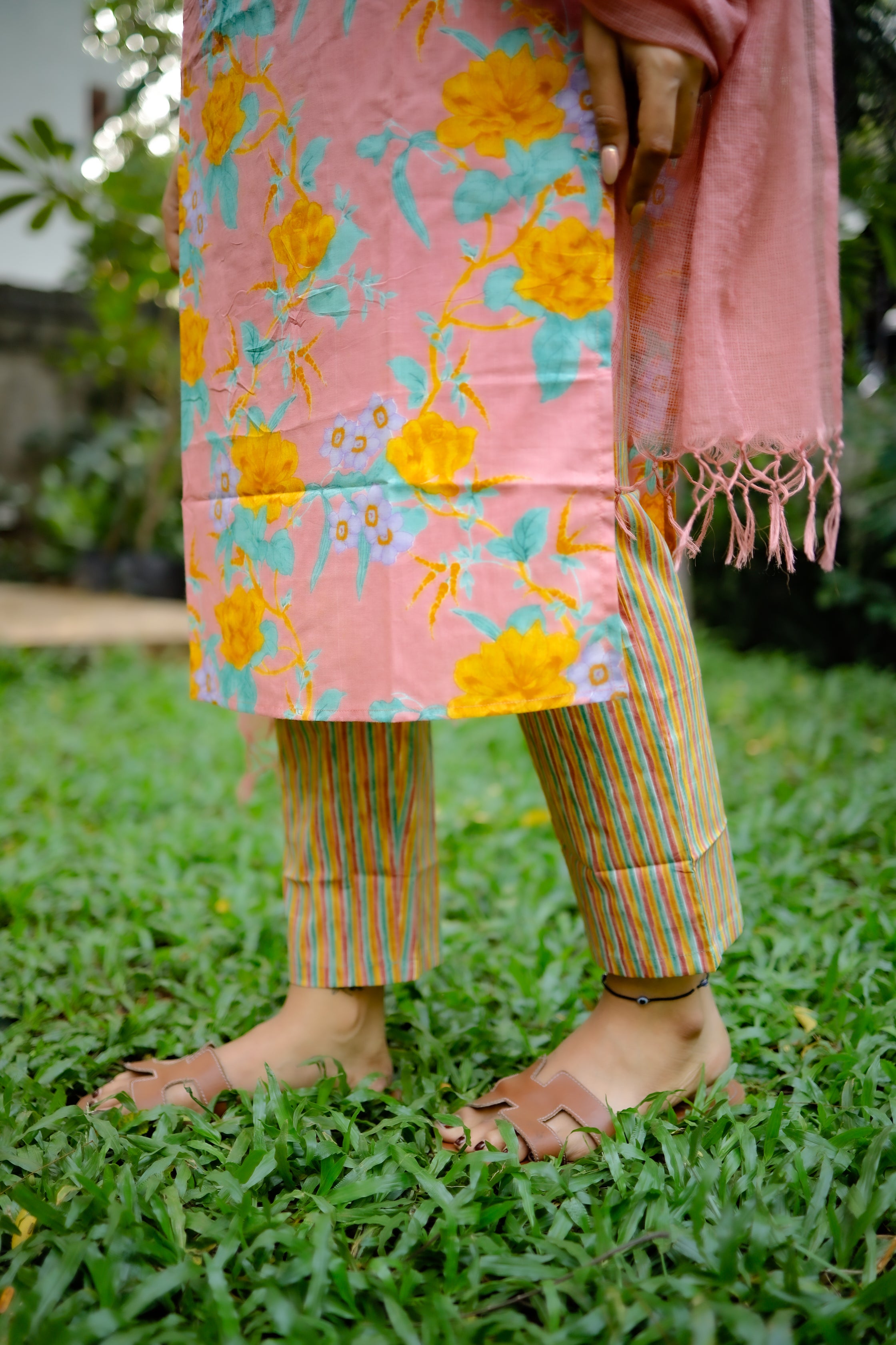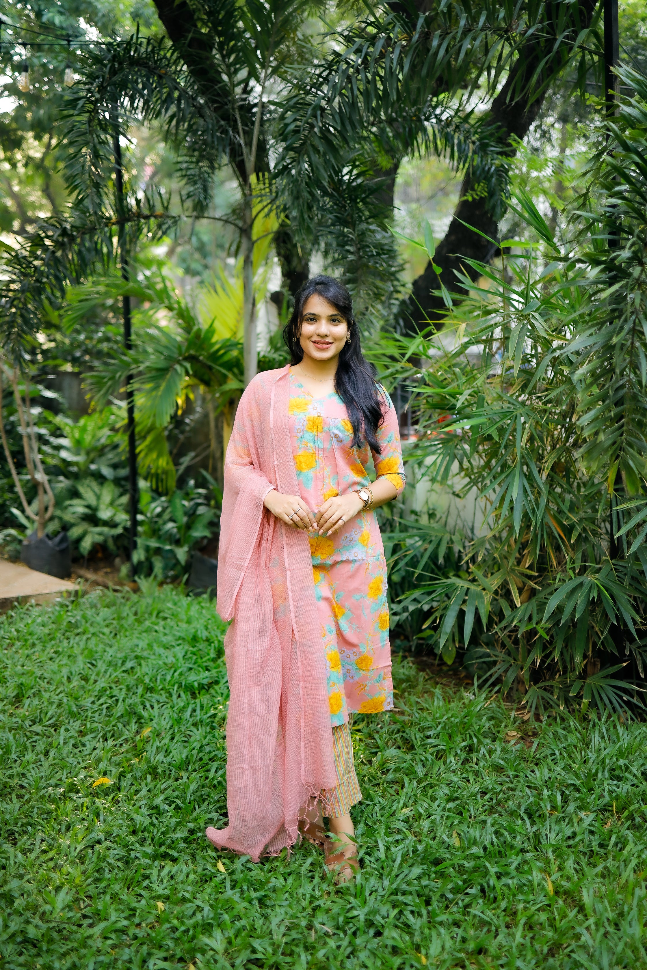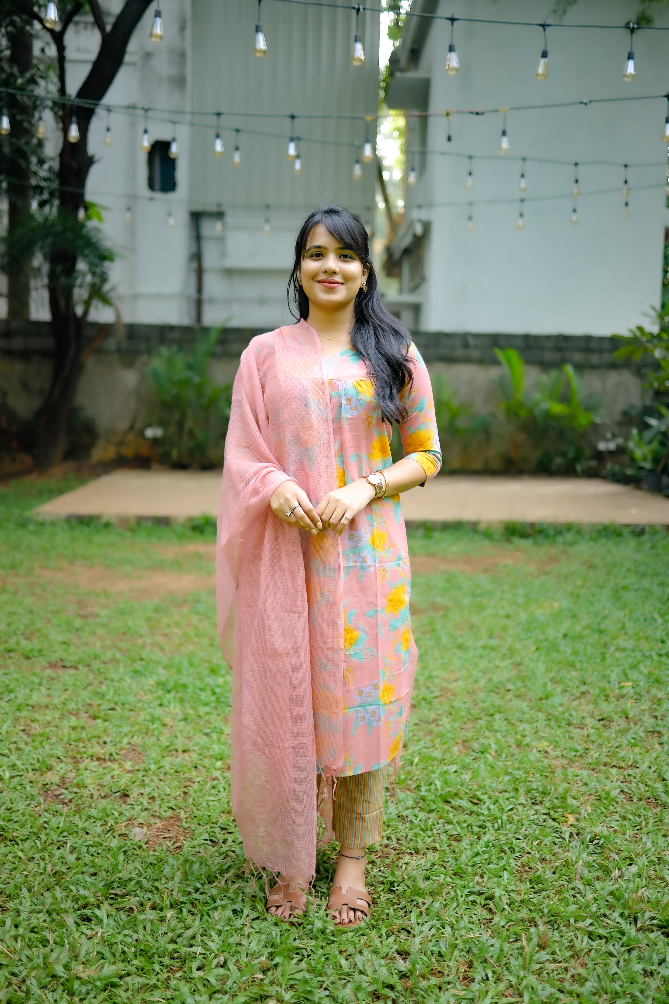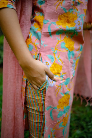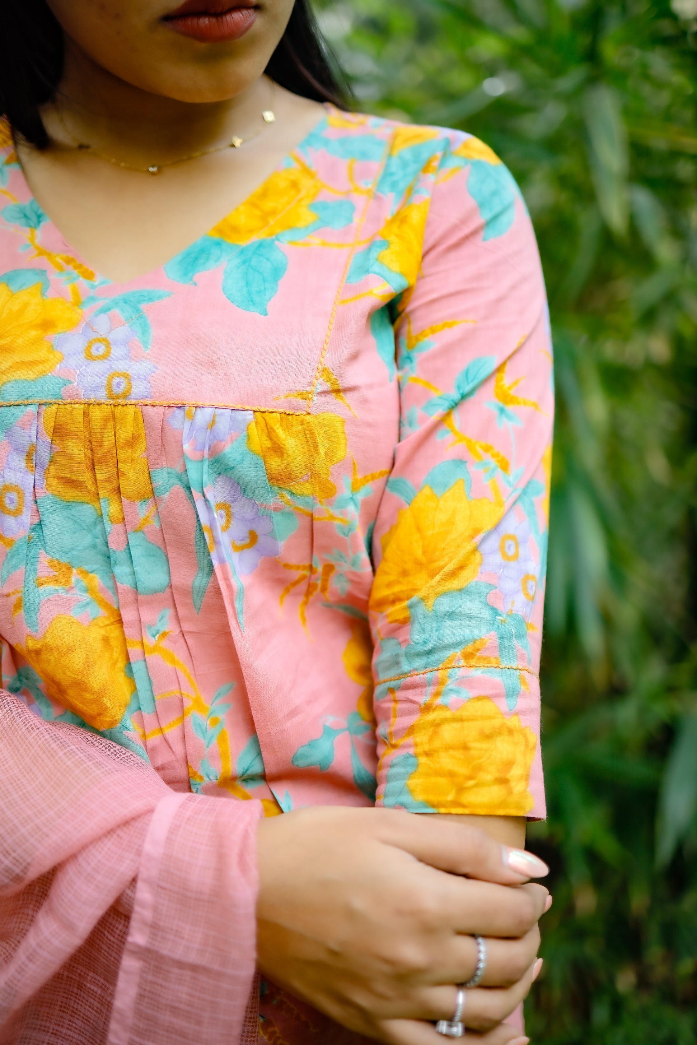 Floral handblock printed cotton suit set with kota doria dupatta in pink colour. Smart neckline with 15 inch sleeves and trousers with functional pockets. Comes with matching kota doria dupatta. Perfect office / college wear.