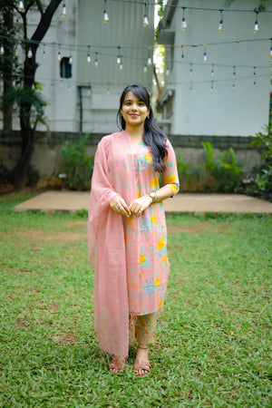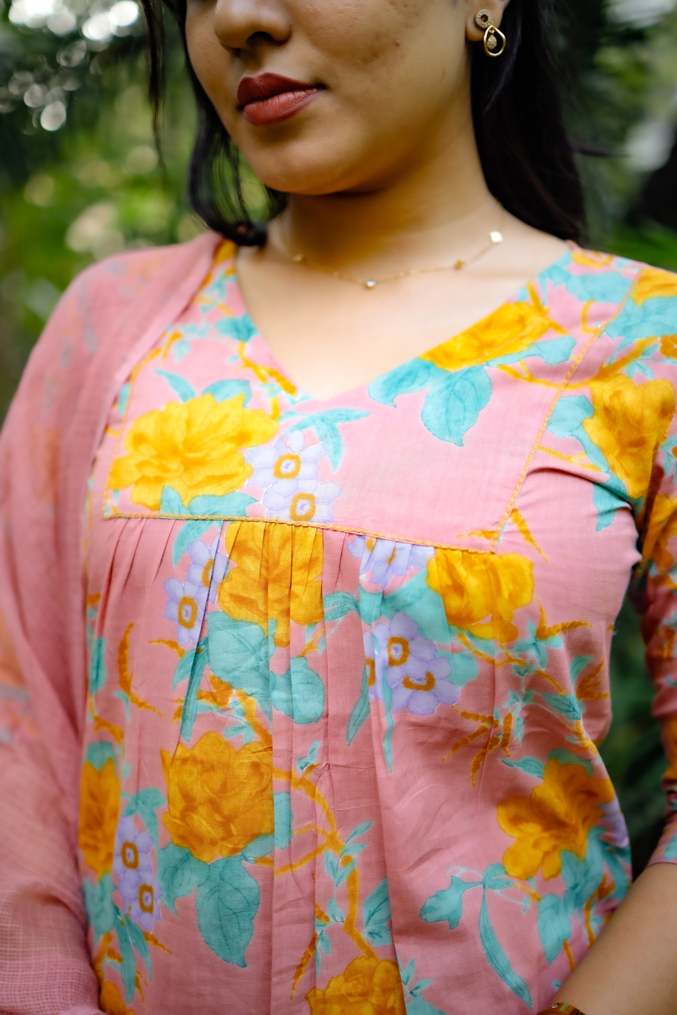 Prijitha - floral hand block printed cotton suit set with kota doria dupatta in pink colour
