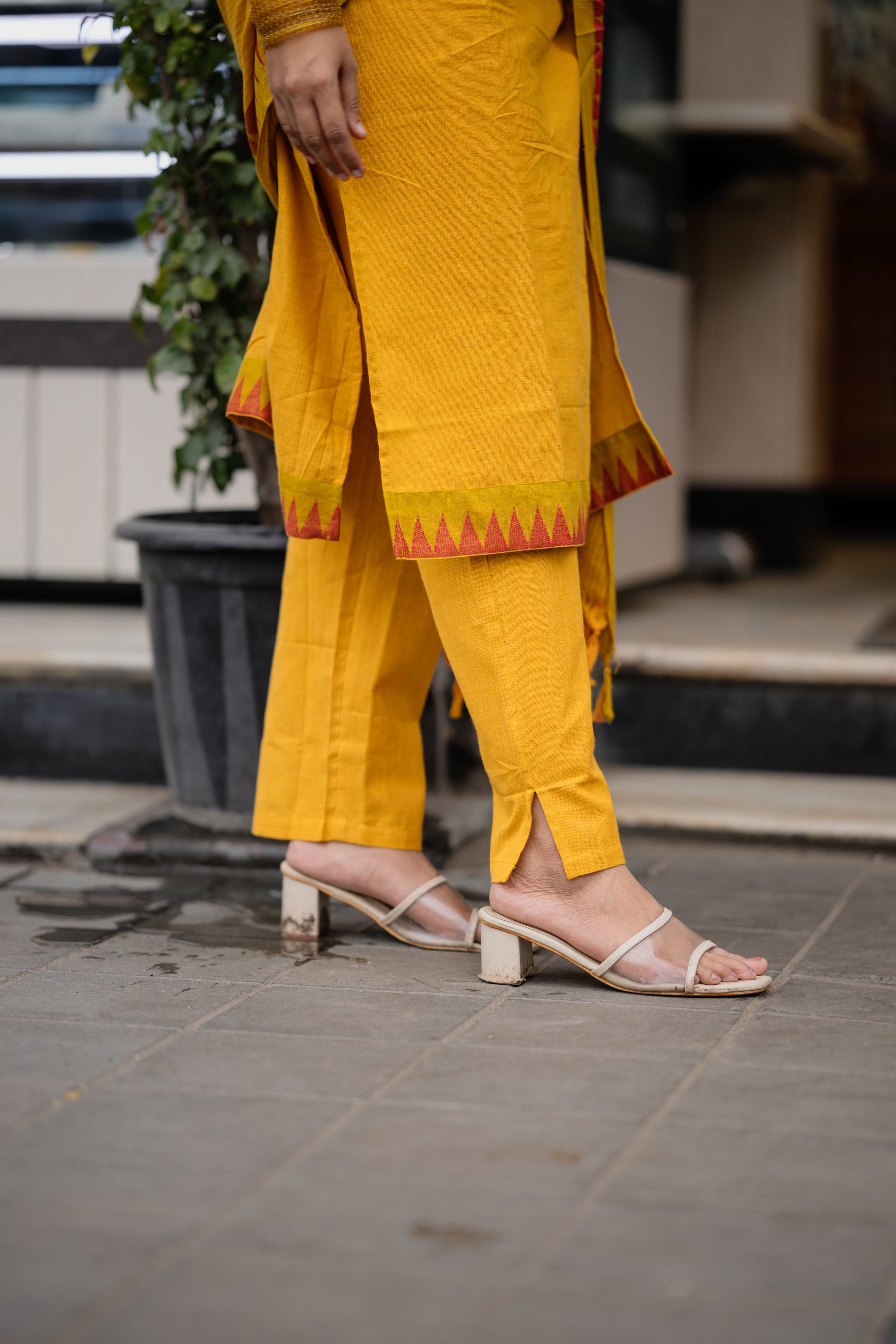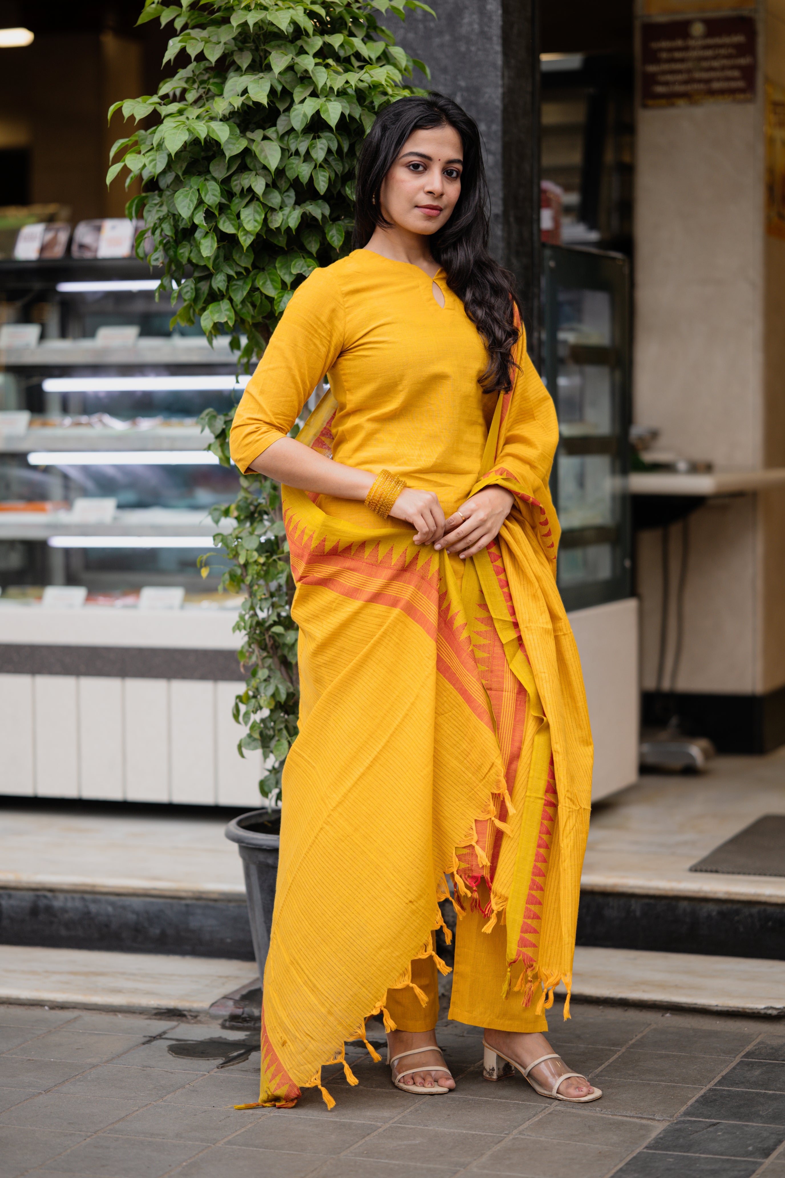 Rithisha - handloom cotton suit set with temple border in yellow colour