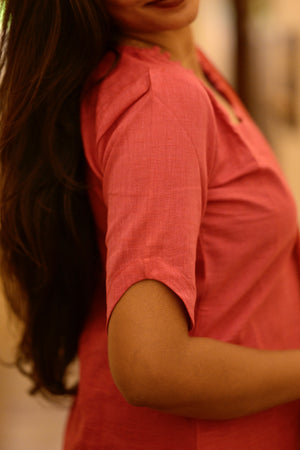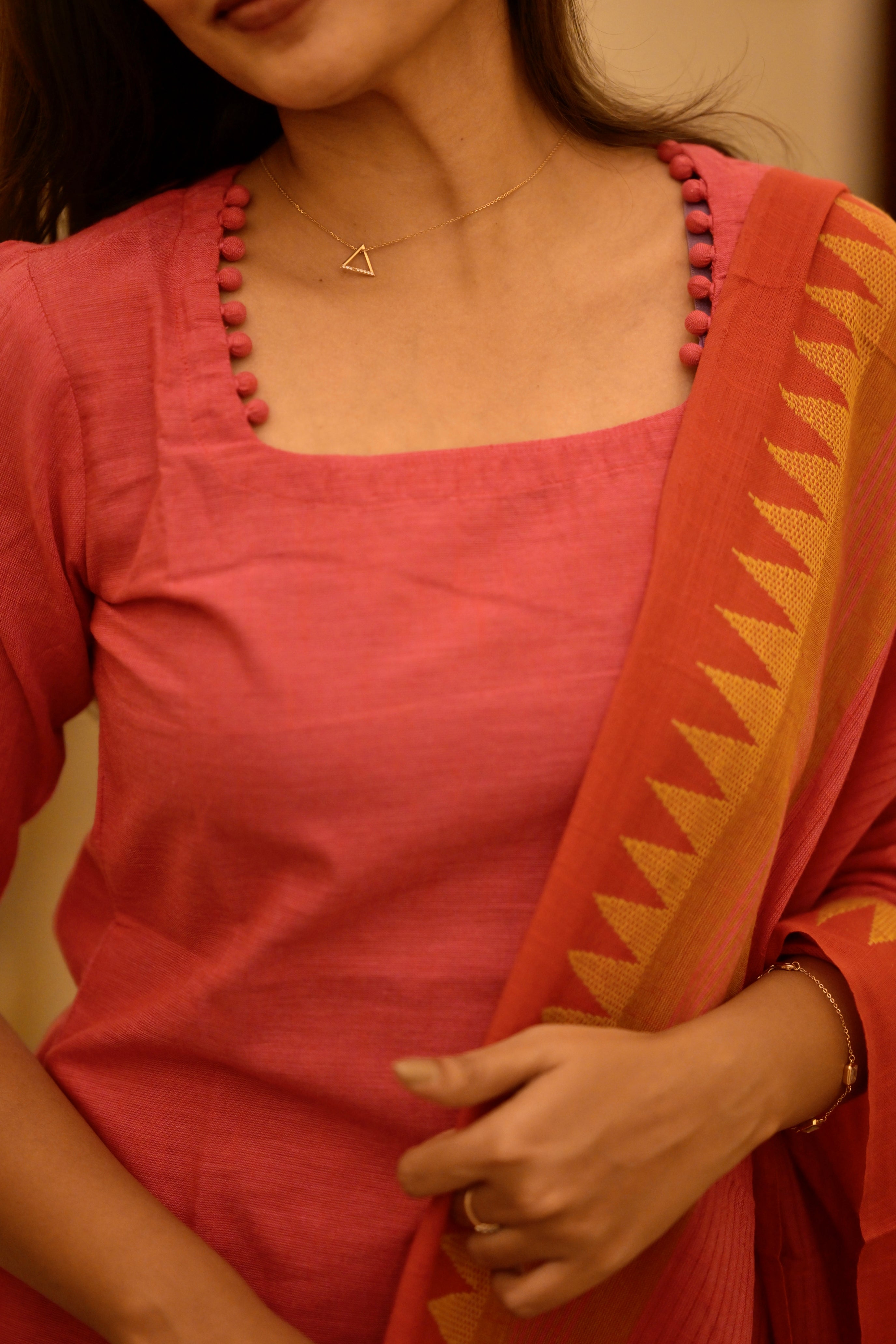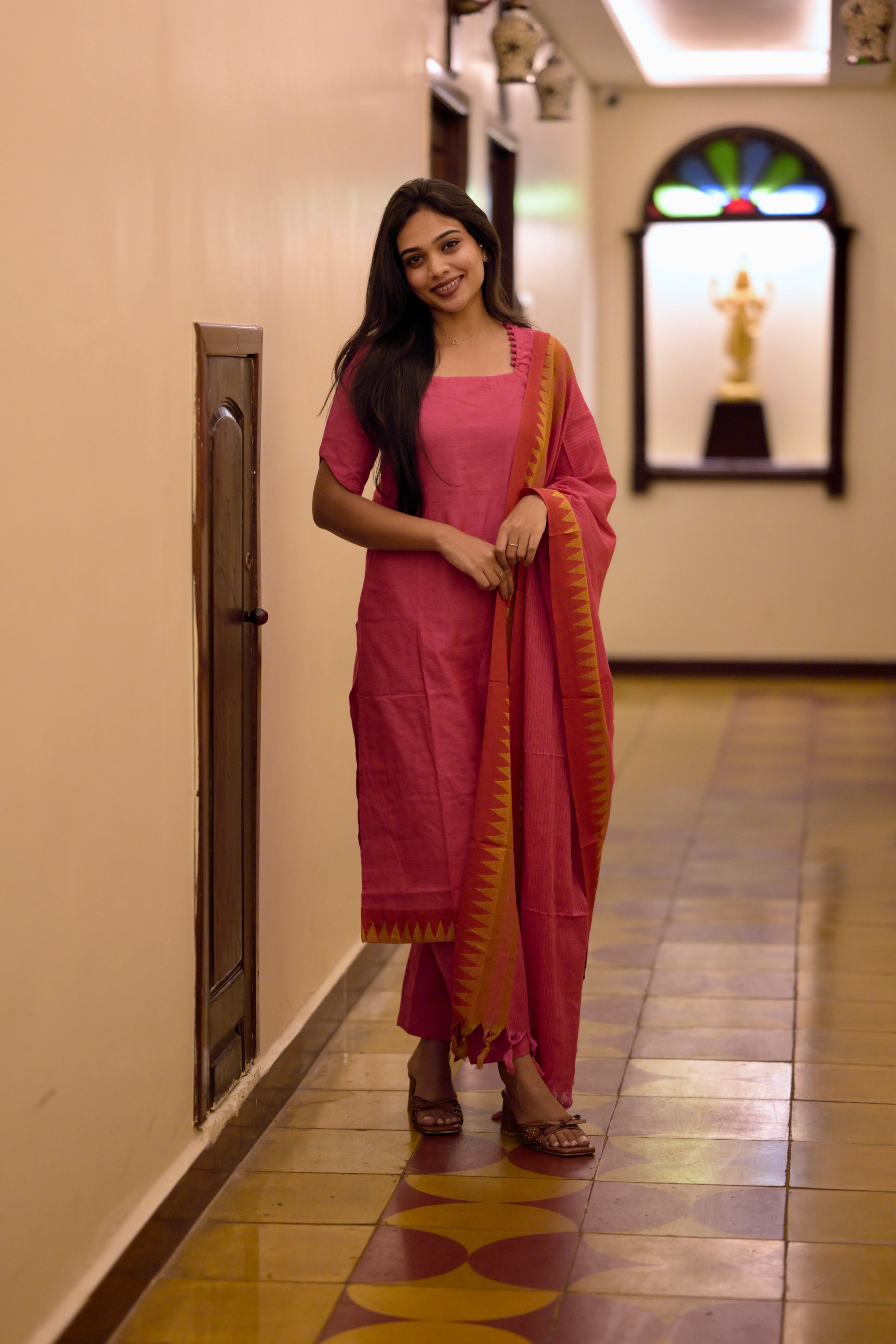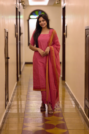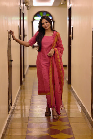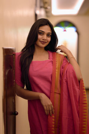 Rithisha ( rani pink) - handloom cotton suit set with temple border in pink colour