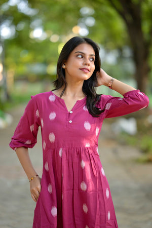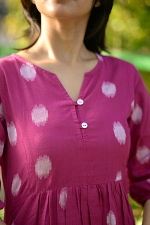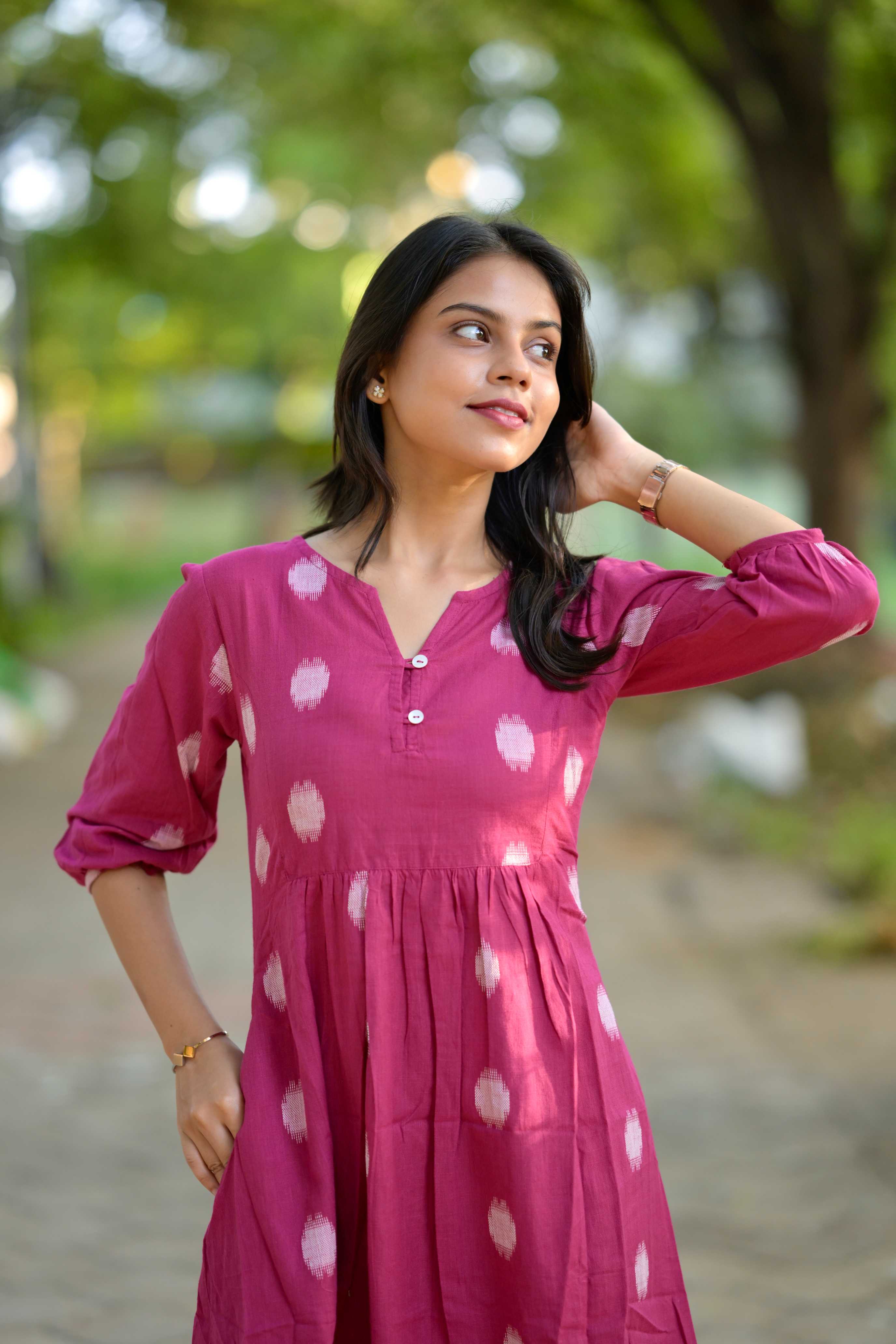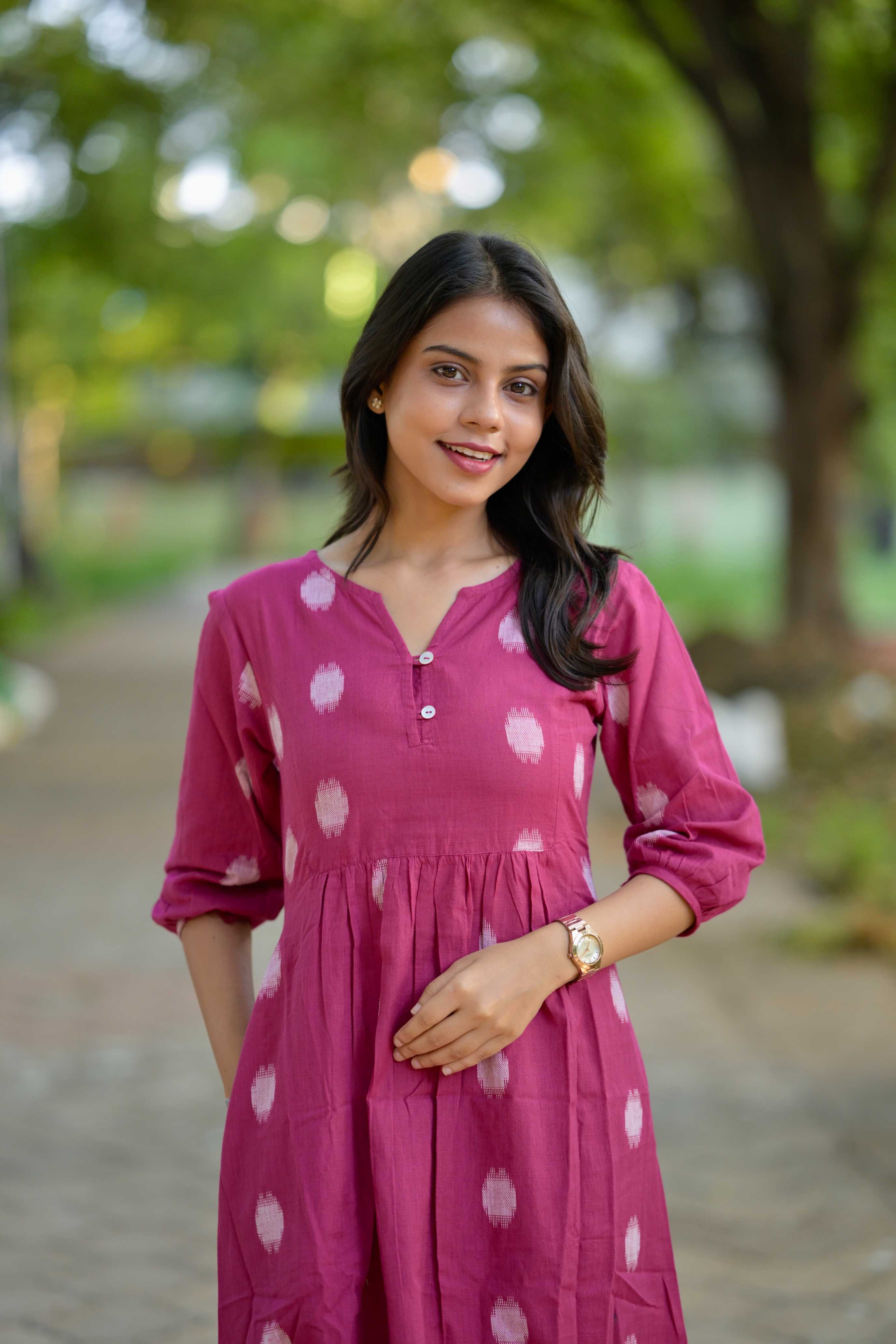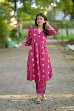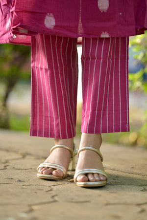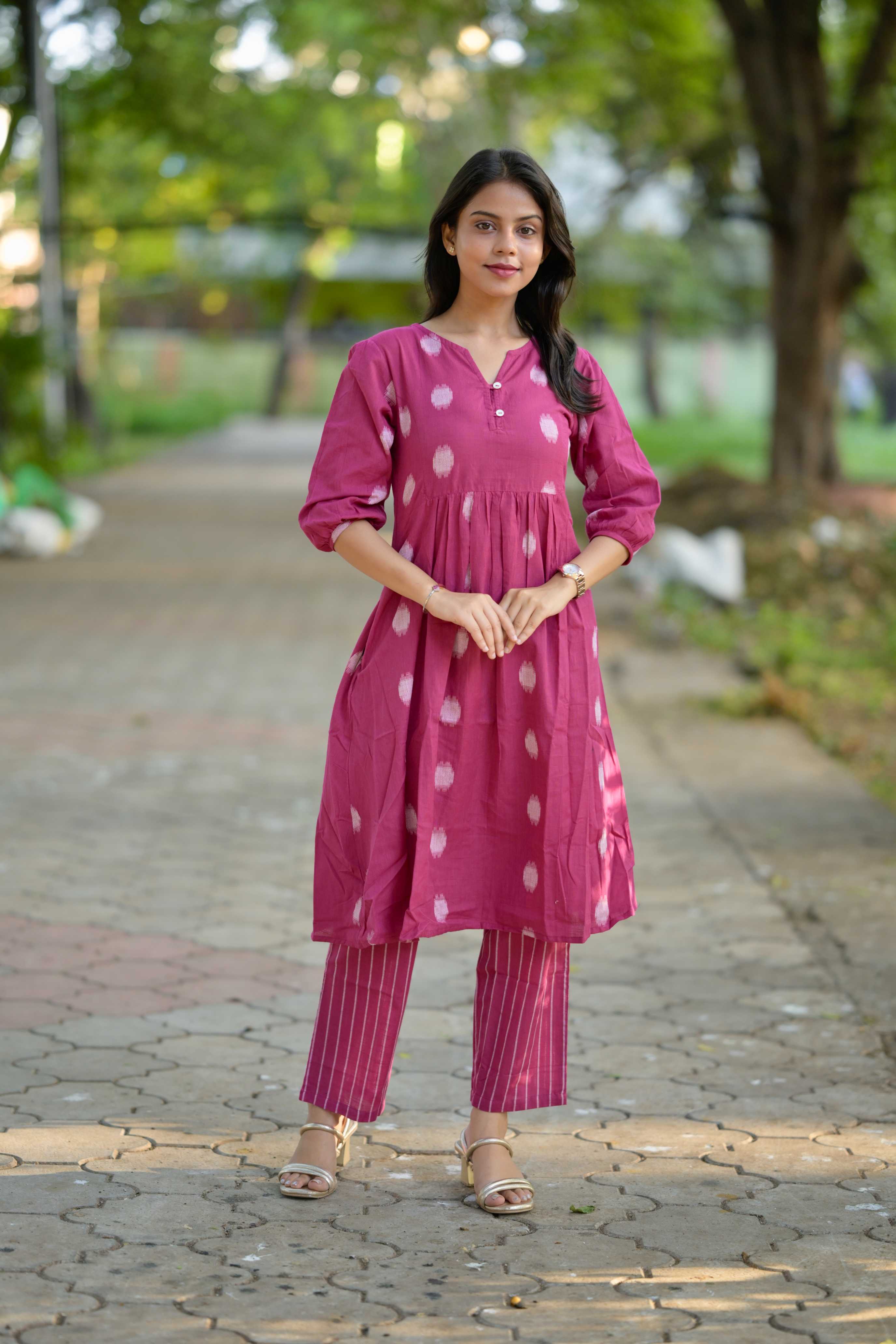 — Polka dot and stripes handwoven handloom cotton coord set in pink .Smart neckline and sleeves with an elastic detailing, kurta has pockets and matching trousers too. It has openable buttons to aid nursing moms.