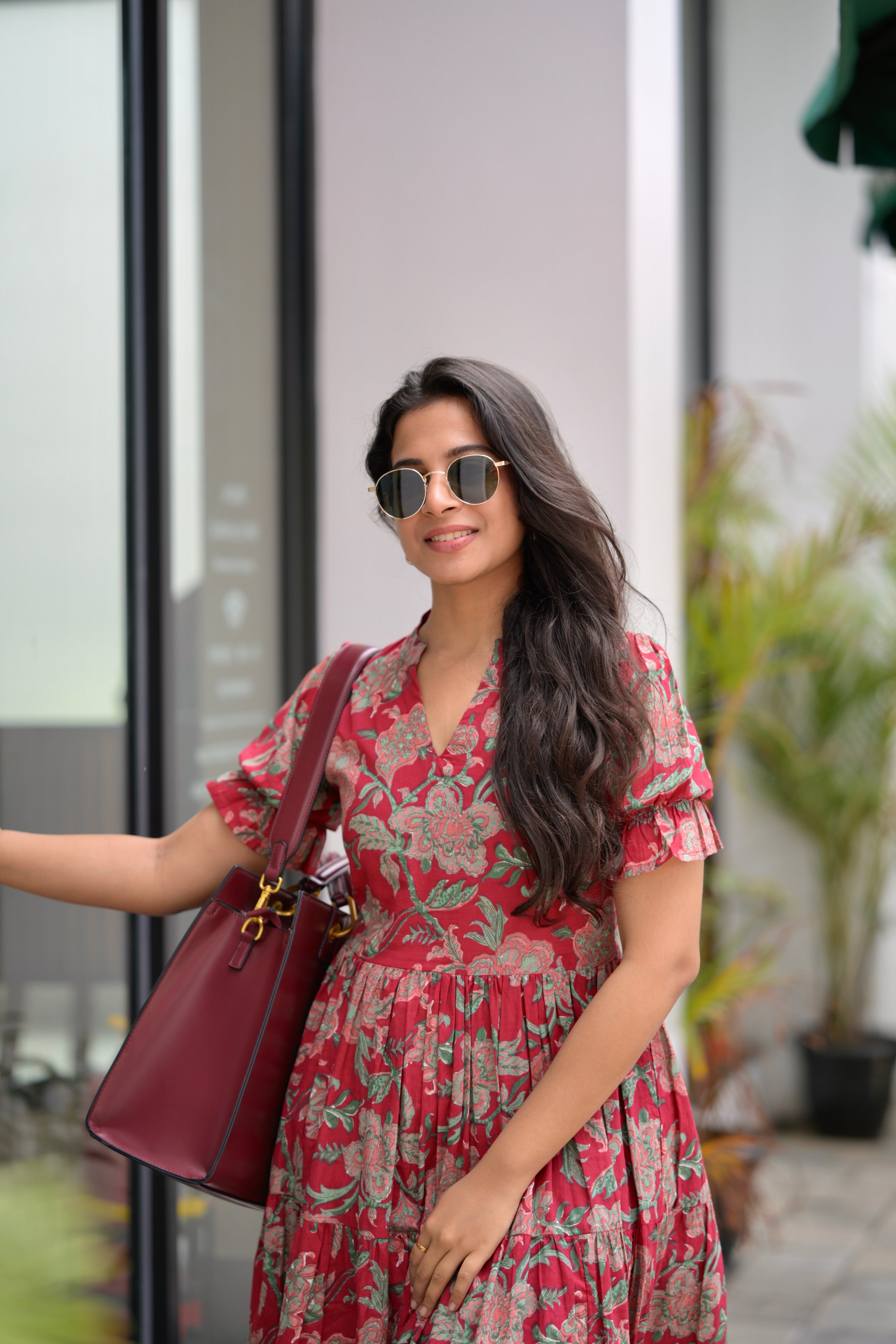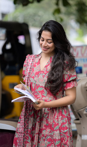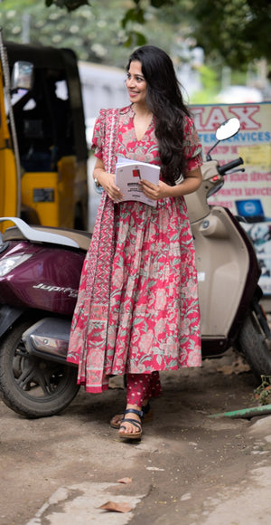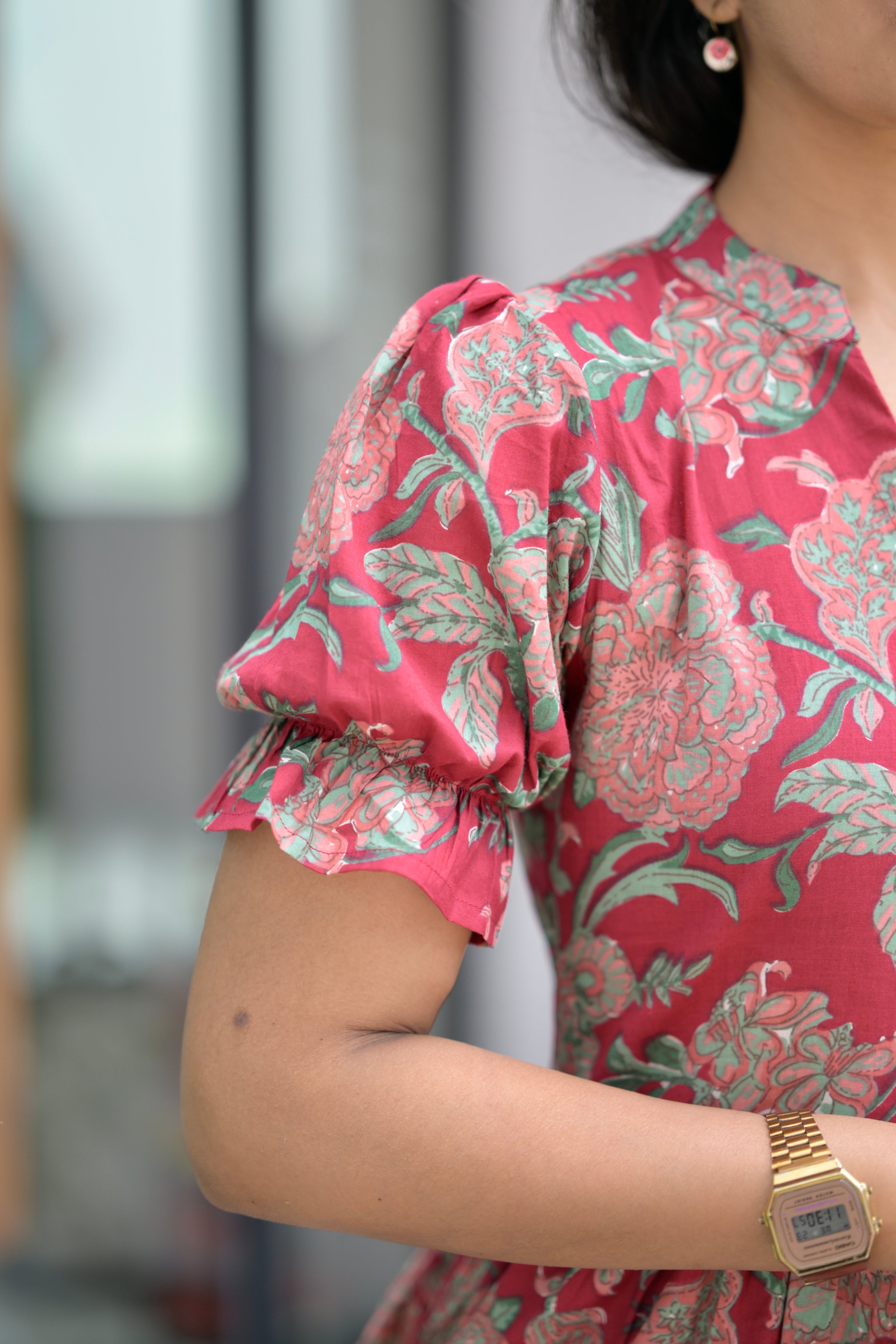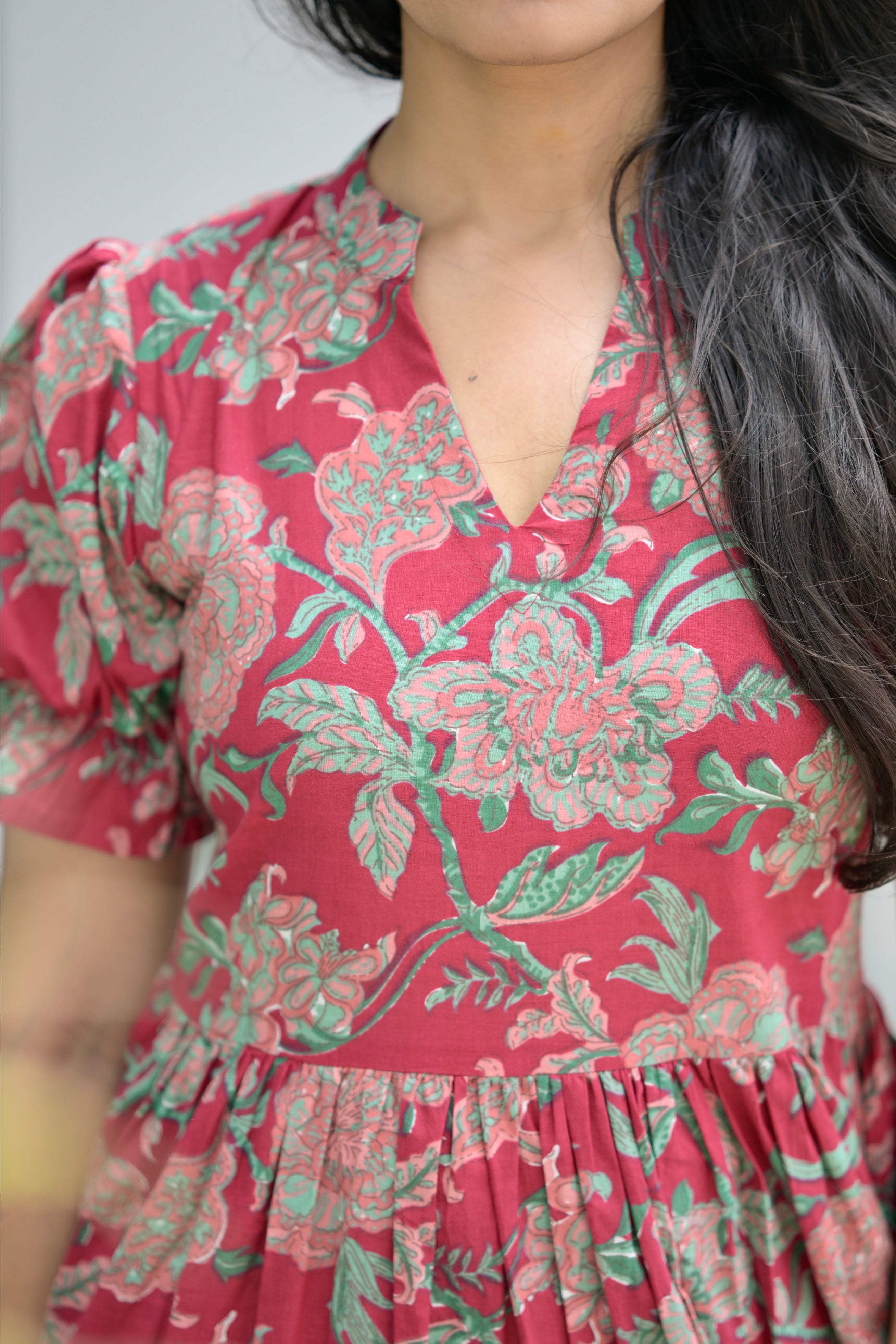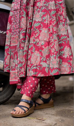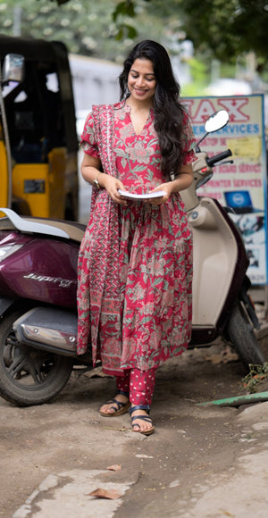 — Floral hand block printed cotton anarkali suit set in a beautiful shade of red. Smart neck detailing with beautiful puffed sleeves and functional pocket on the anarkali kurta.