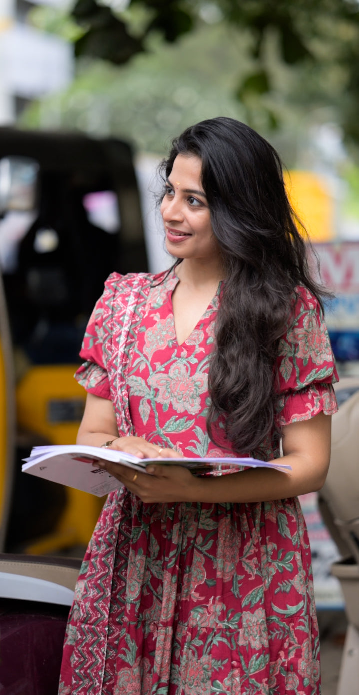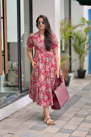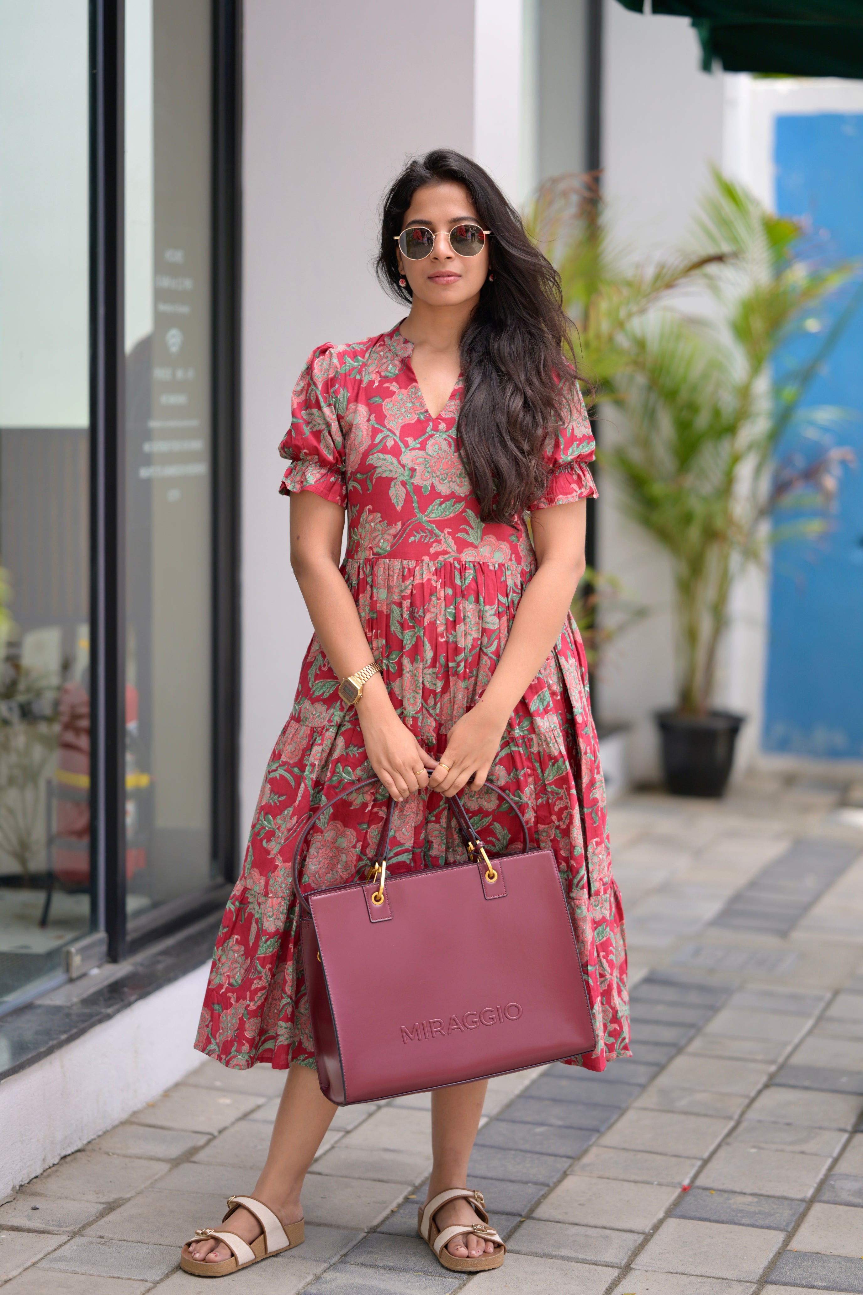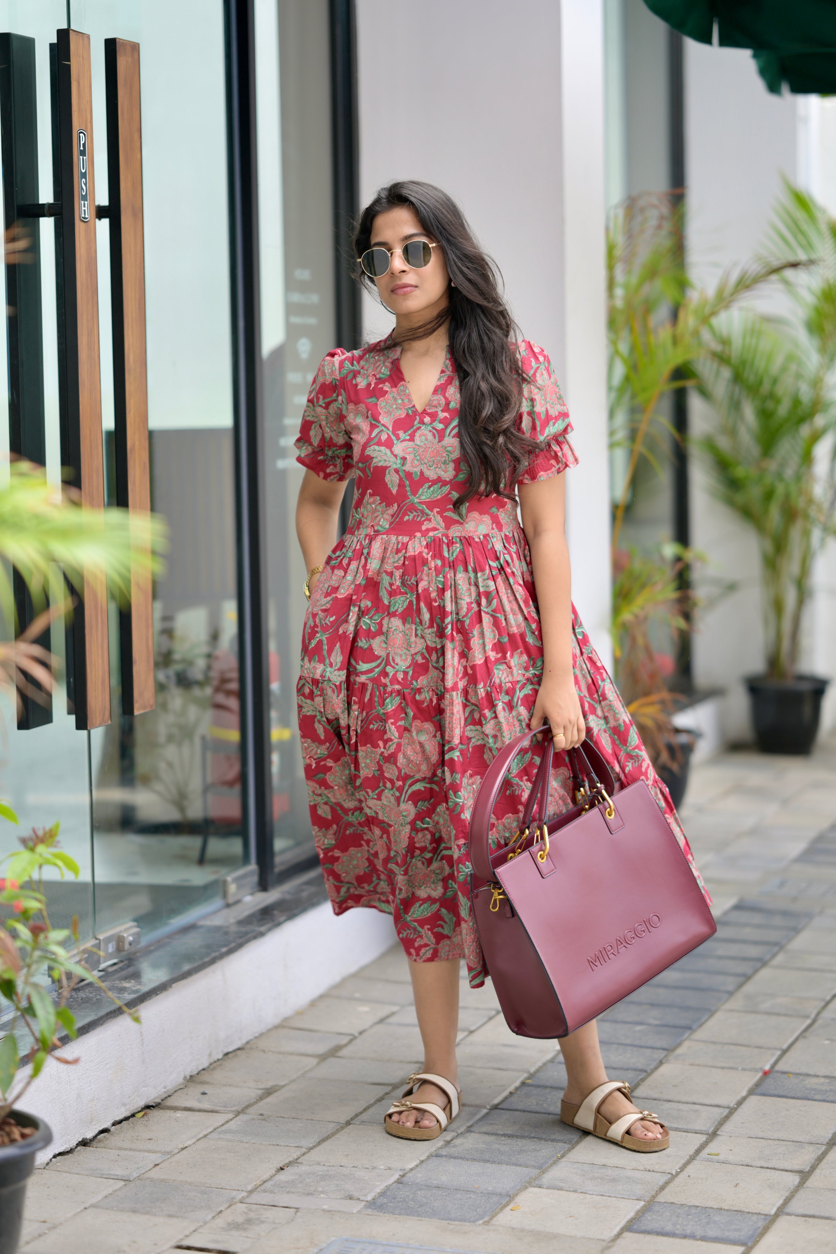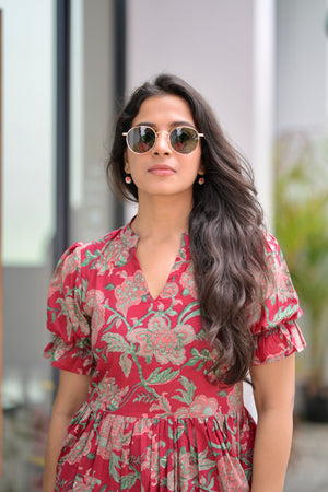 — Floral hand block printed cotton anarkali suit set in a beautiful shade of red. Smart neck detailing with beautiful puffed sleeves and functional pocket on the anarkali kurta.