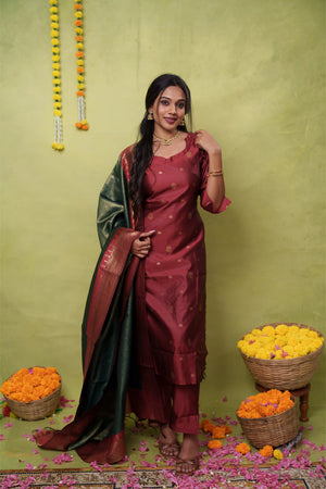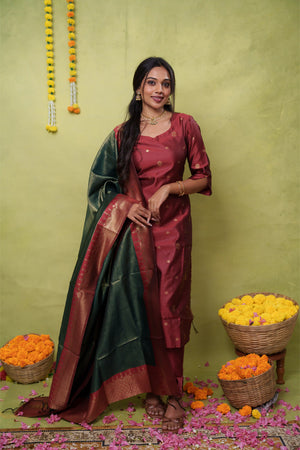 Samanvitha (maroon) - vegan silk suit set with crushed tissue silk dupatta in green and maroon
