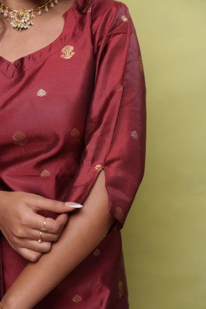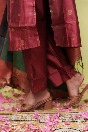 Beautiful shade of maroon vegan silk kurta set with smart neckline and sleeves. Trousers come with functional pockets. Pure tissue silk crushed dupatta in green and maroon. Perfect for festive occasions / bridesmaids.
