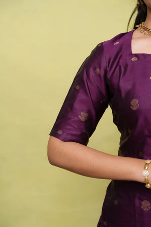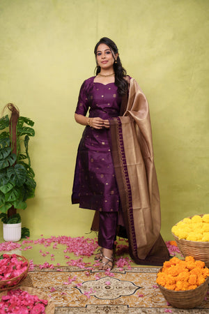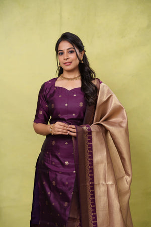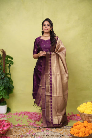 Samanvitha (purple ) - vegan silk suit set with crushed tissue silk dupatta in rose gold and purple