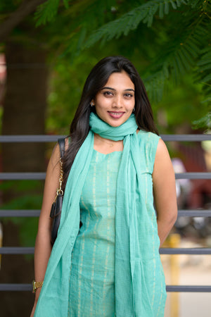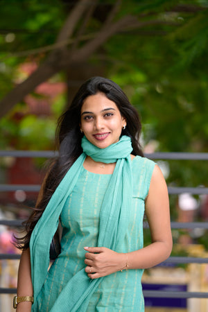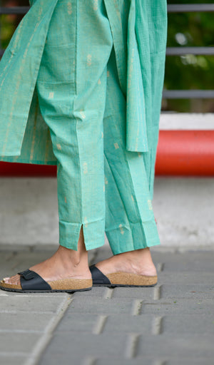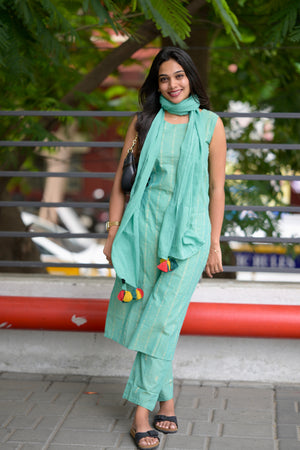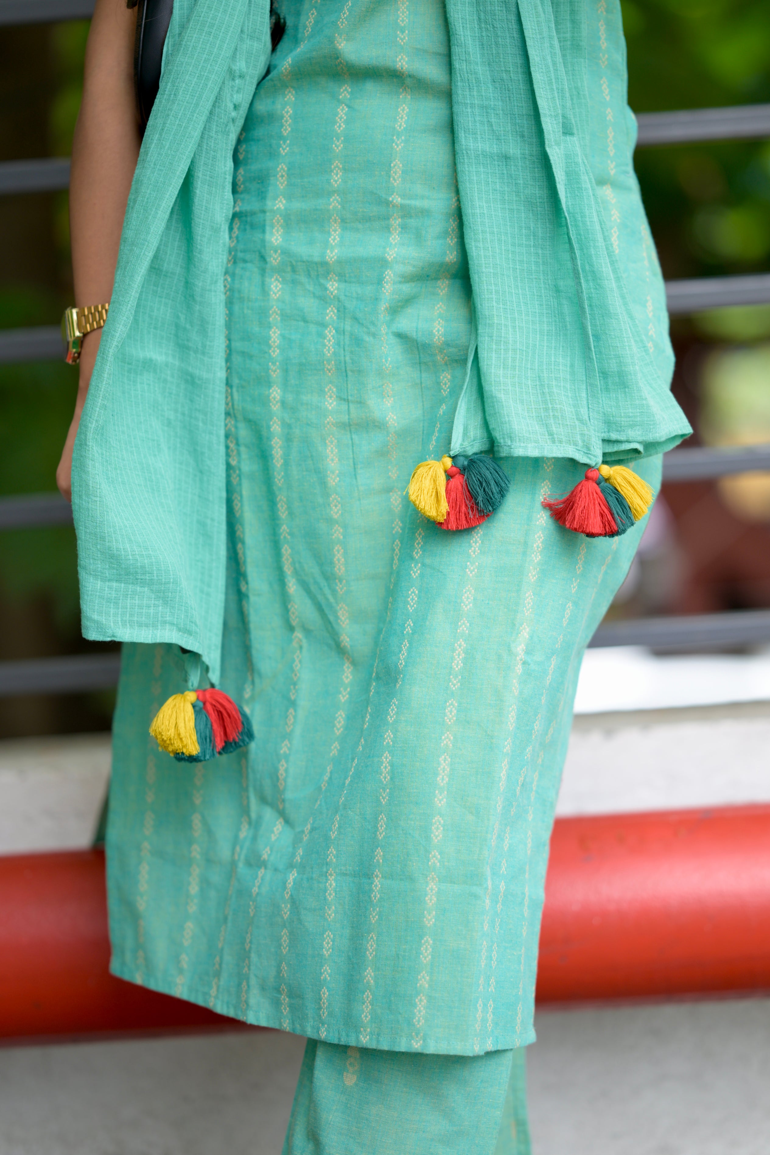 — Striped handloom cotton kurta in green with smart neck detailing with 11 inch sleeves attached inside the kurta a and green handloom cotton trousers with buttas woven all over along with kota doria stole with multi colour tassels.