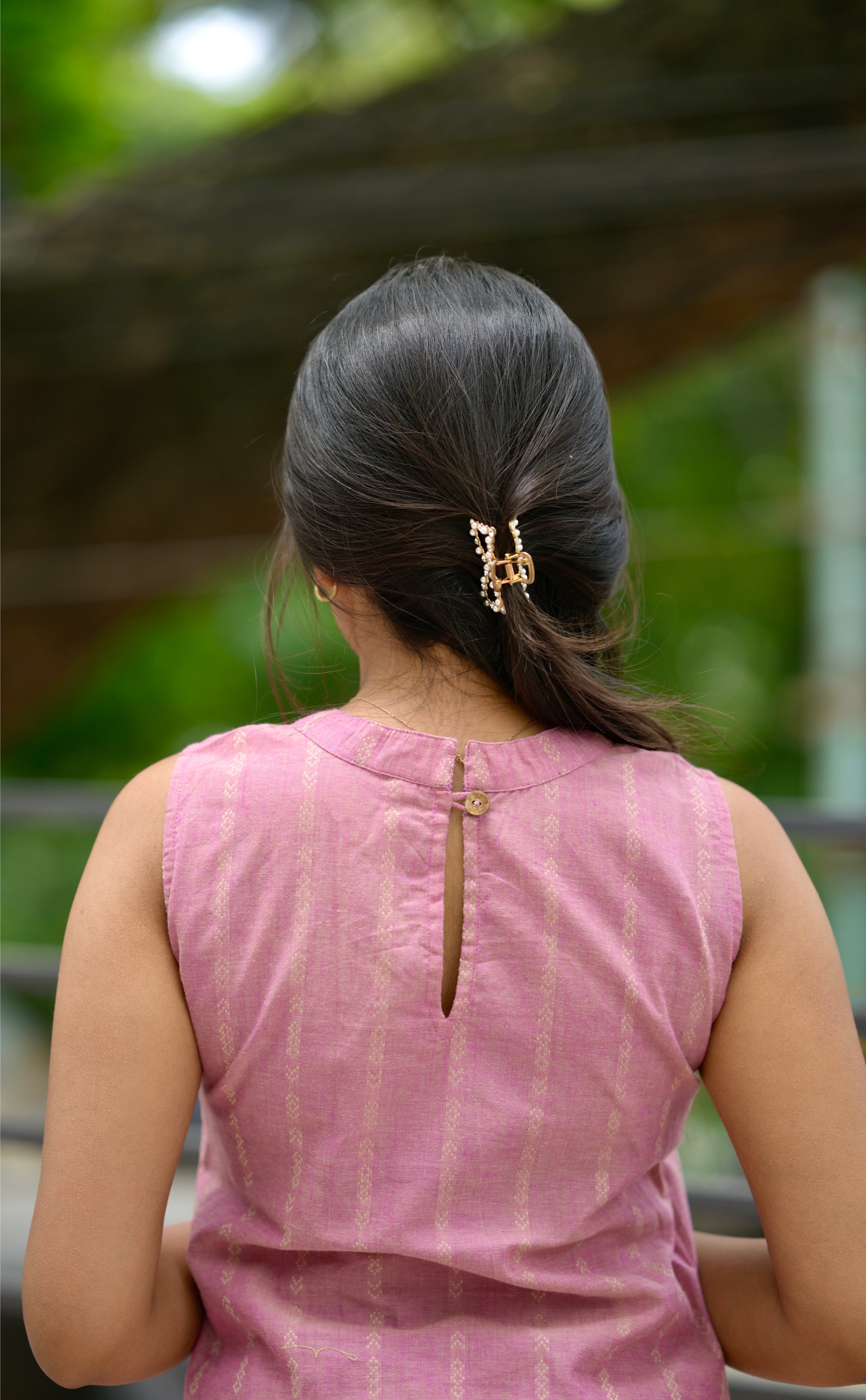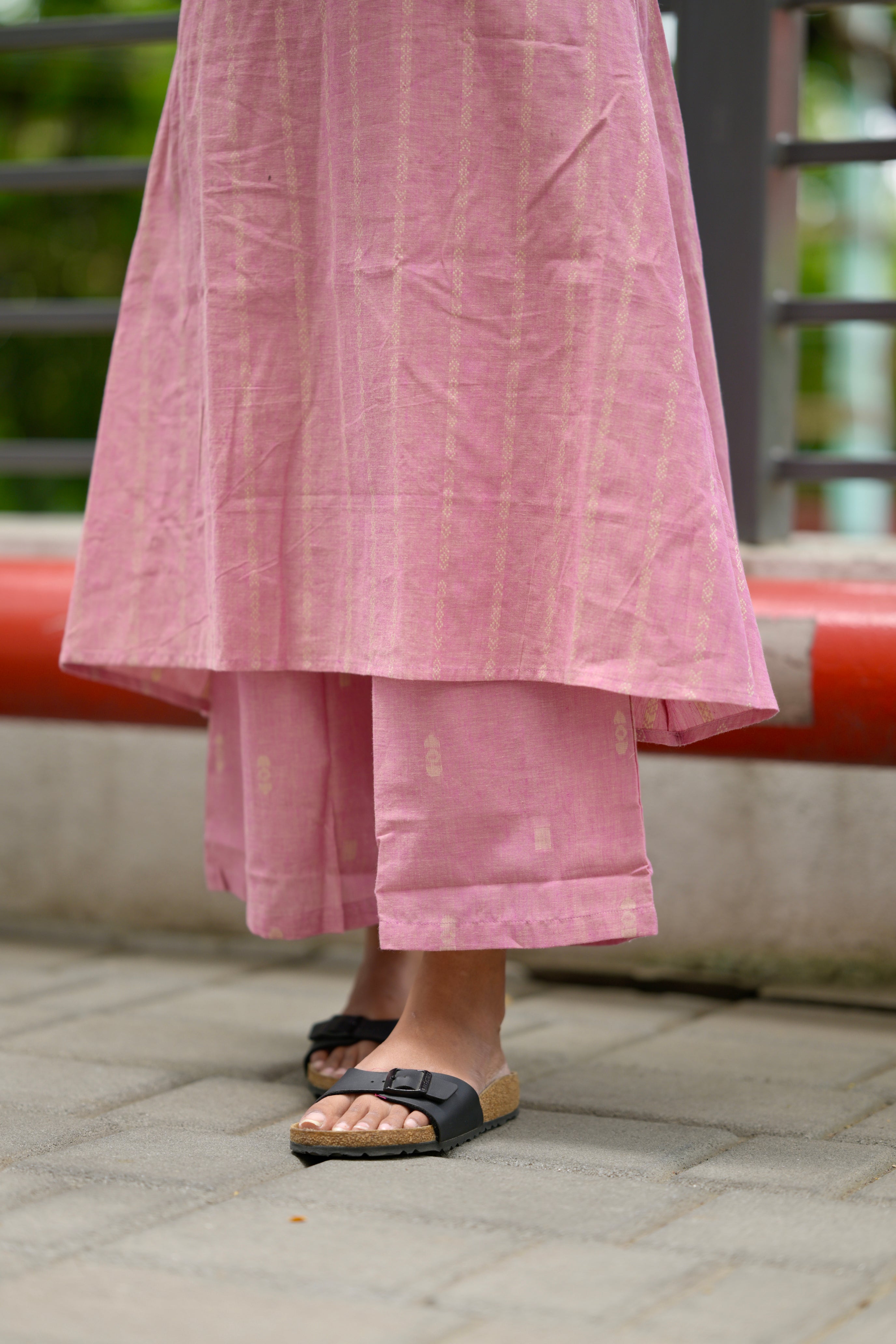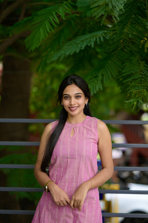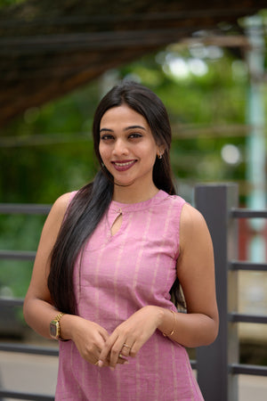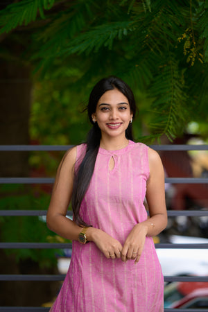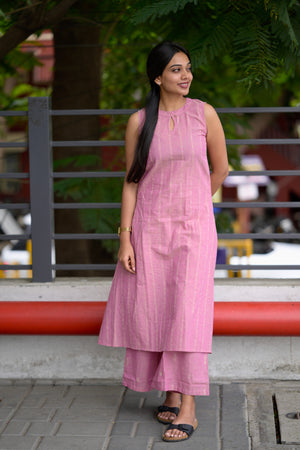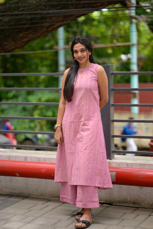 — Halter neck striped handloom cotton kurta in pink with key hole neck detailing with 11 inch sleeves attached inside the kurta along with functional pockets and pink handloom cotton trousers with buttas woven all over. Perfect office/ college wear.