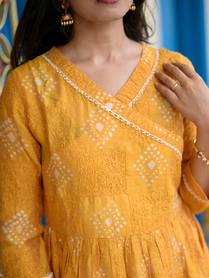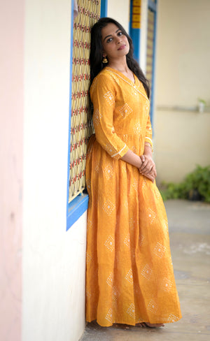 A bold and bright golden yellow muslin silk gown with hand embroidery all over the gown with batik prints and pearl embellishments on the neckline and the sleeves to add grace to the look. A beautiful and flair gown that’s royal and regal with a beautiful heart shaped back neck.