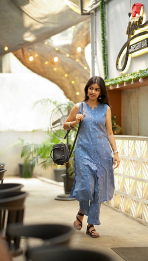 Handloom cotton kurta set with smart scalloped neckline, sleeveless kurta ( with attached 11 inch sleeve inside the kurta ) and matching trousers with functional pockets.