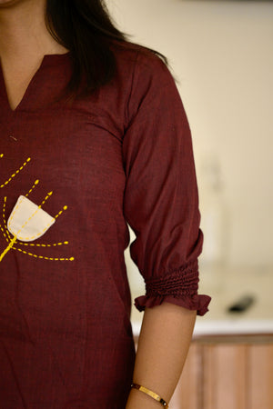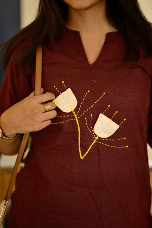Each appliqué detail is lovingly hand-stitched, adding depth, charm, and a personal touch that machine work can’t replicate. Crafted on soft, breathable cotton flex, it keeps you cool and polished all day long.