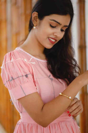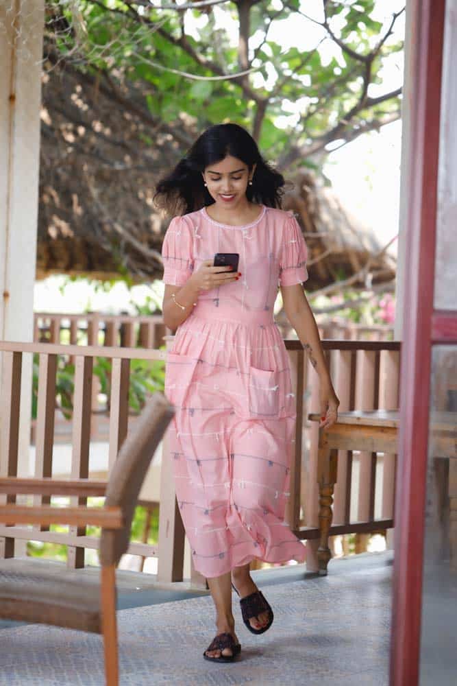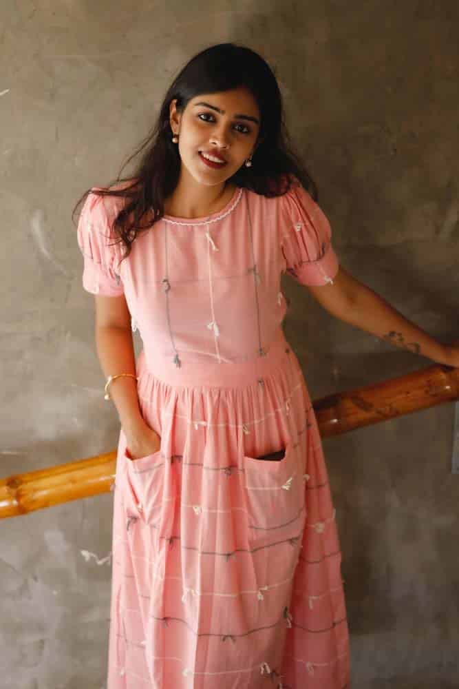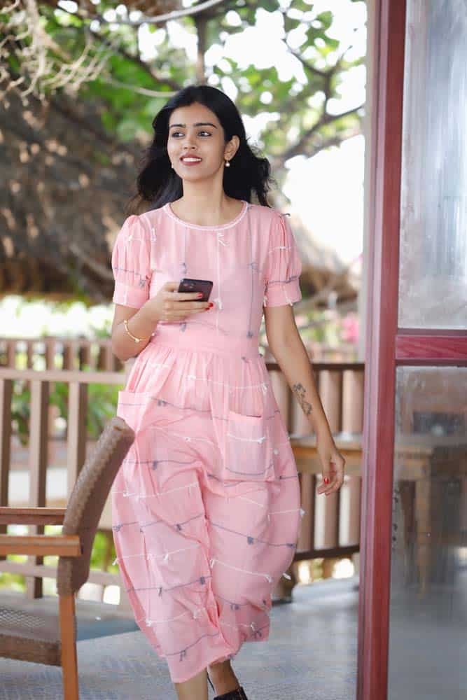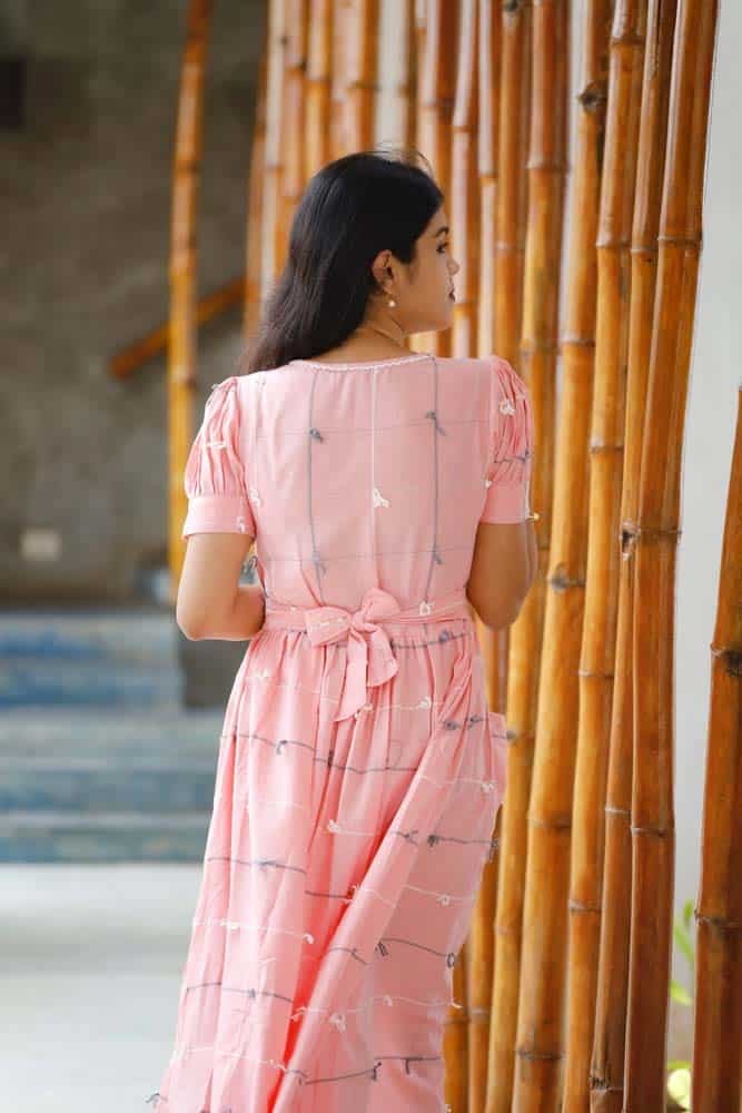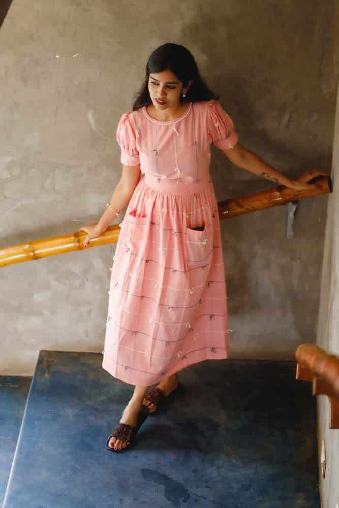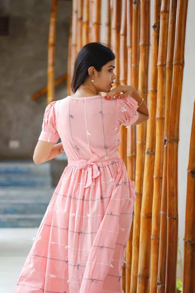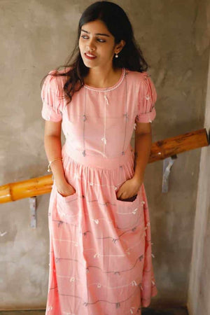 - Pink handloom cotton dress with handwoven dori detaling all over the dress