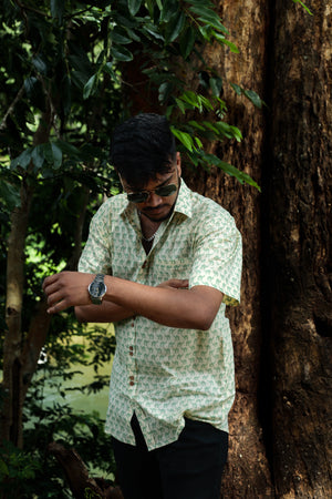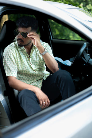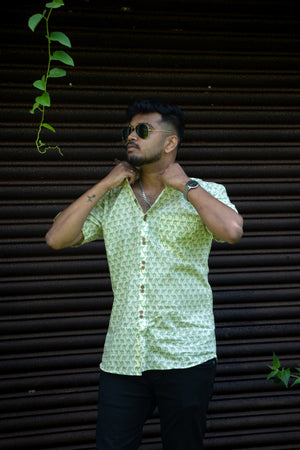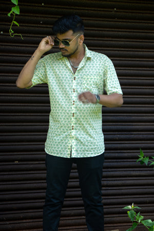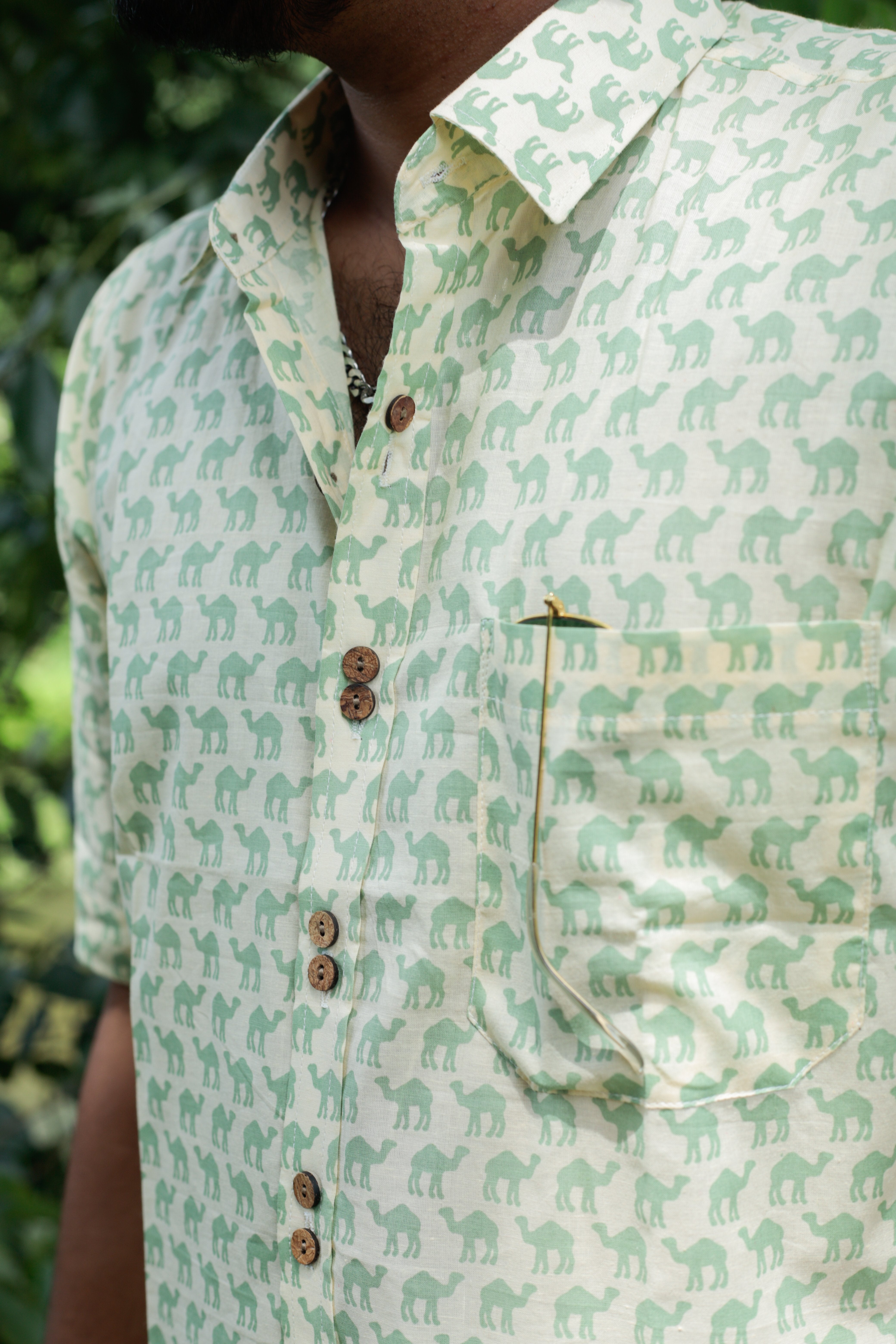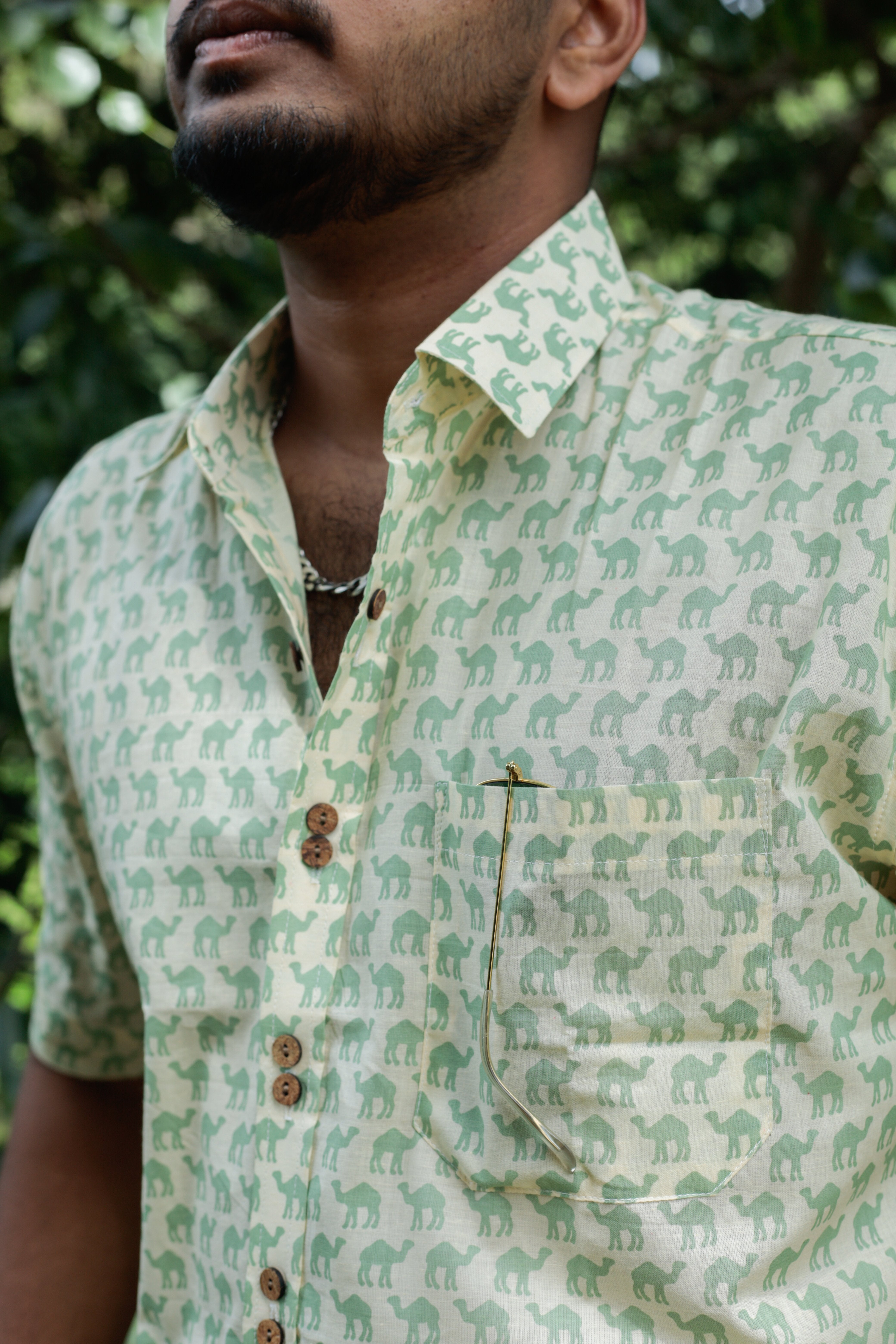 Shirt -17 - handblock Camel printed organic cotton shirt in yellow and green