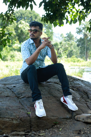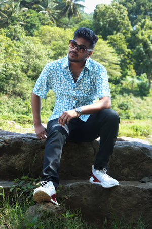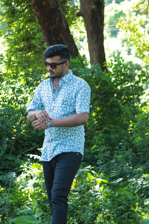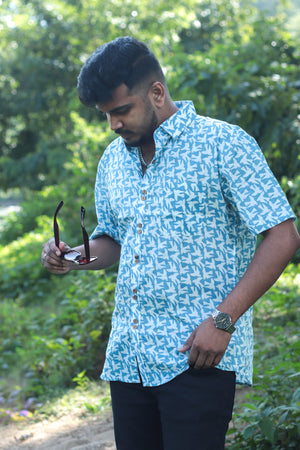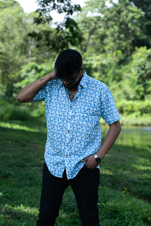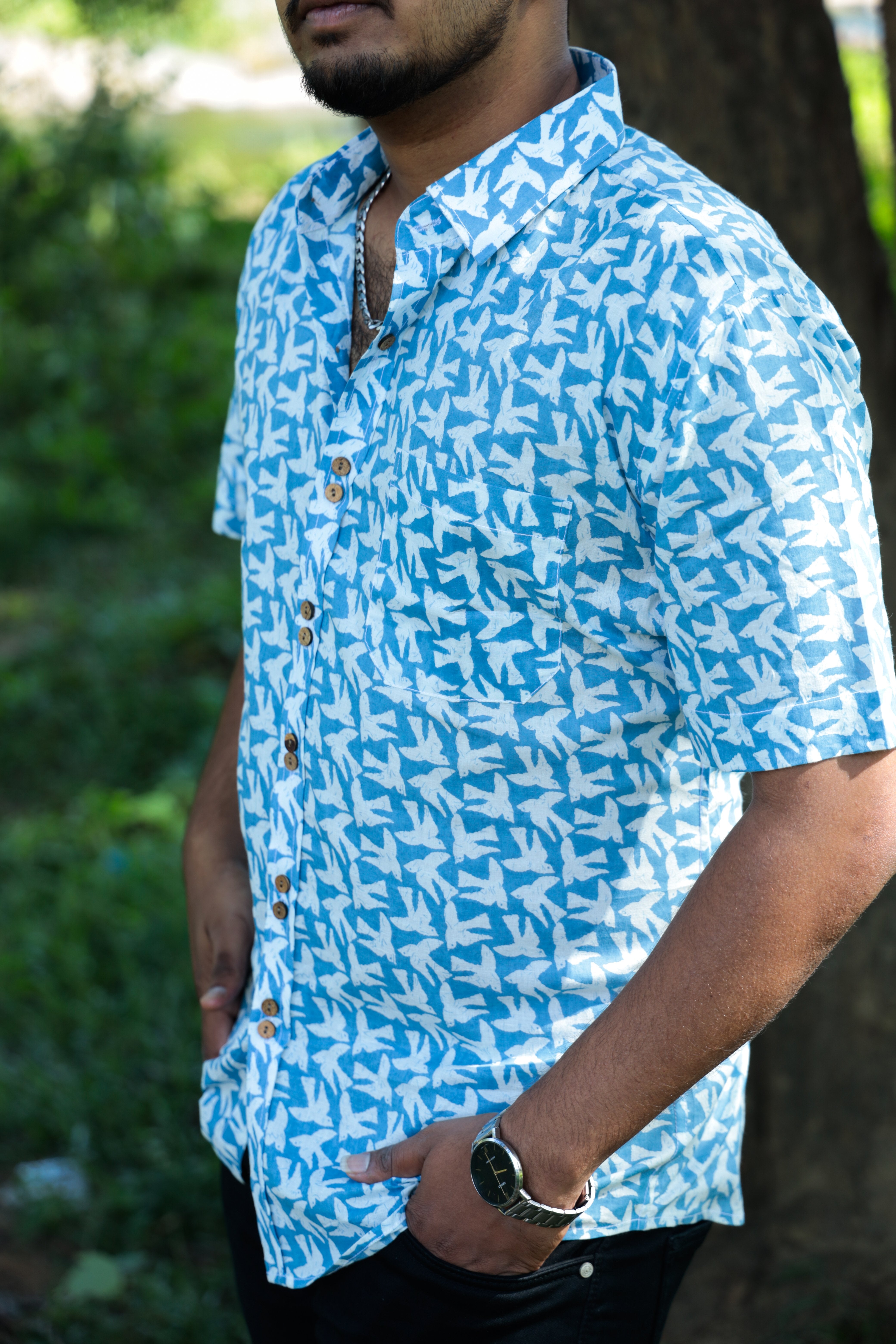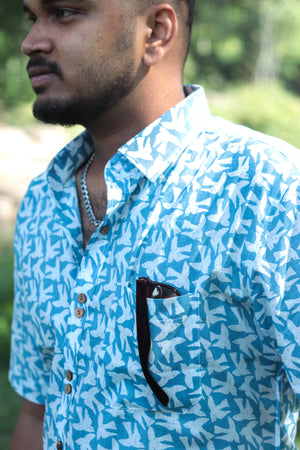 Shirt - 20 - handblock Swift bird printed organic cotton shirt in sky blue