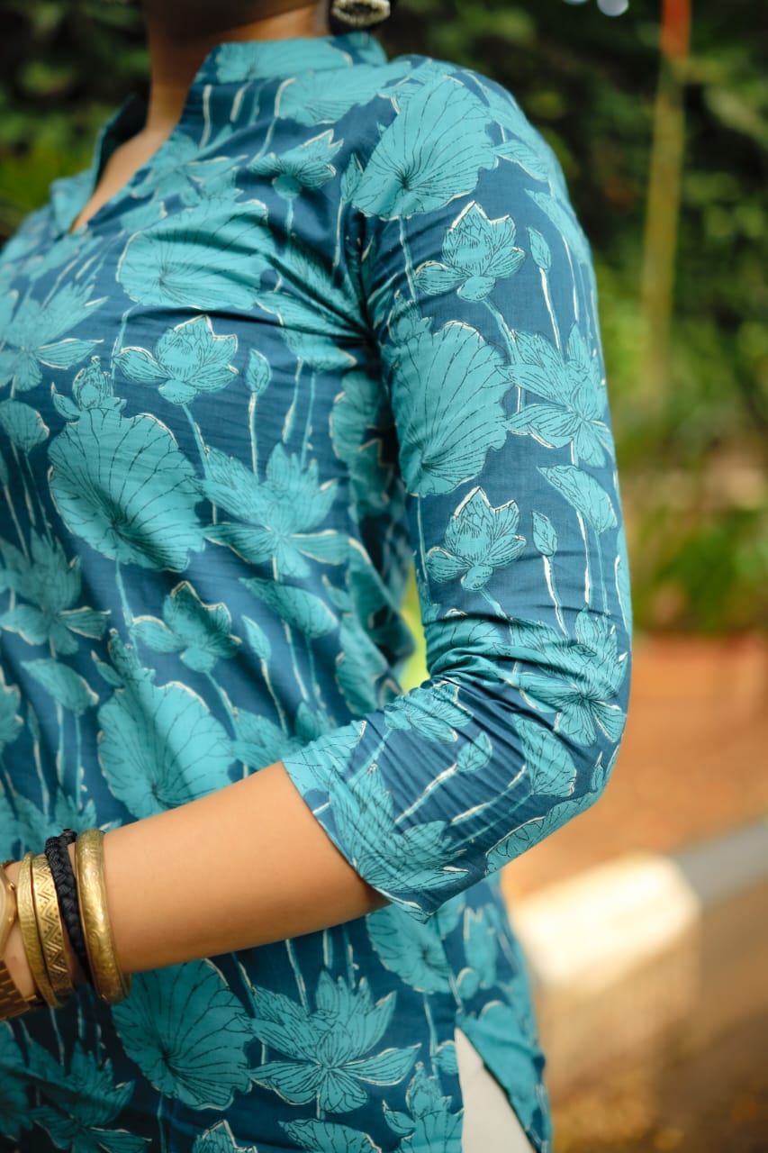 Comfy and super chic cotton short kurti in classy and cute prints with smart neck and sleeve pattern. Perfect to pair it with jeans / culottes / trousers. Organic cotton is used making it the most apt for this summer.