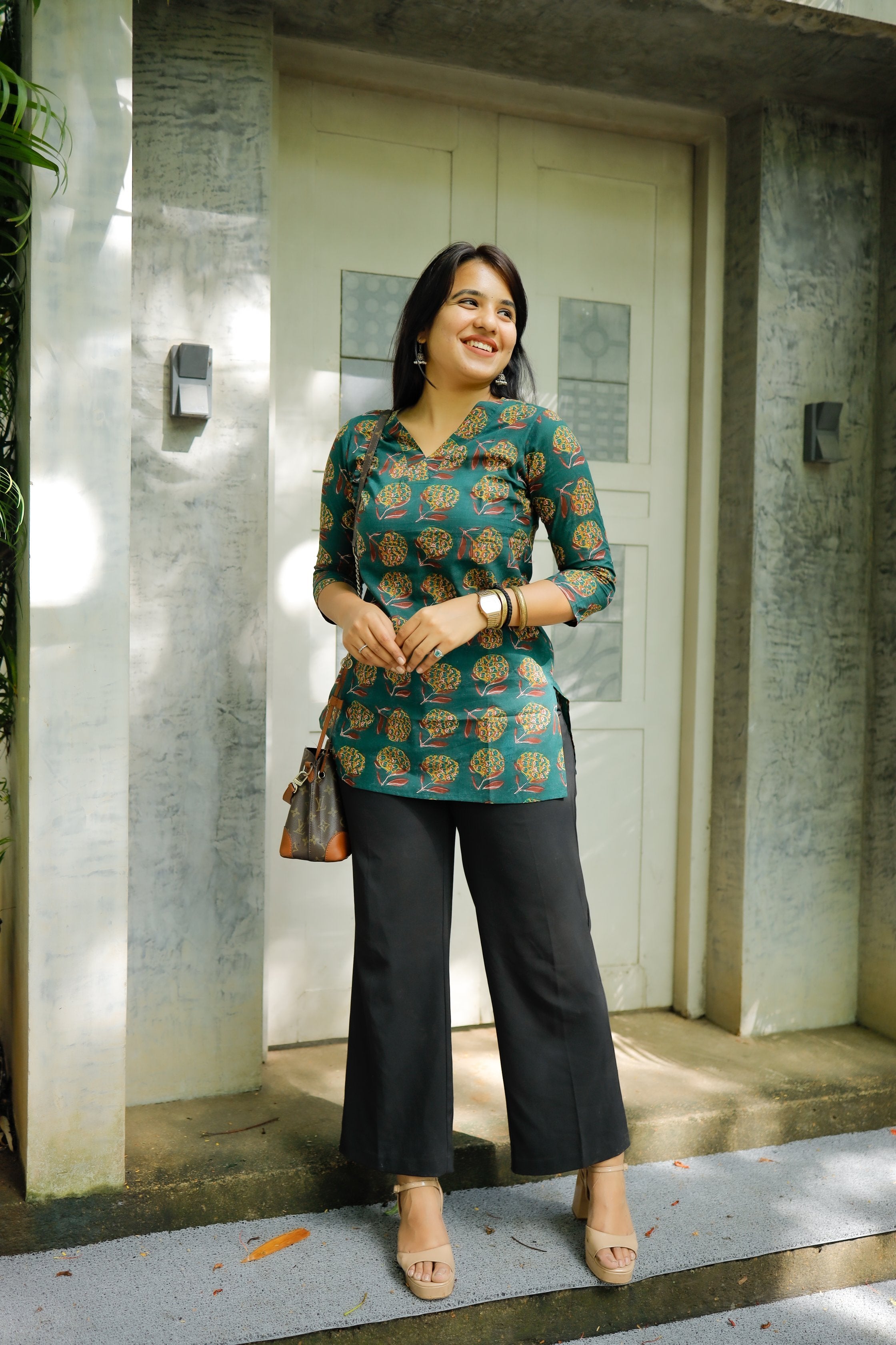 Comfy and super chic cotton short kurti in classy and cute prints with smart neck and sleeve pattern. Perfect to pair it with jeans / culottes / trousers. Organic cotton is used making it the most apt for this summer.