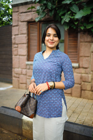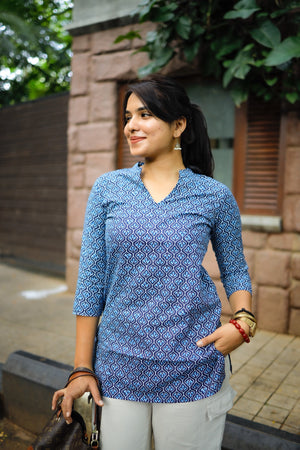 Comfy and super chic cotton short kurti in classy and cute prints with smart neck and sleeve pattern. Perfect to pair it with jeans / culottes / trousers. Organic cotton is used making it the most apt for this summer.