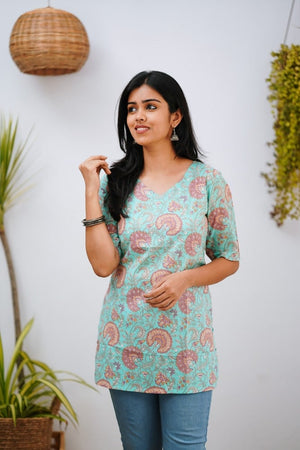 Comfy and super chic cotton short kurti in classy and cute prints with smart neck and sleeve pattern. Perfect to pair it with jeans / culottes / trousers. Organic cotton is used making it the most apt for this summer.
