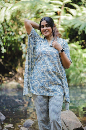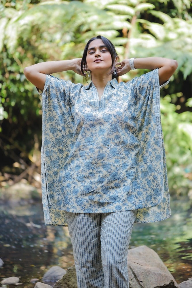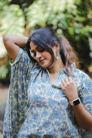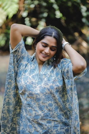Shyla kaftan set - hand block floral silhouette printed kaftan set in off white and blue