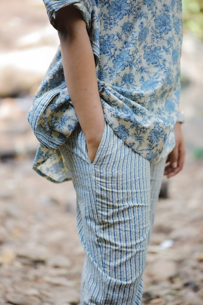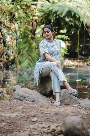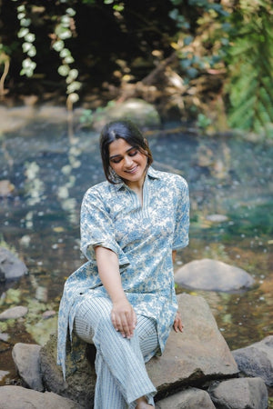 A beautiful floral silhouette hand block printed kaftan kurta in off white and blue with gold foil prints here and there in pure organic cotton fabric with a smart collar neck