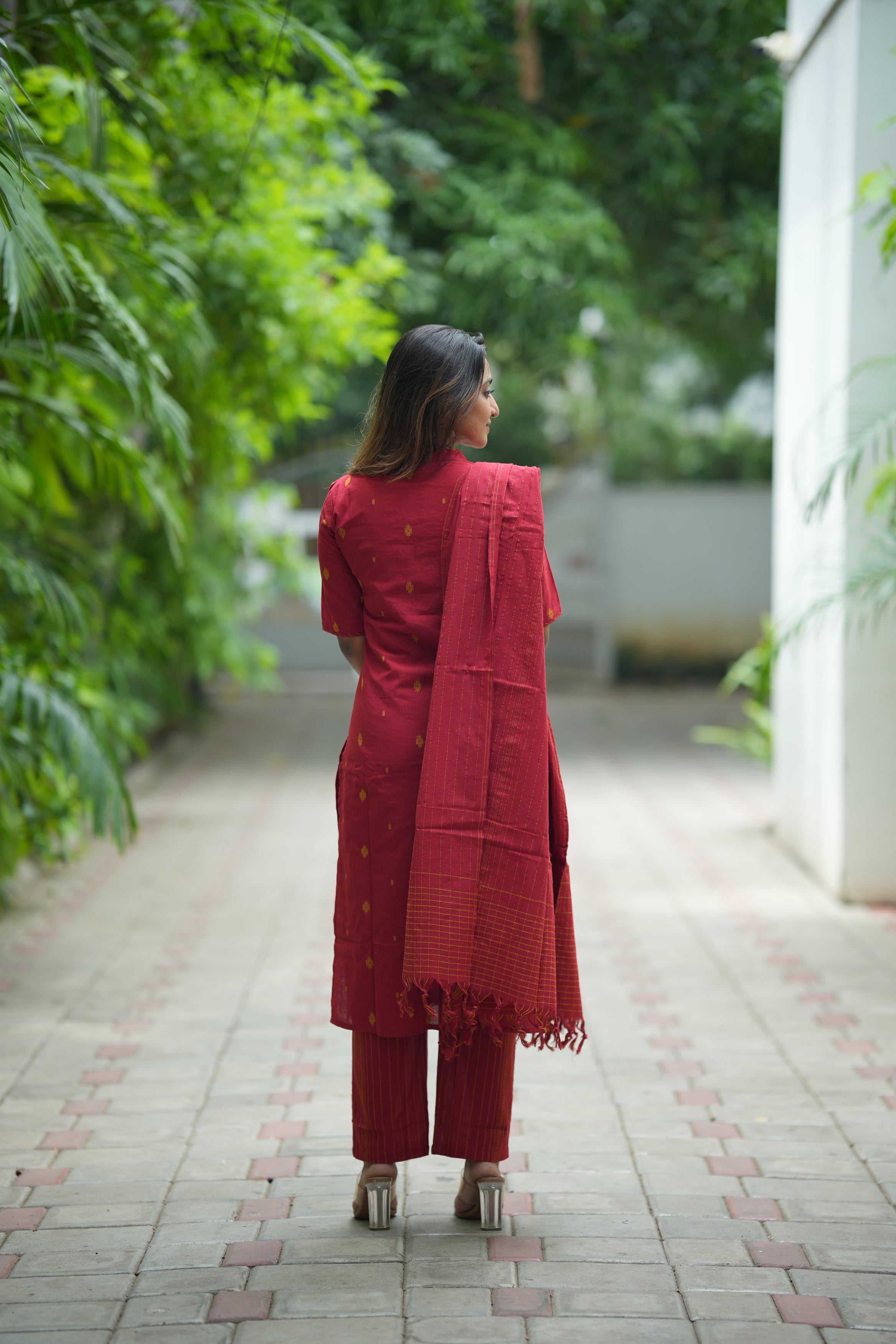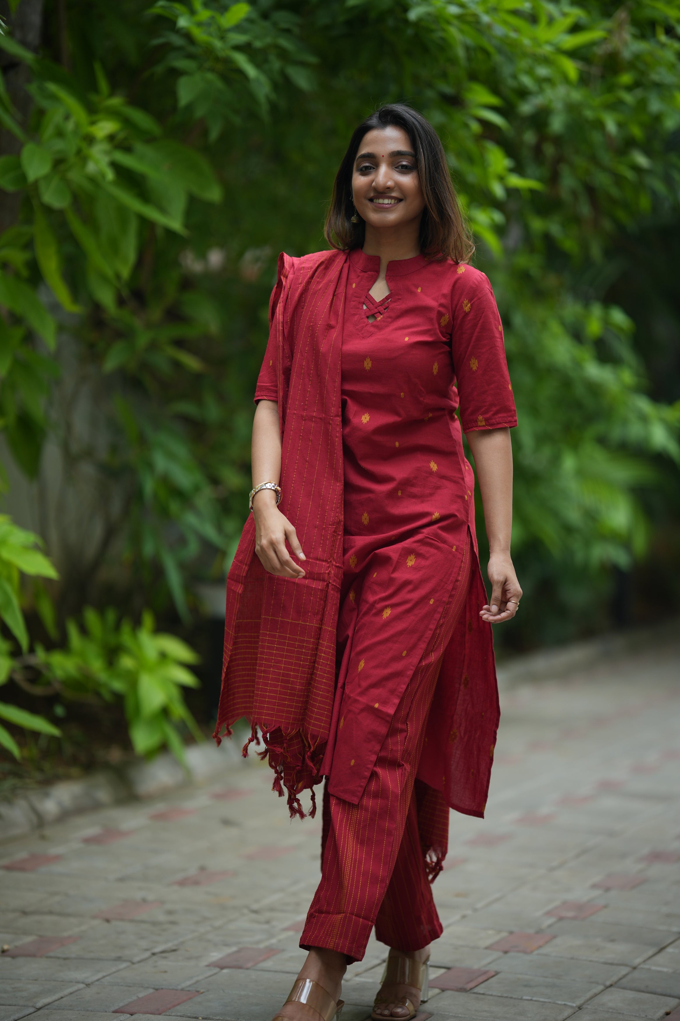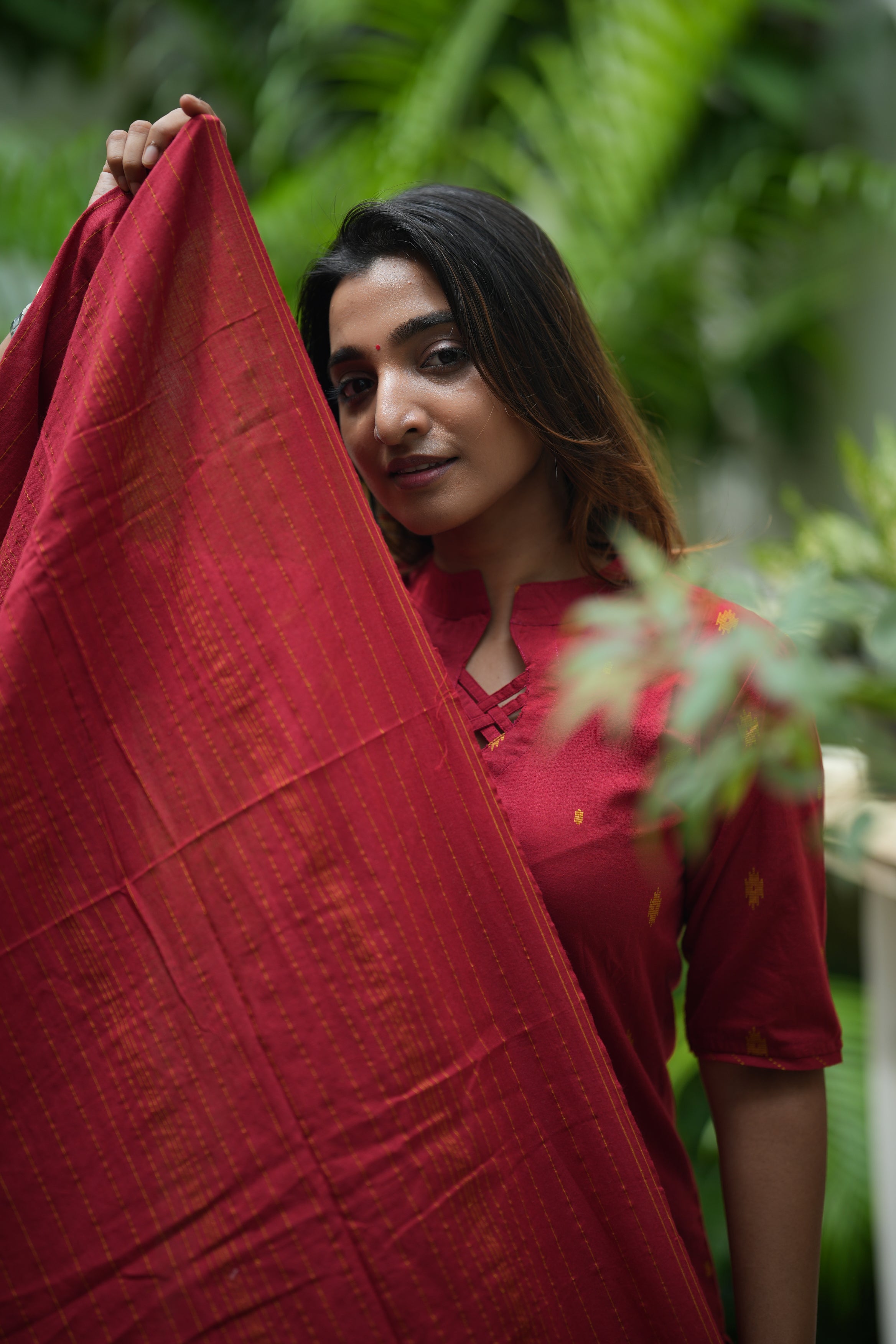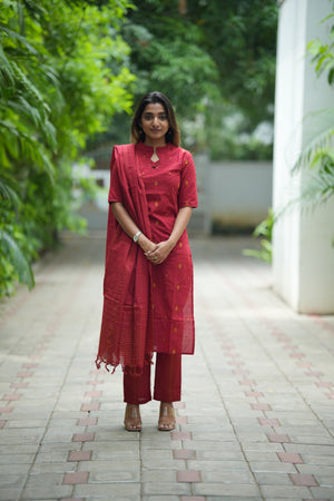 Sindoorika (red) - handloom cotton suit set in vermillion red