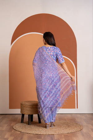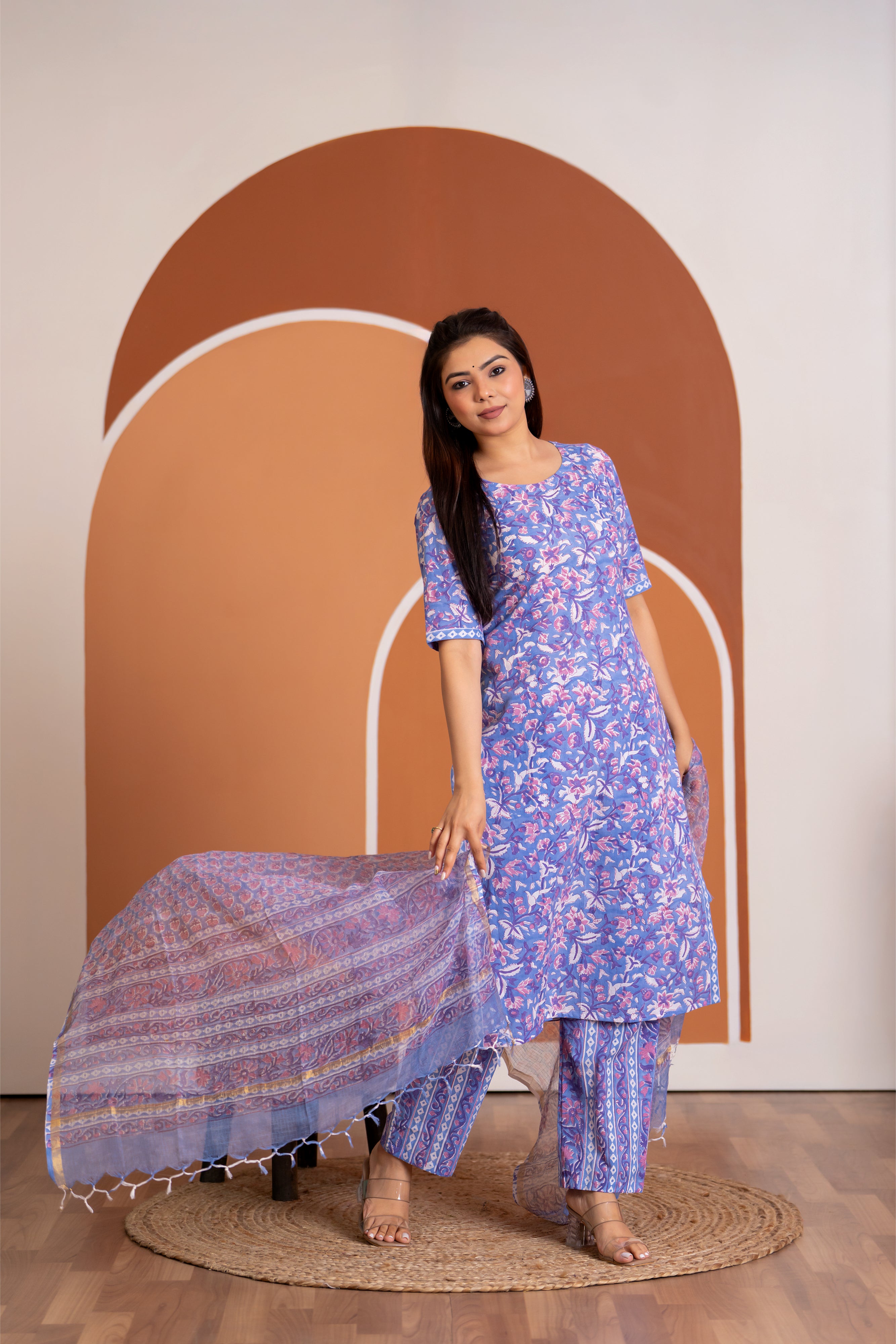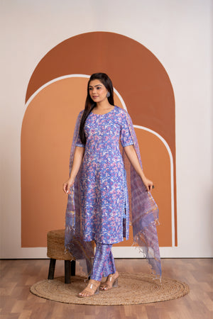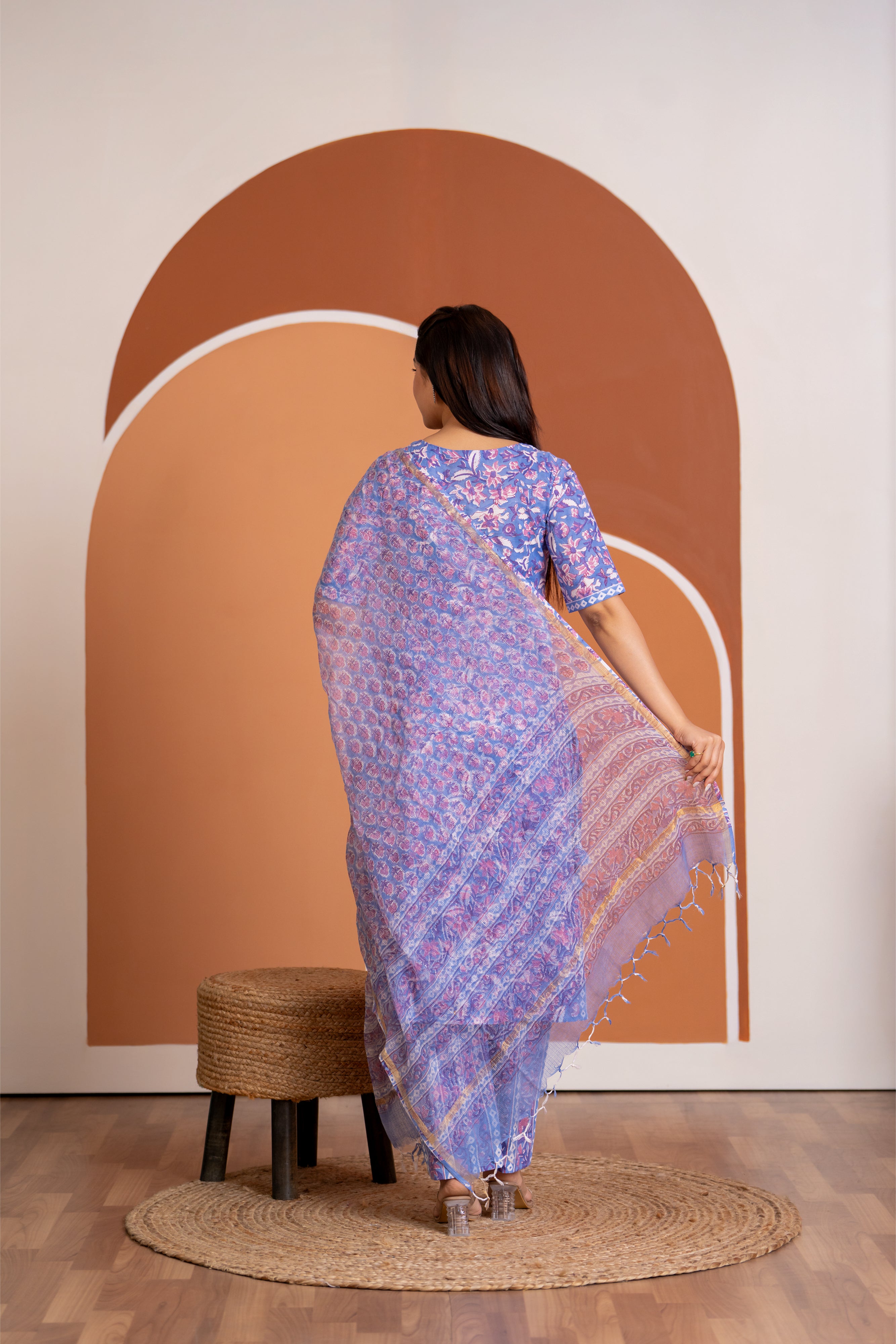 Floral hand block printed cotton suit set with kota doria dupatta in purple, boat neck detailing with 11 inch sleeves kurta with tassels for knot detailing on both sides of the kurta. Matching hand block printed cotton trousers with functional pockets with matching hand block printed kota doria dupatta.