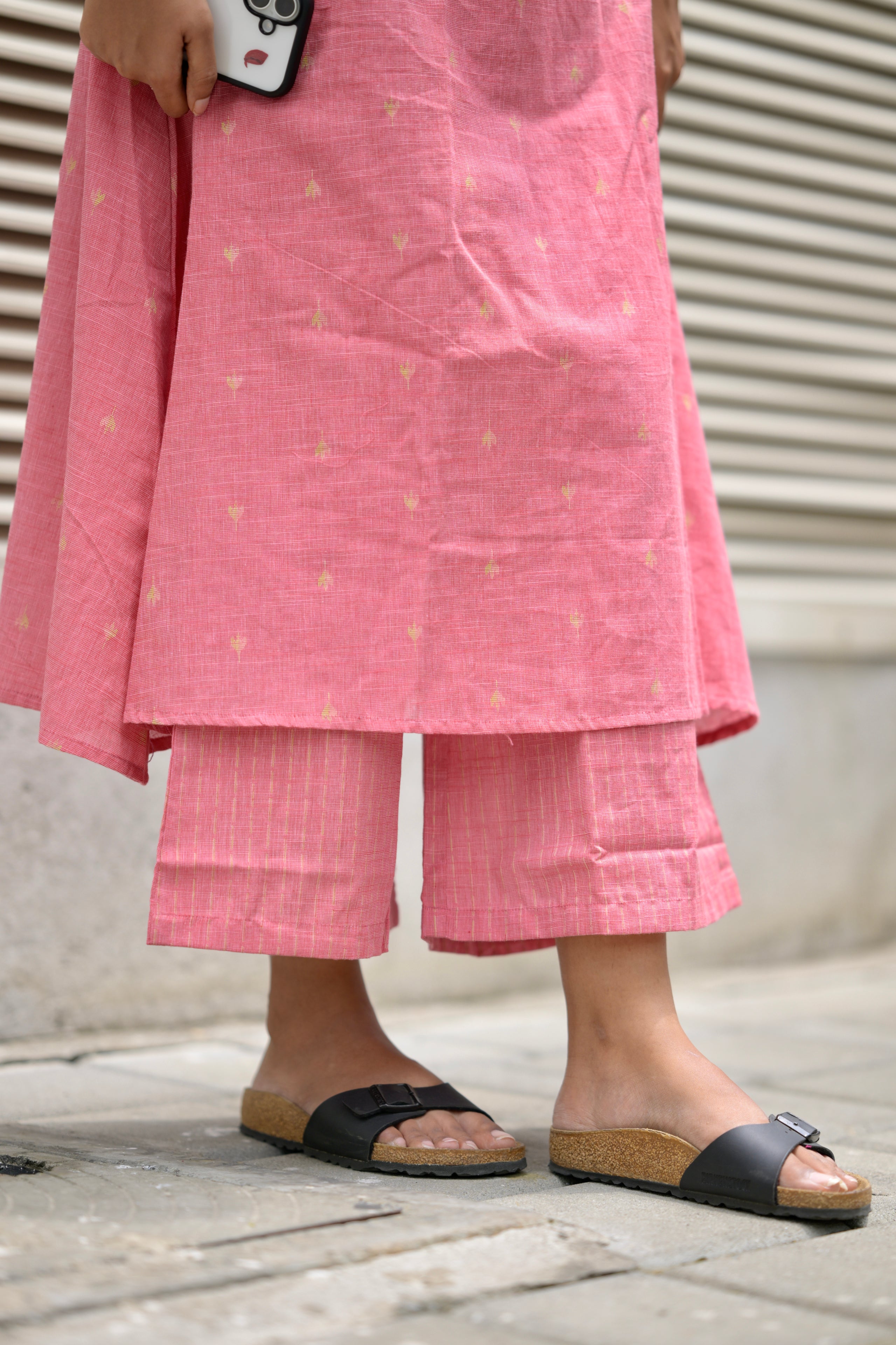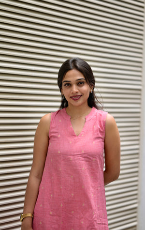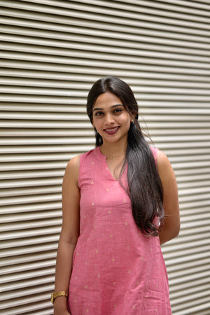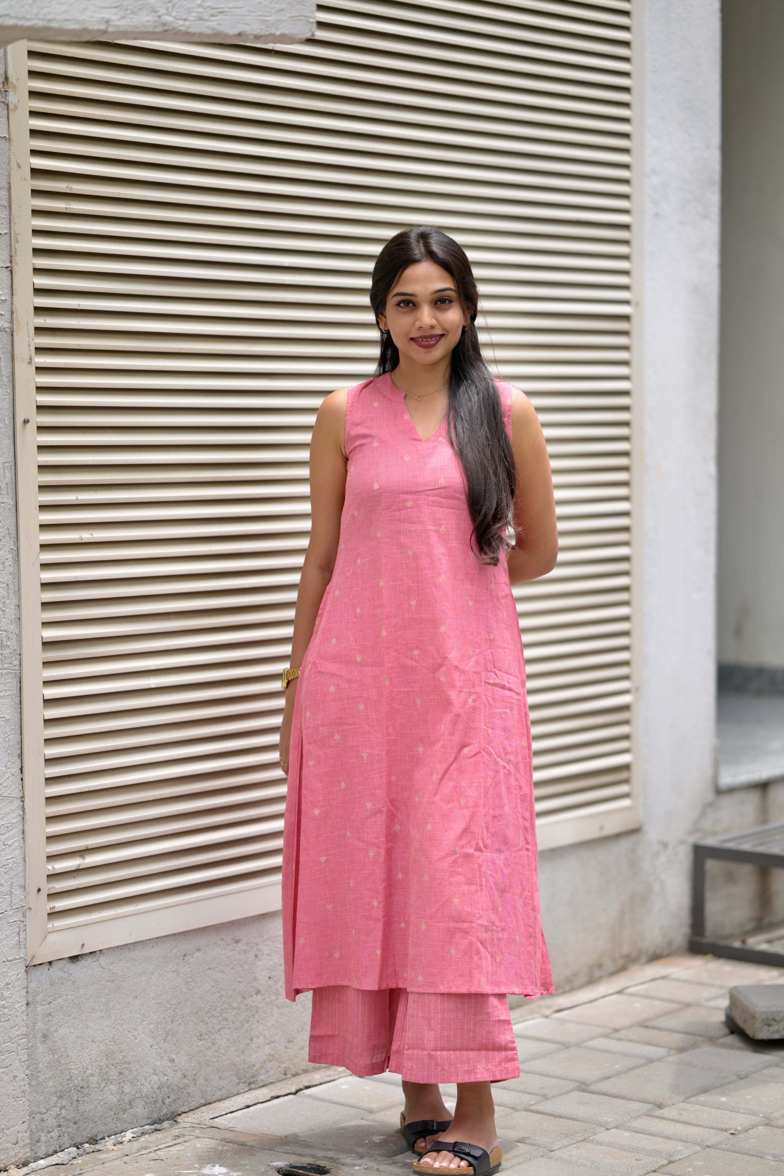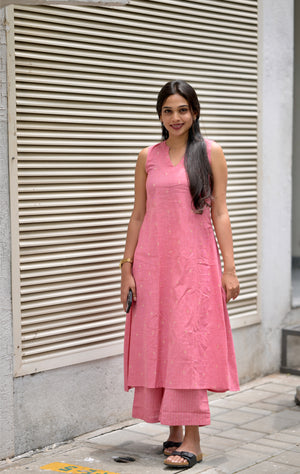- Handloom cotton sleeveless kurta with smart collar neck detailing along with attached 11 inch sleeves inside the kurta along with matching trousers with functional pockets in lotus pink