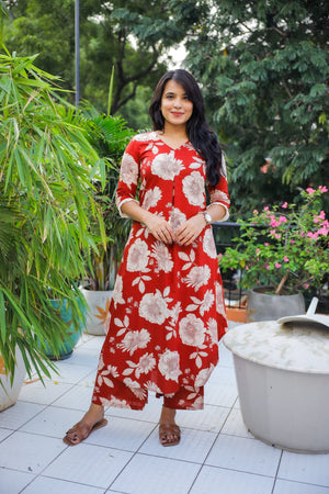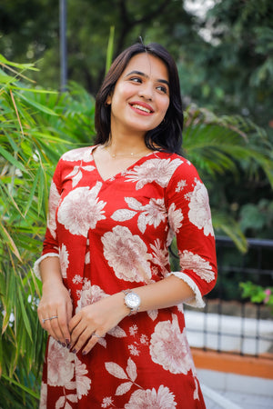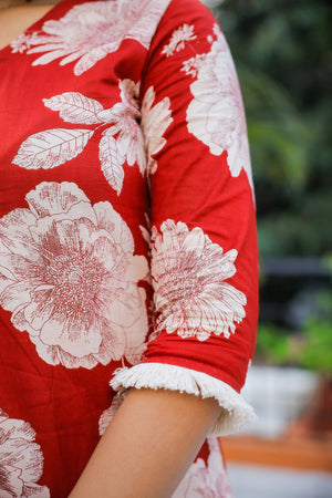 Sreshta - floral hand block printed cotton kurta set in red & white