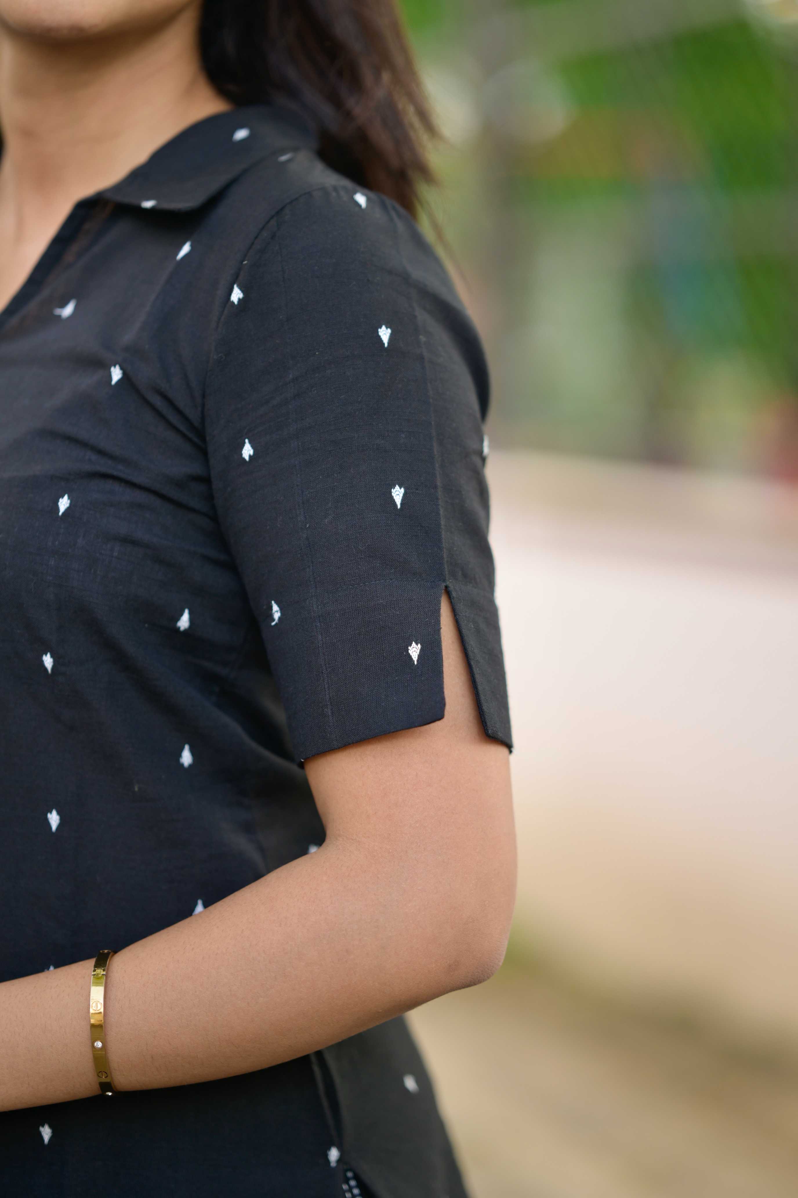 - with smart collar聽 V neck detailing and small buttas all over the top with 11 inch sleeves聽