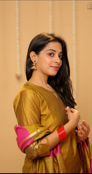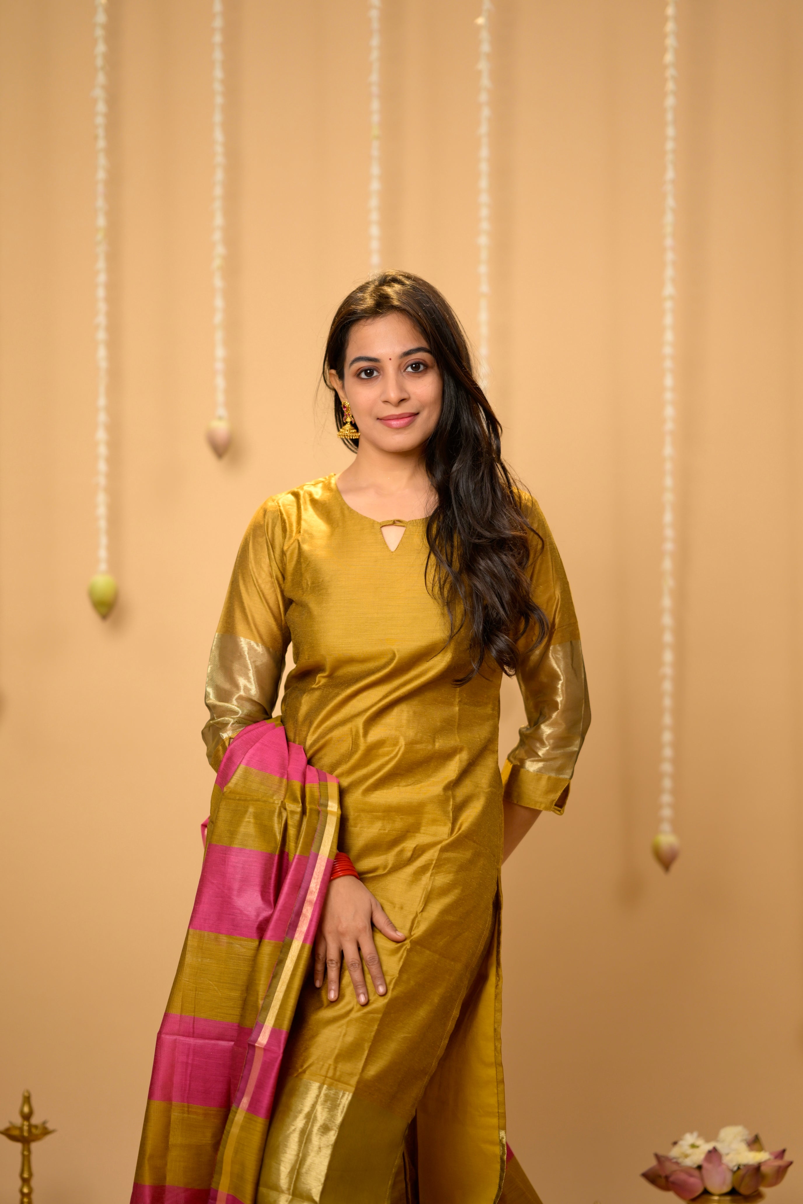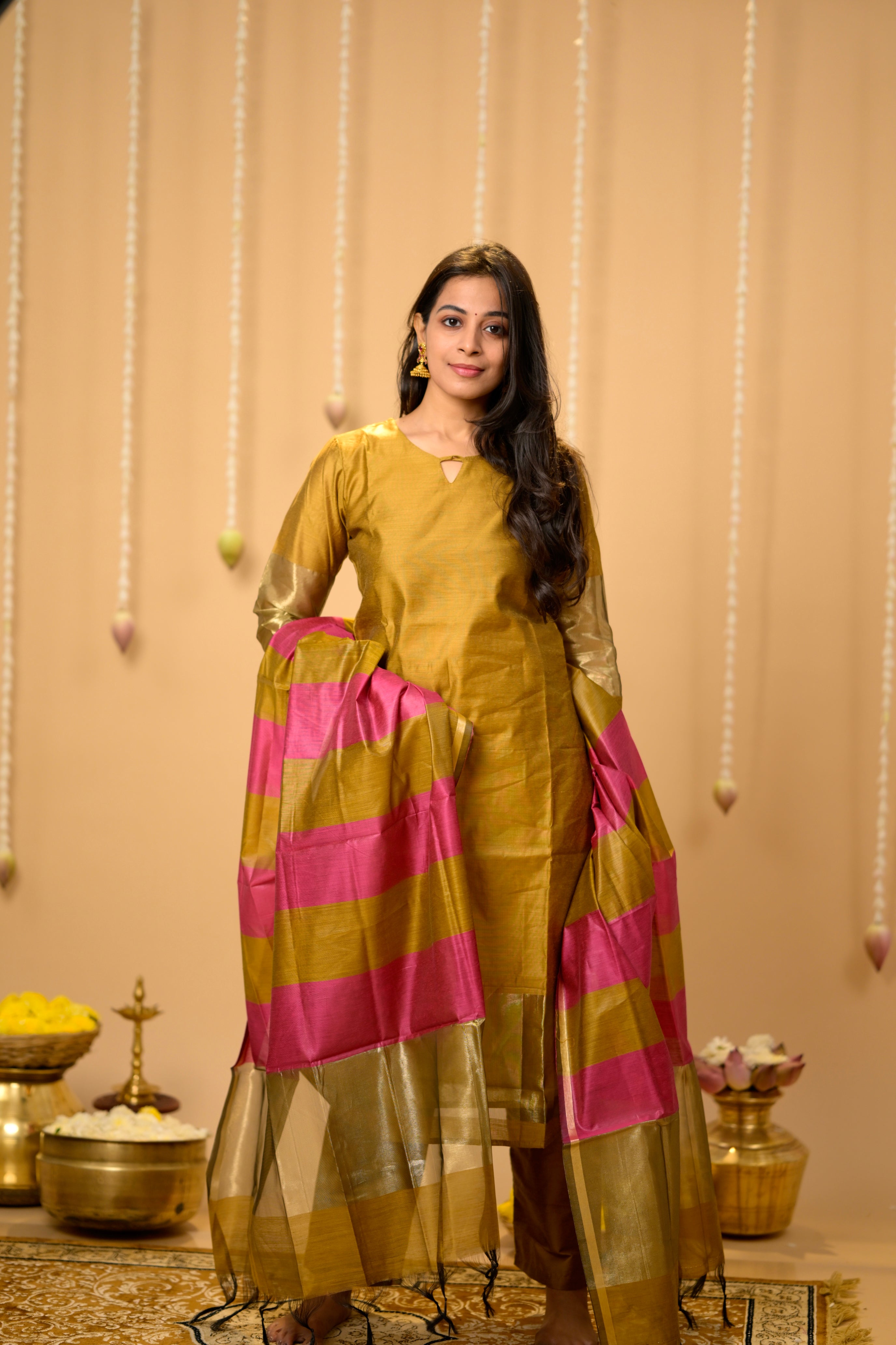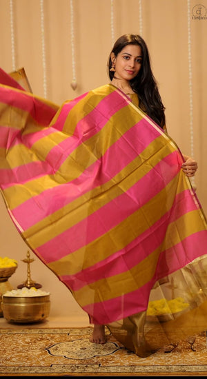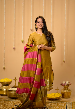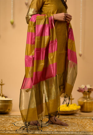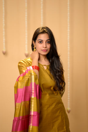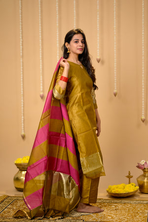 Suhasini (gold ) - semi banarasi silk suit set with striped dupatta in gold and pink