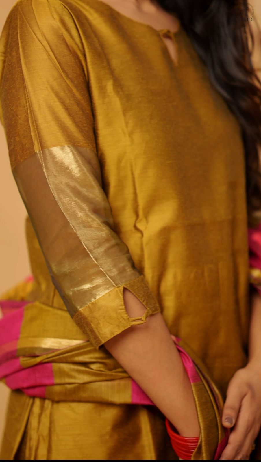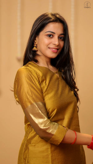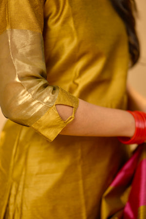 — Semi Banarasi silk suit set with smart sleeves and neckline in gold colour with matching trousers and dupatta in gold and pink striped.