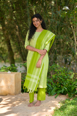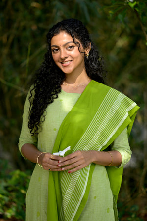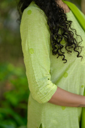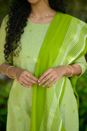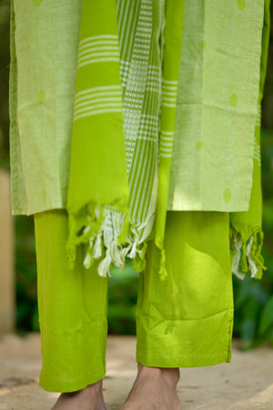 — Handloom cotton suit set with hand woven polka dots all over in a beautiful leaf green colour. Comes with complimenting trousers with functional pockets and matching handloom cotton dupatta.