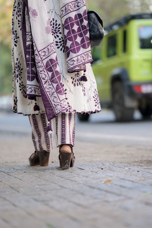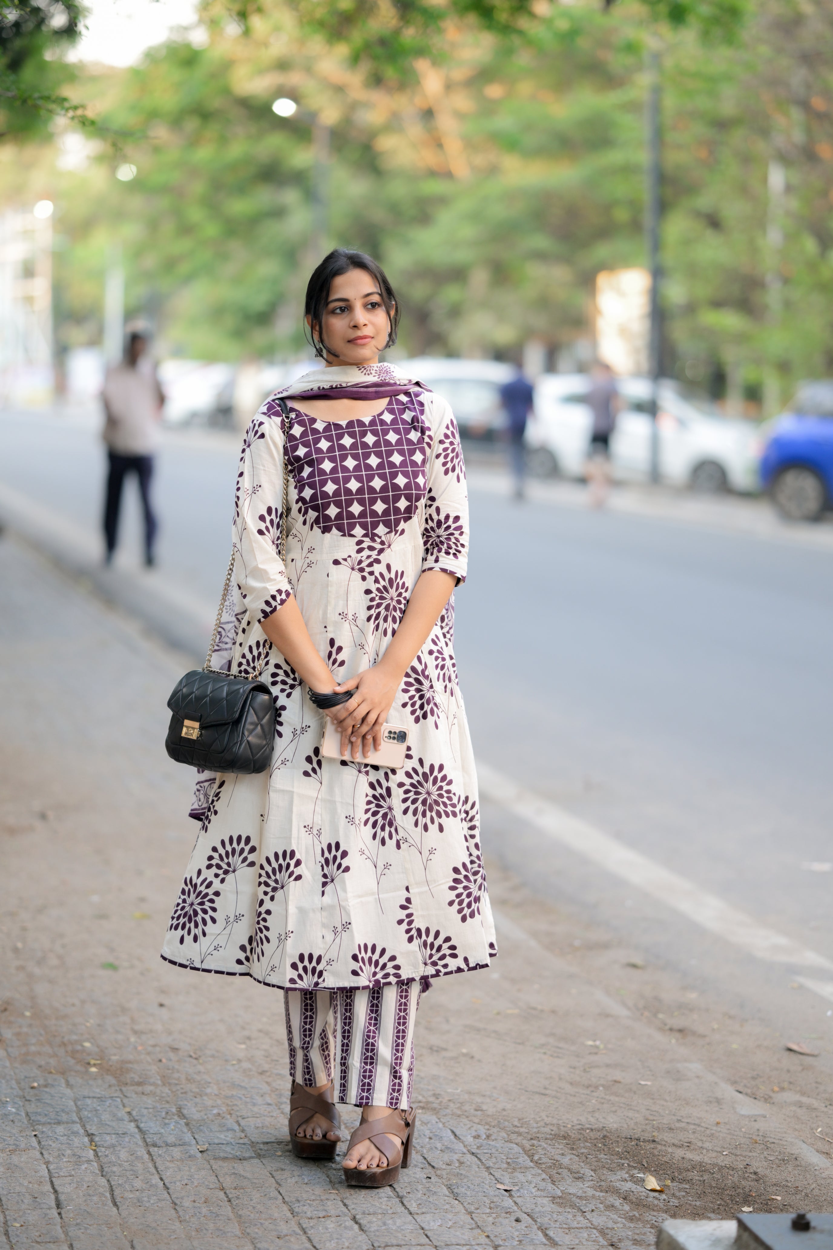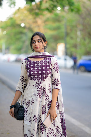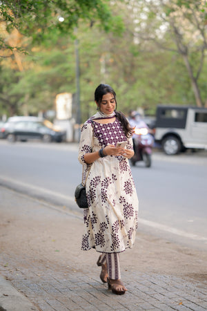Sunainaa - handblock printed anarkali cotton suit set in white and purple colour