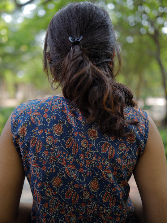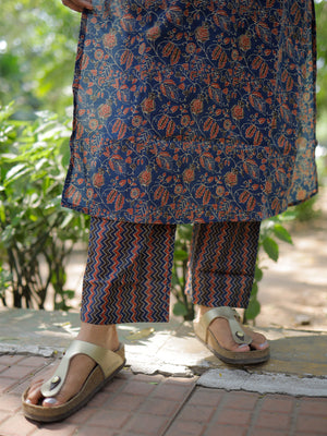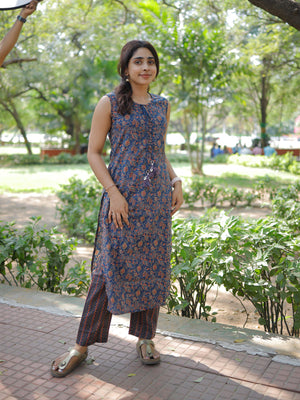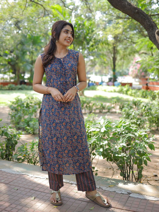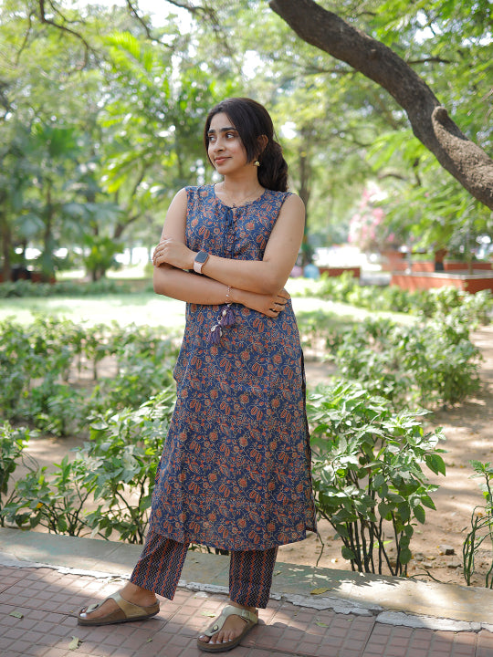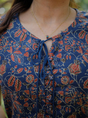 Tanziya - ajrakh handblock printed cotton kurta set in blue and red