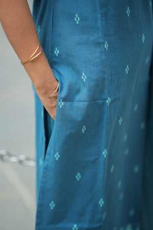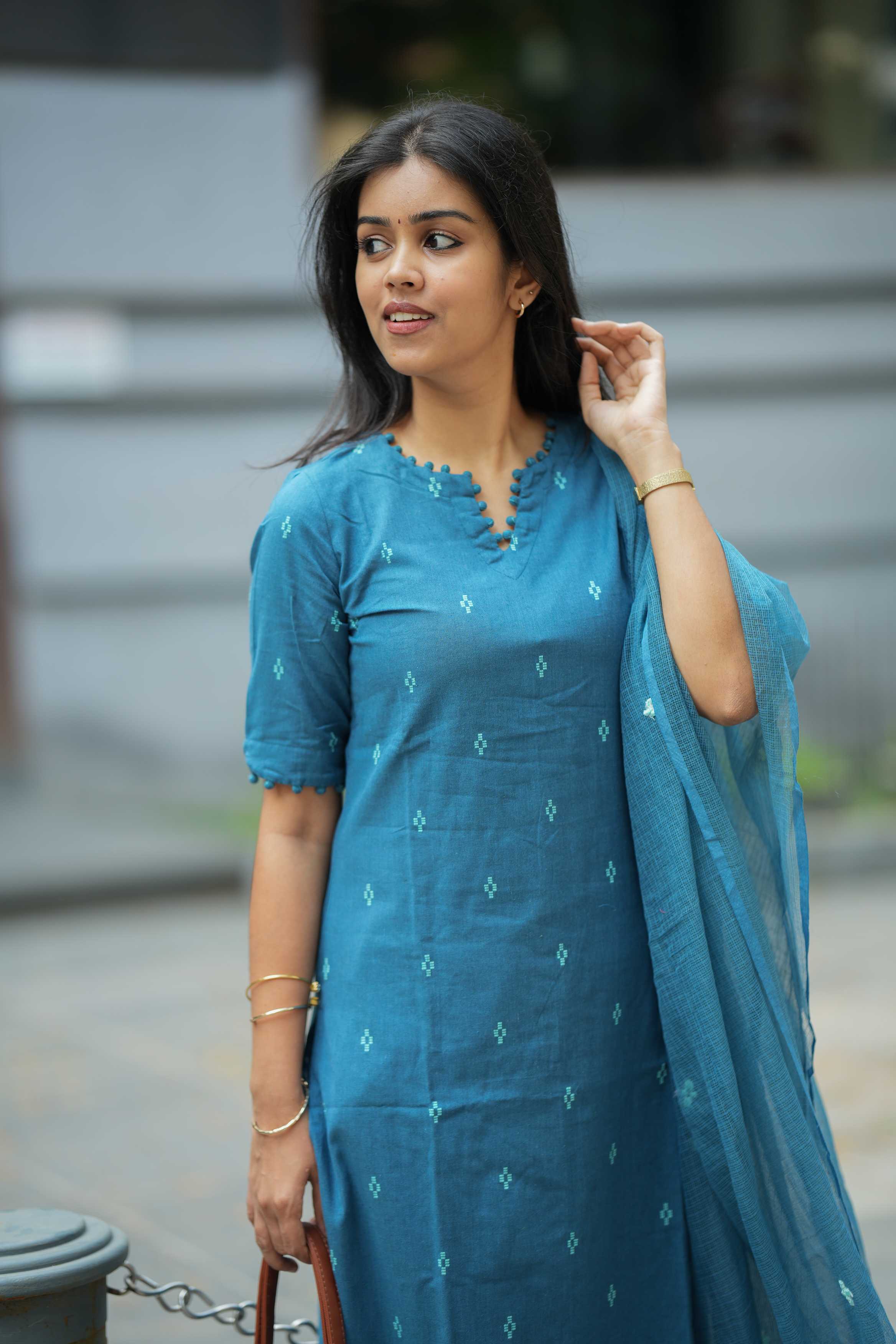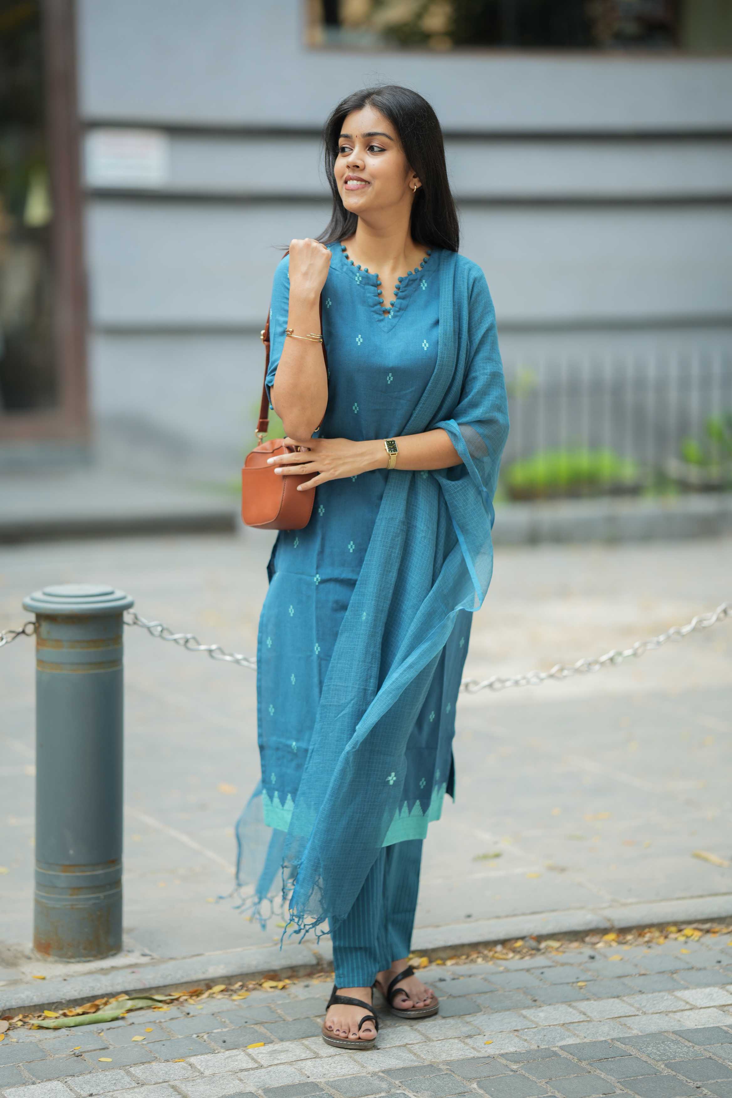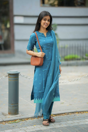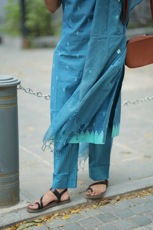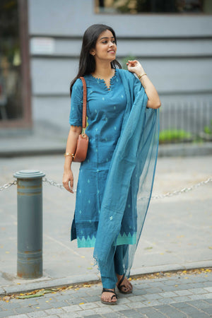 Tarini - handloom cotton suit set with temple borders in blue colour