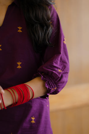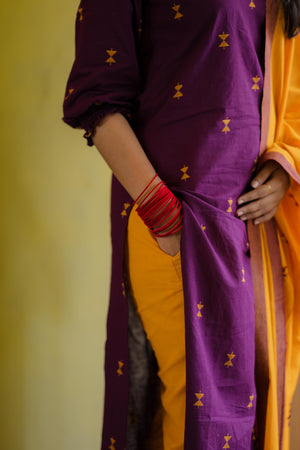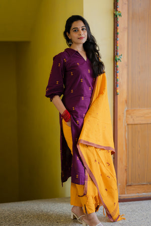 Tharangini - handloom cotton suit set in wine & mango yellow