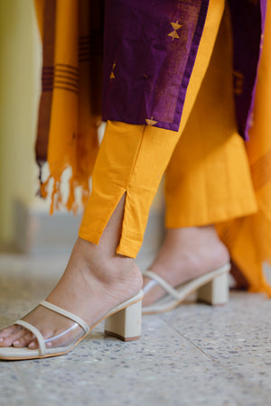 Design : smart collared neck kurta with a smart sleeve detailing with elastic comes with mango yellow trousers with functional pockets and matching handloom cotton dupatta