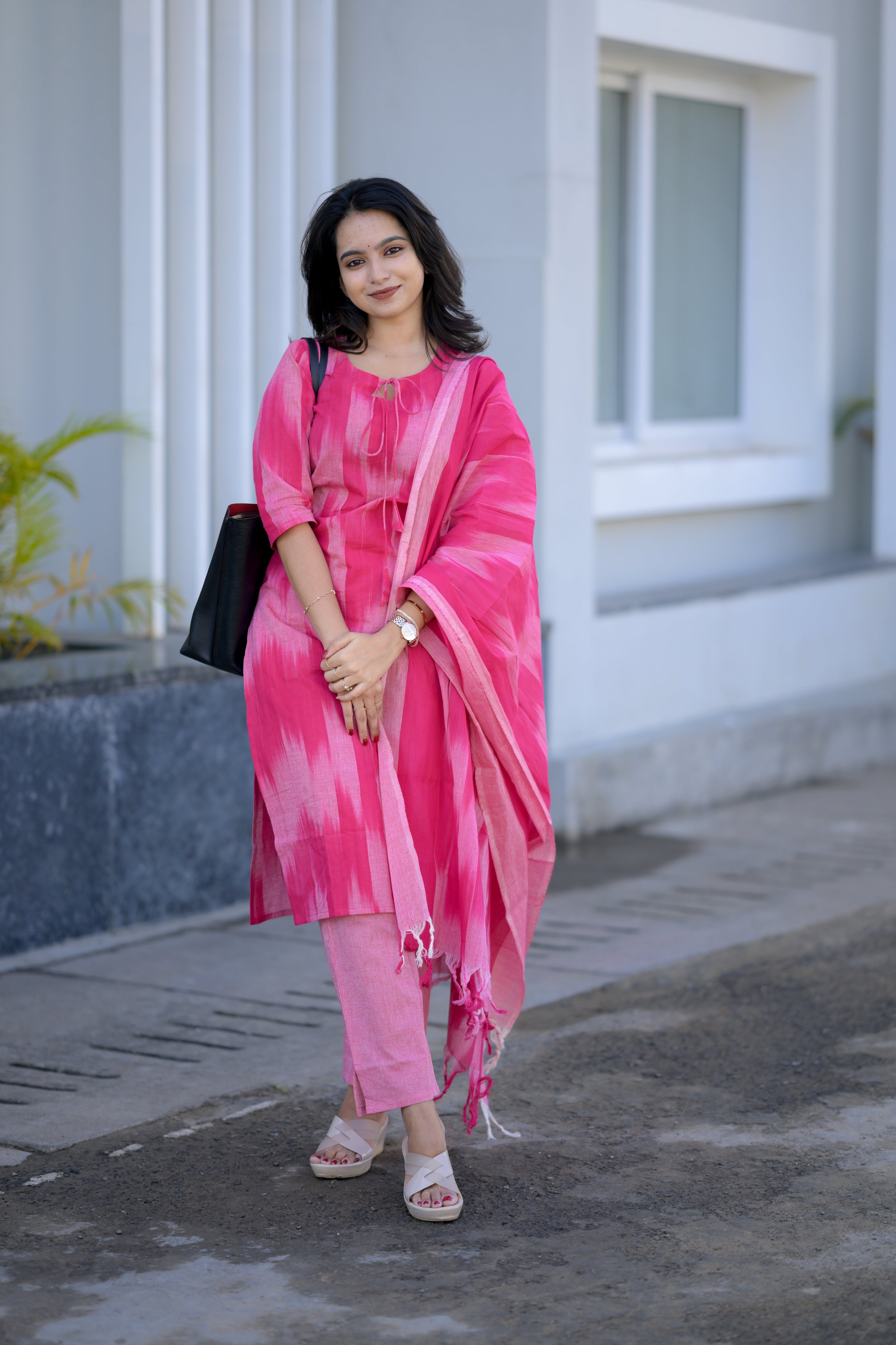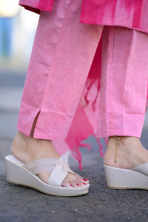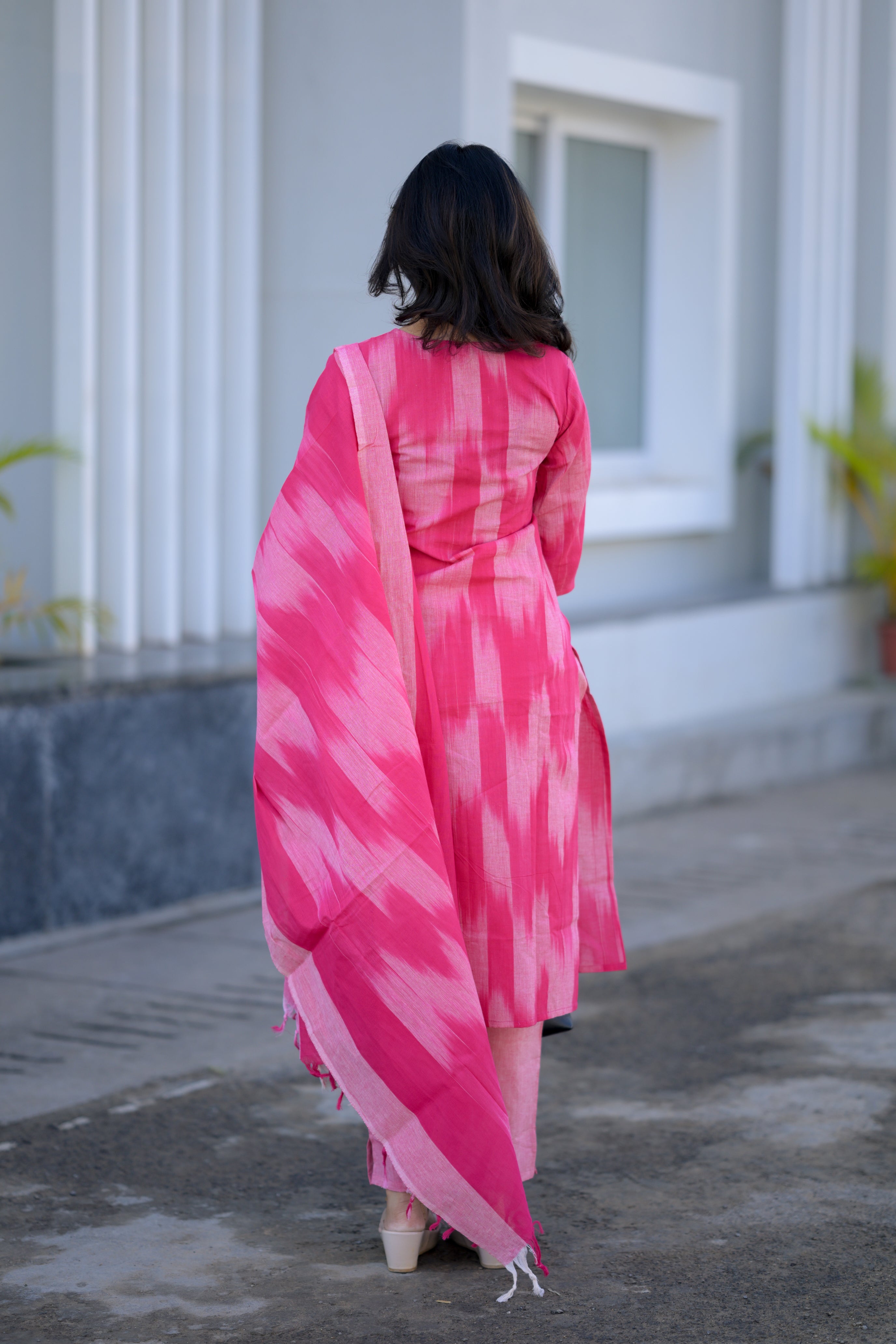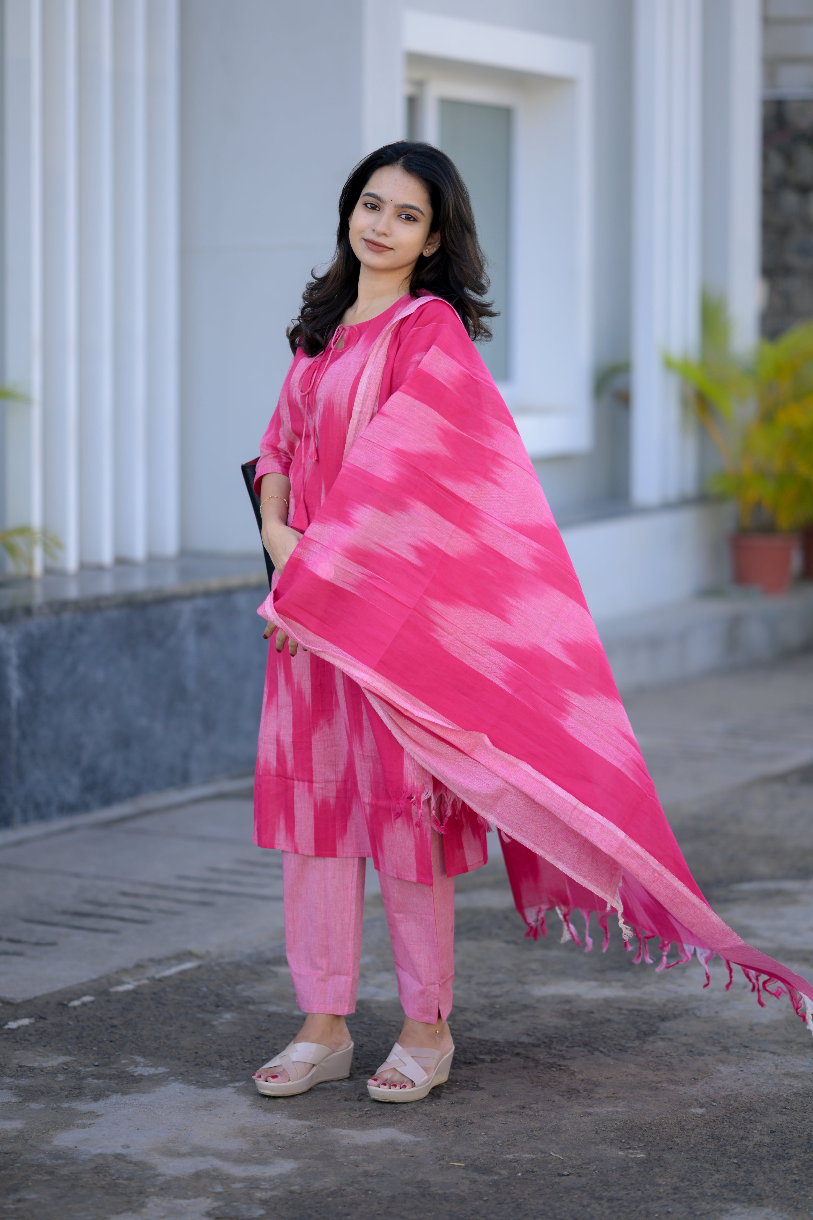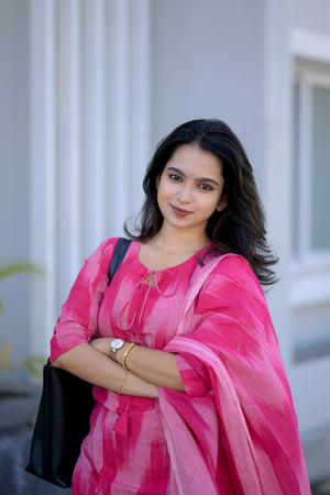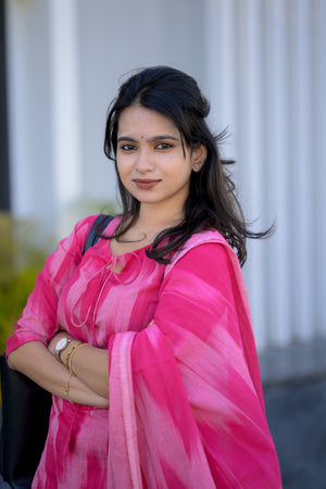 Thendral ( Pink ) - ikkat handloom cotton suit set with dupatta in pink colour