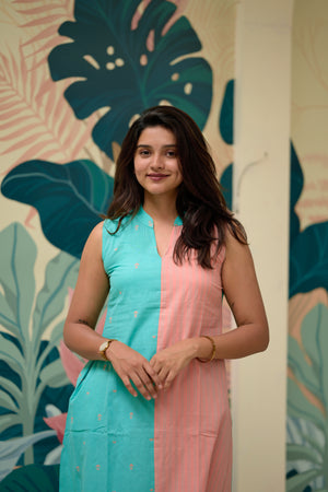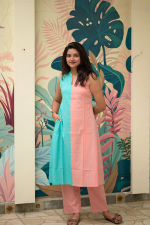 Vamakshi (pastel green ) - Handwoven lines and buttas in handloom cotton kurta set in pastel green and peach